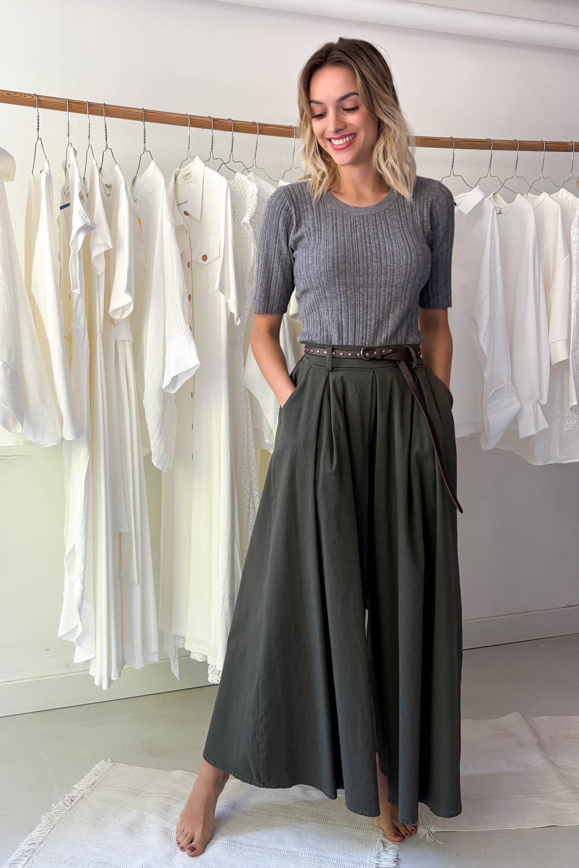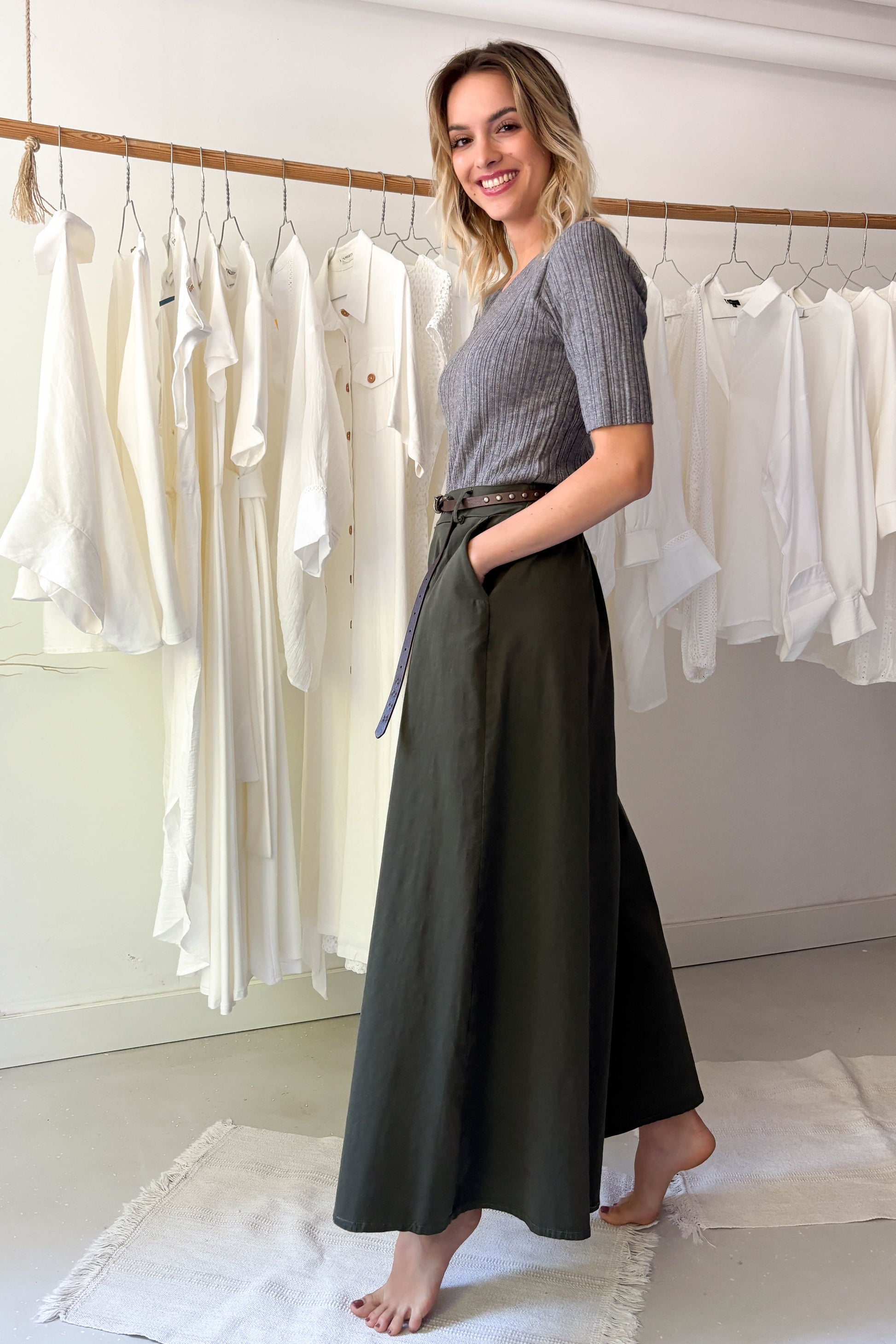 Bővülő szárú, rövidebb fazonú hosszúnadrág khaki színben. Övvel ellátott, zsebes fazon. Derékrészen elől hajtásos, hátul gumírozott szabás.