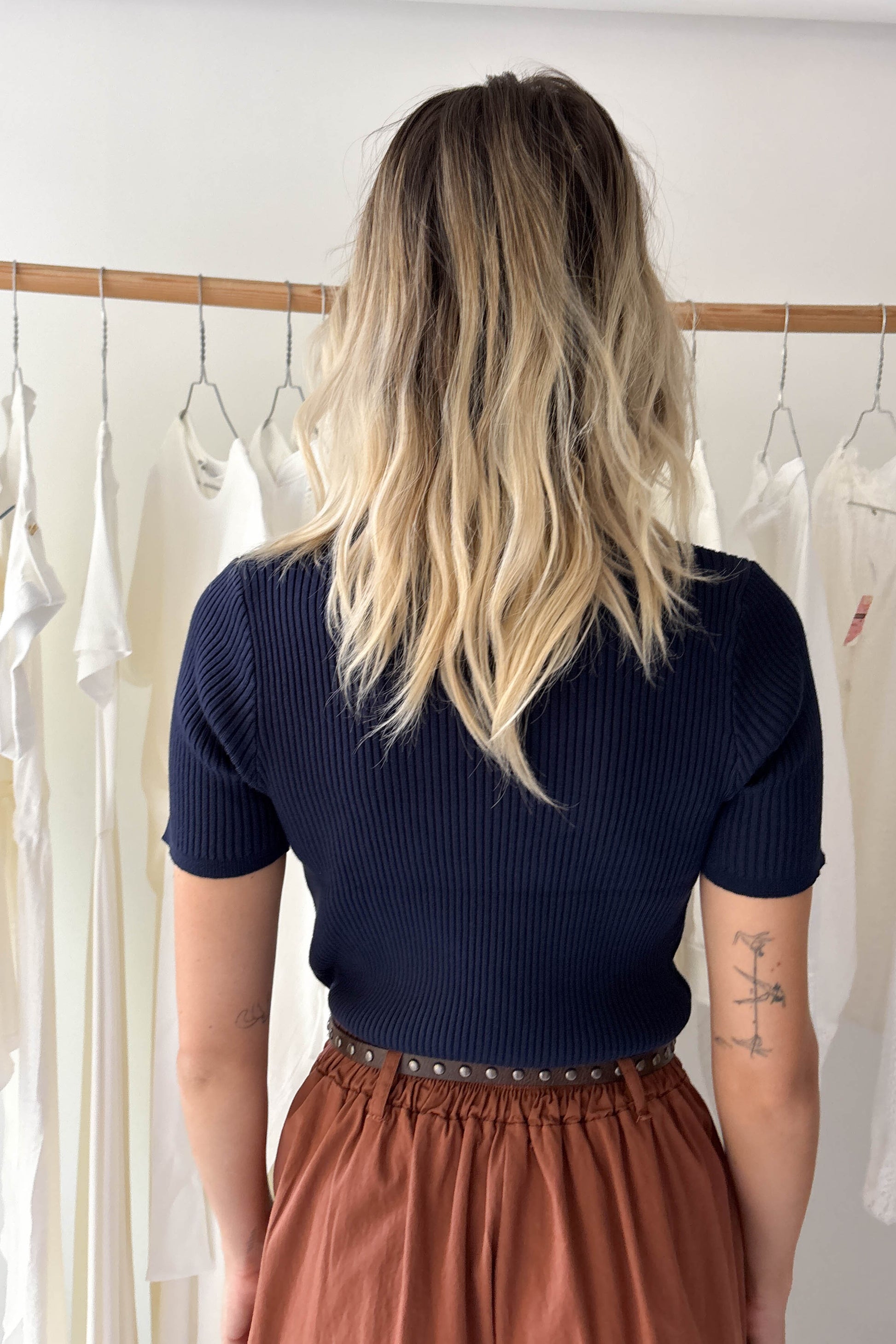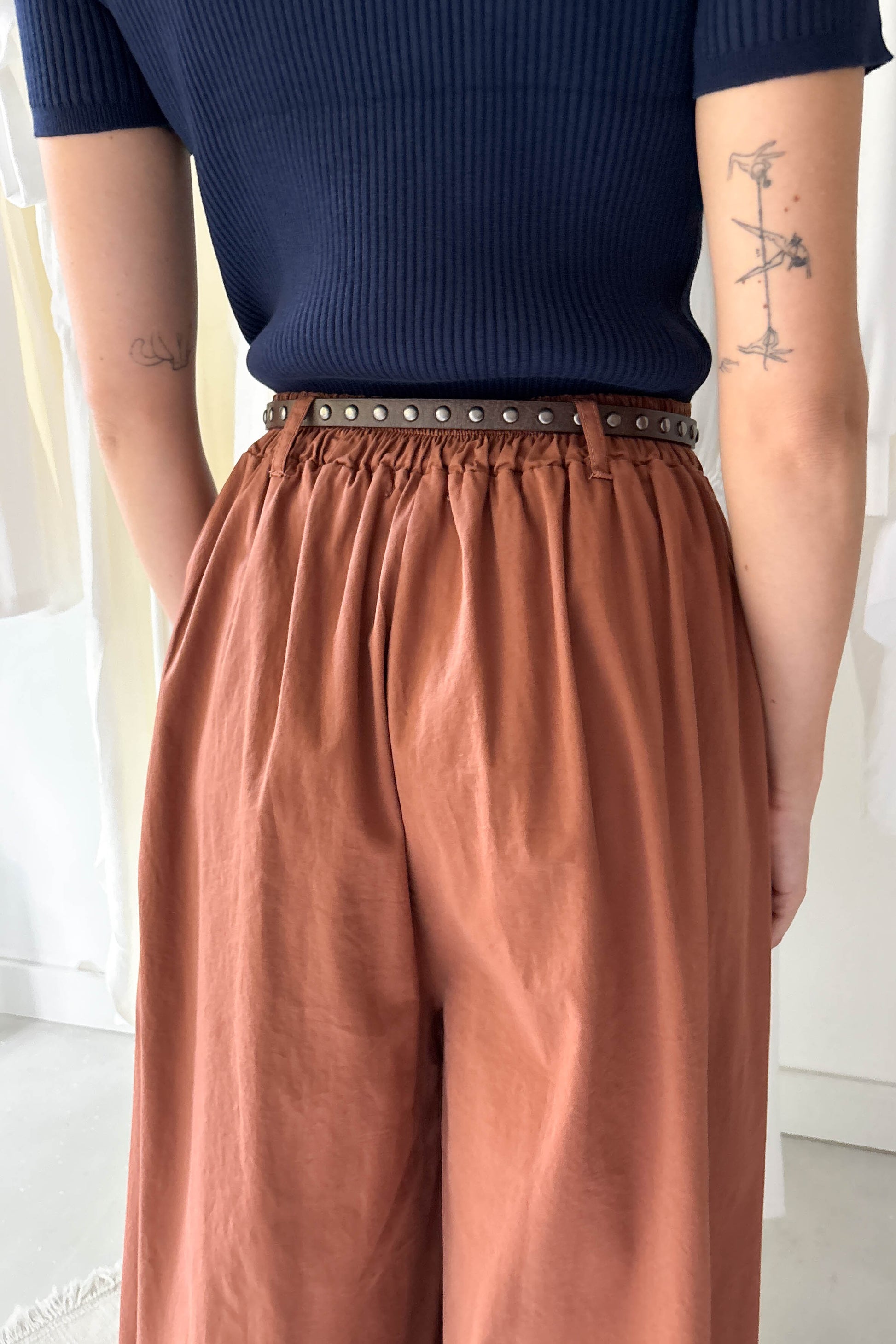 Bővülő szárú, rövidebb fazonú hosszúnadrág terrakotta színben. Övvel ellátott, zsebes fazon. Derékrészen elől hajtásos, hátul gumírozott szabás.