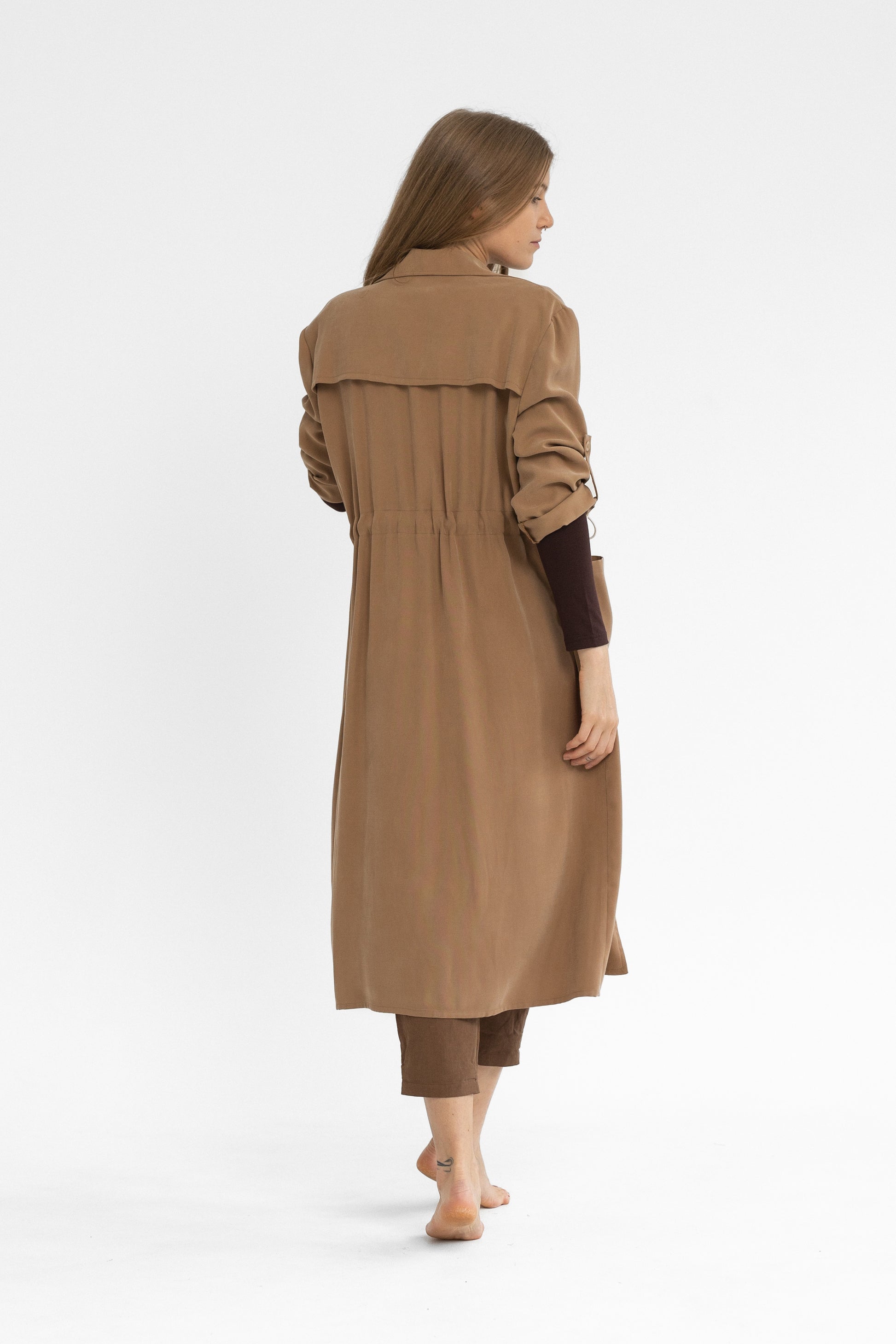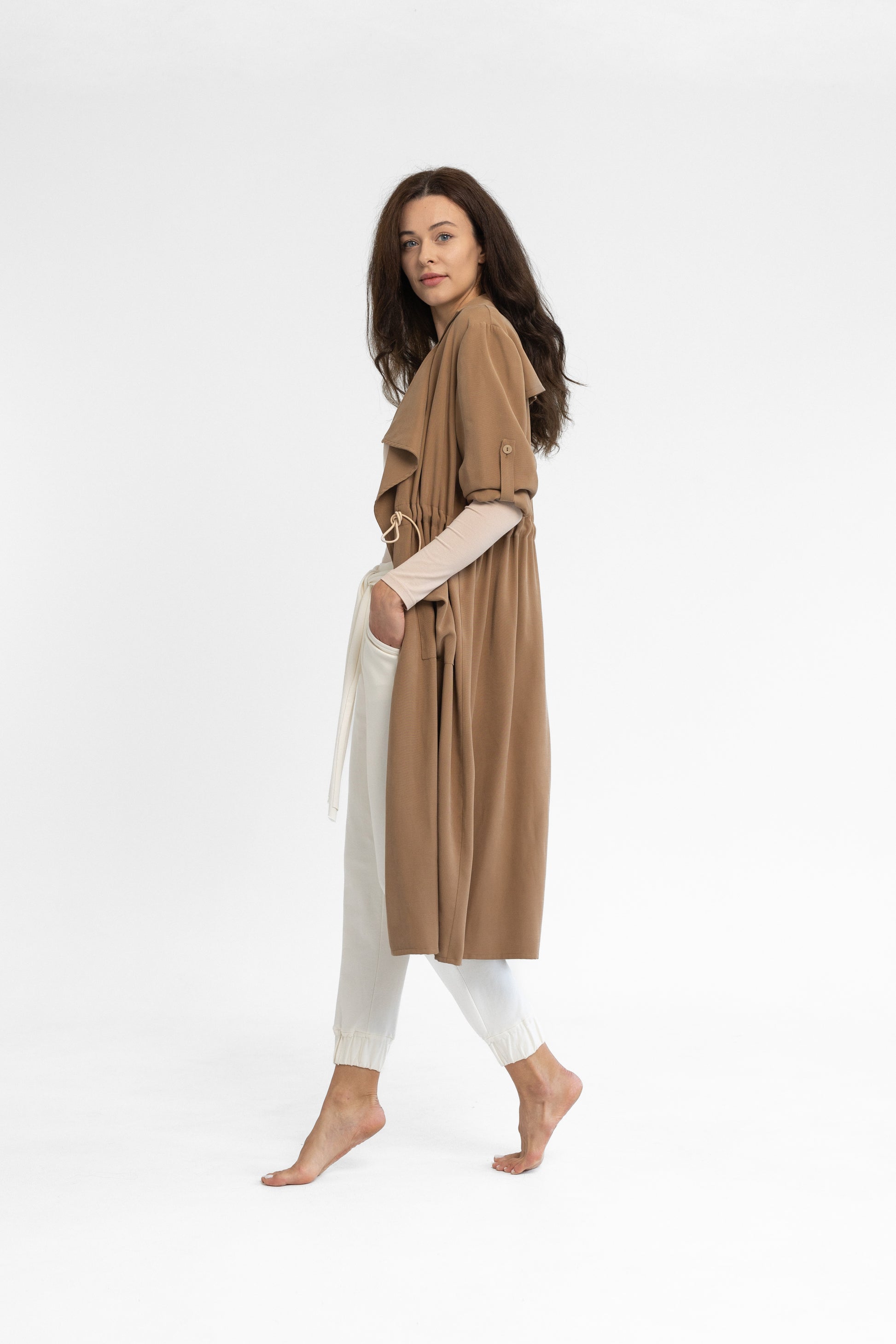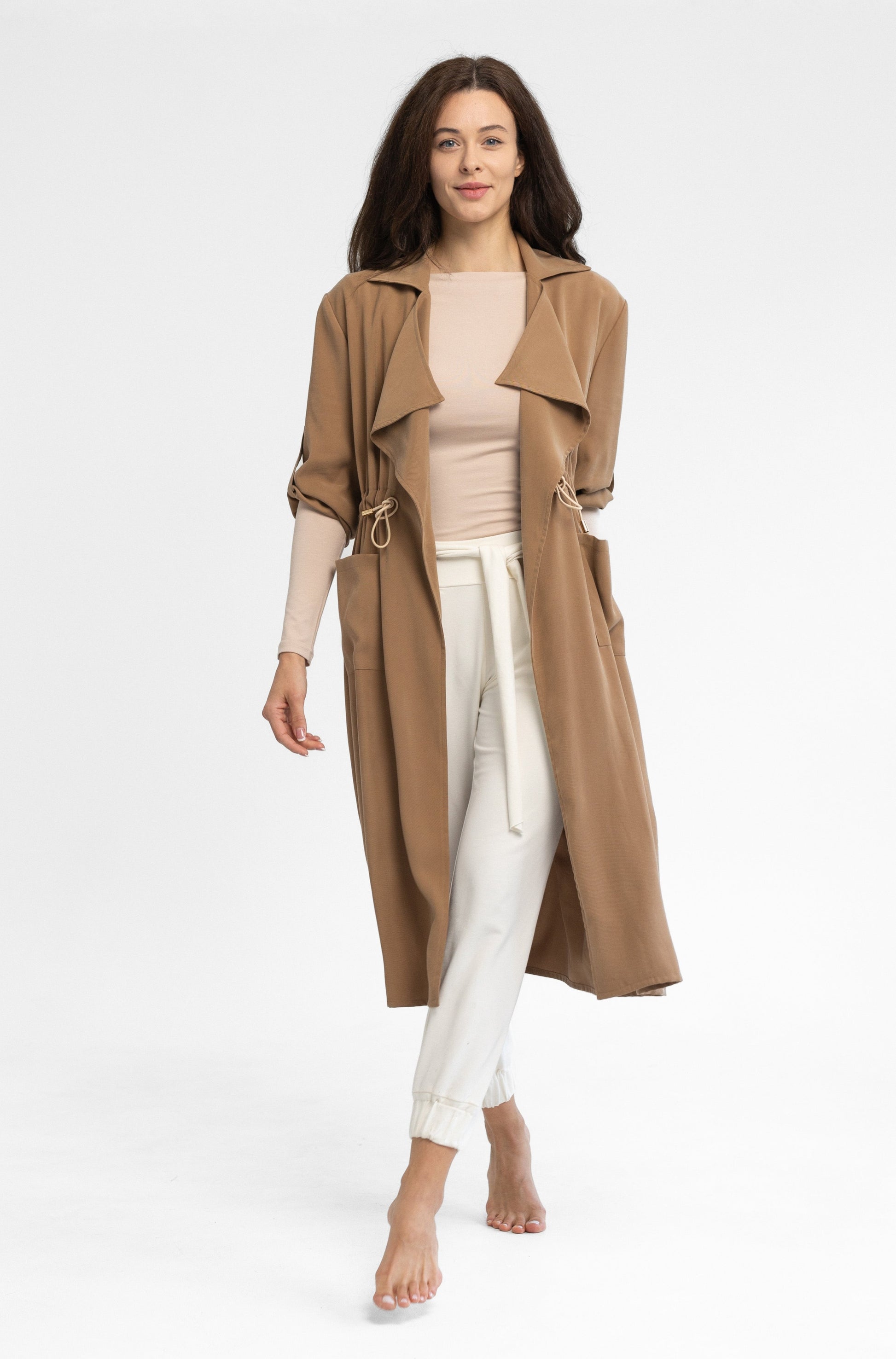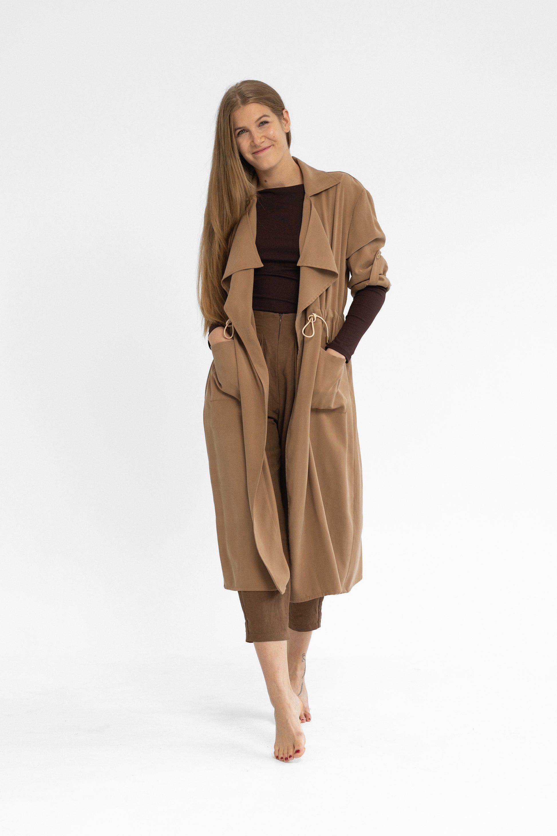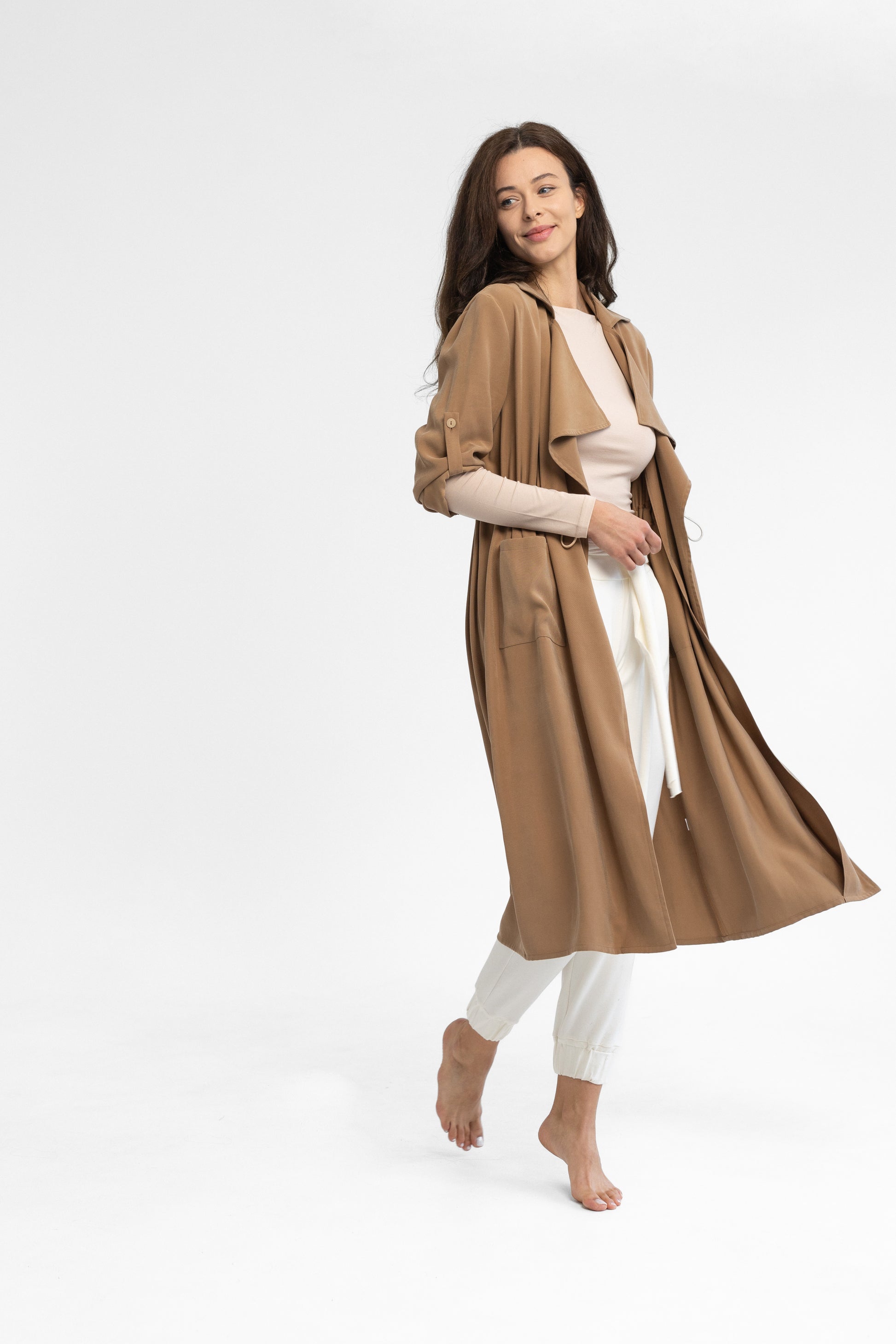 Lenge, köpeny szabású kabát, derekán behúzóval.
