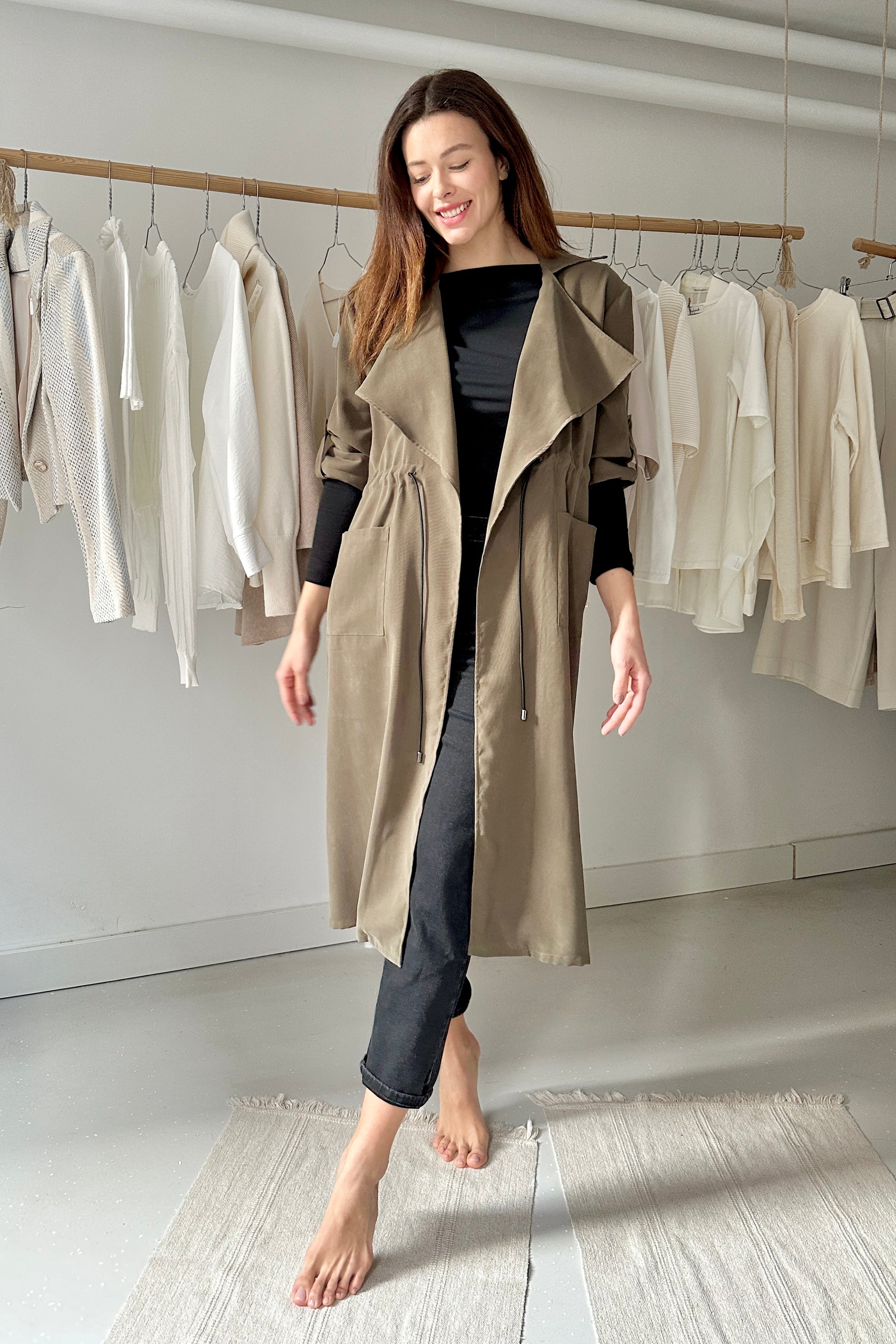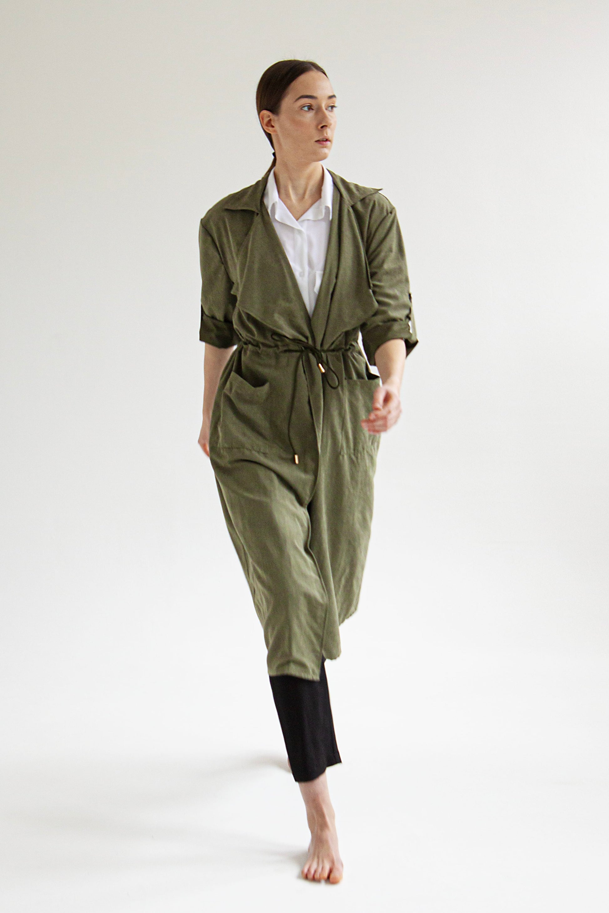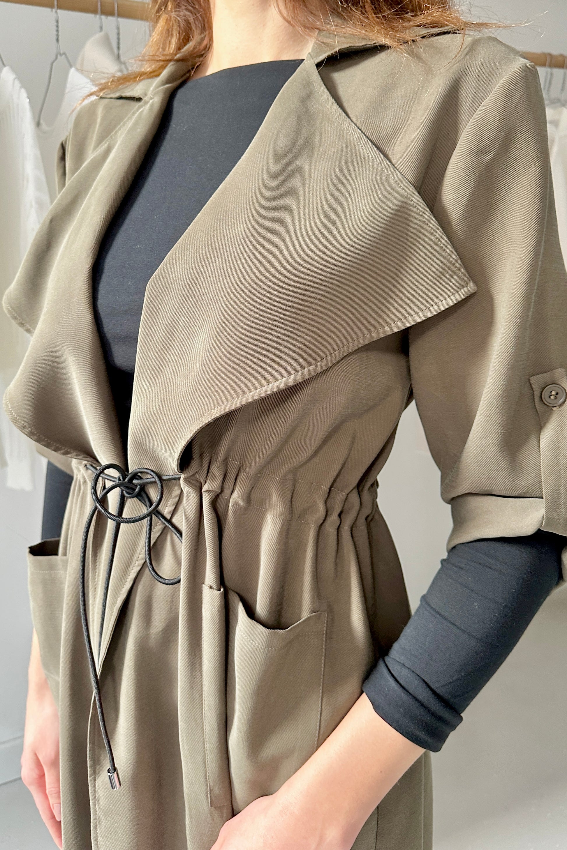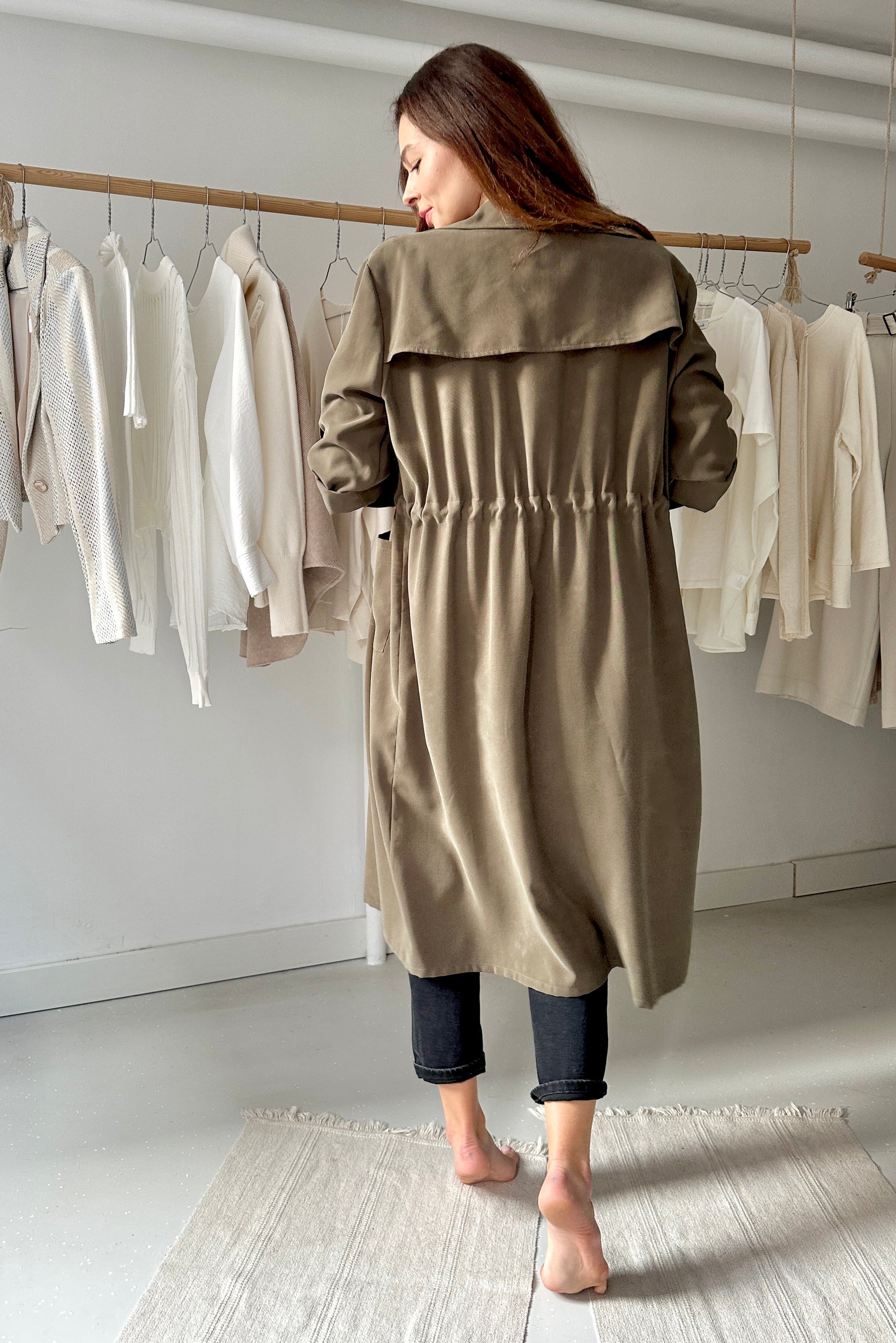 Lenge, köpeny szabású kabát, derekán behúzóval.