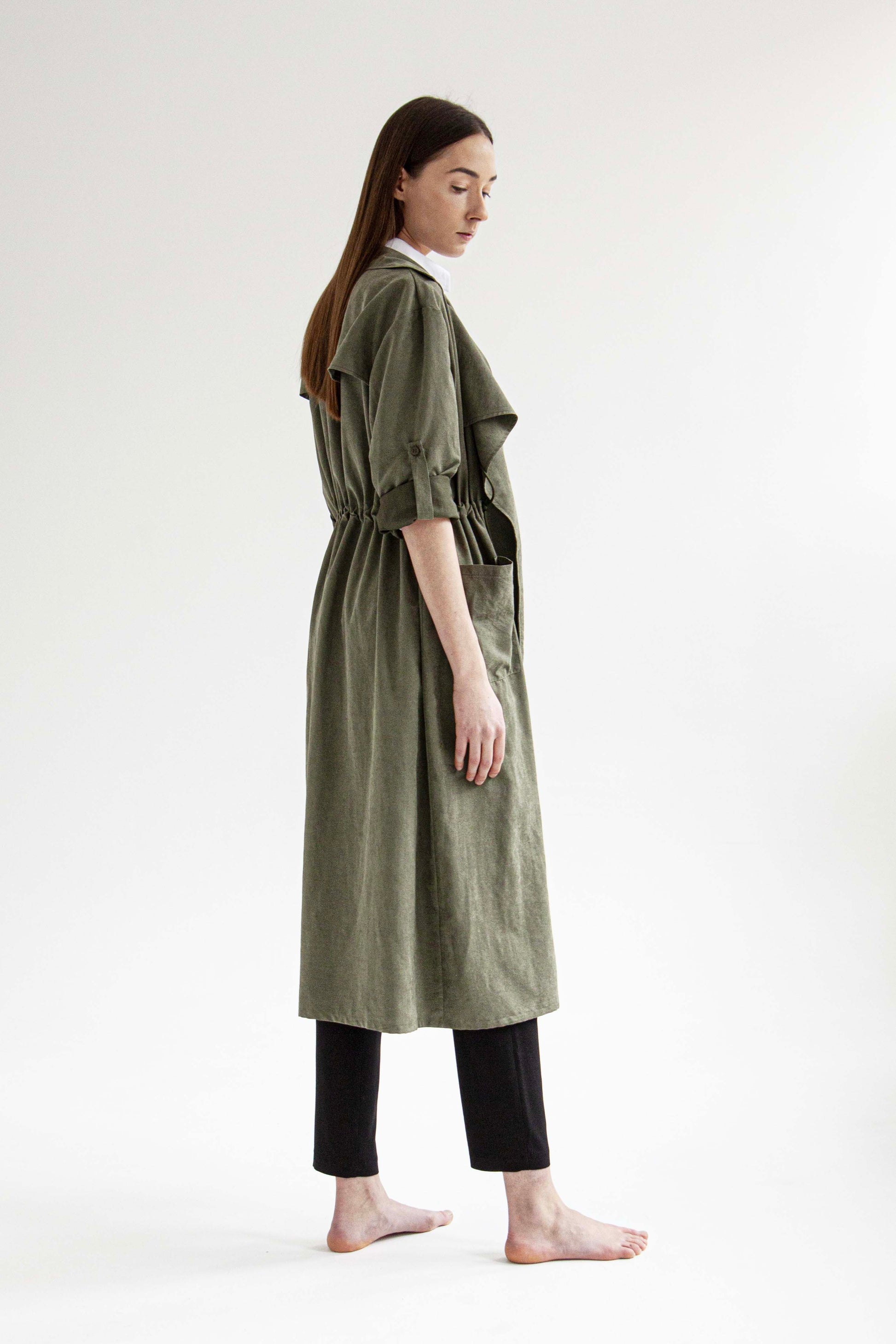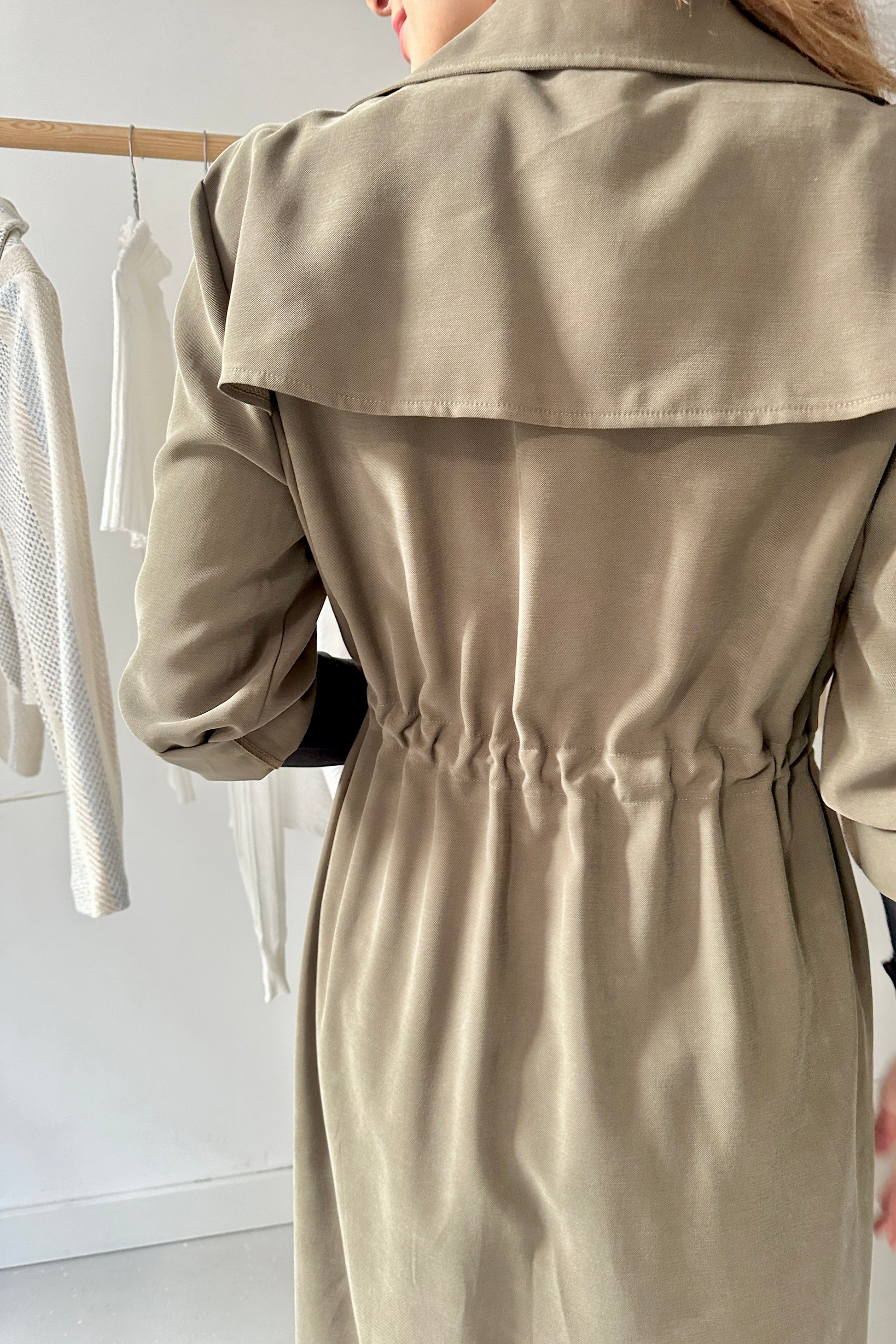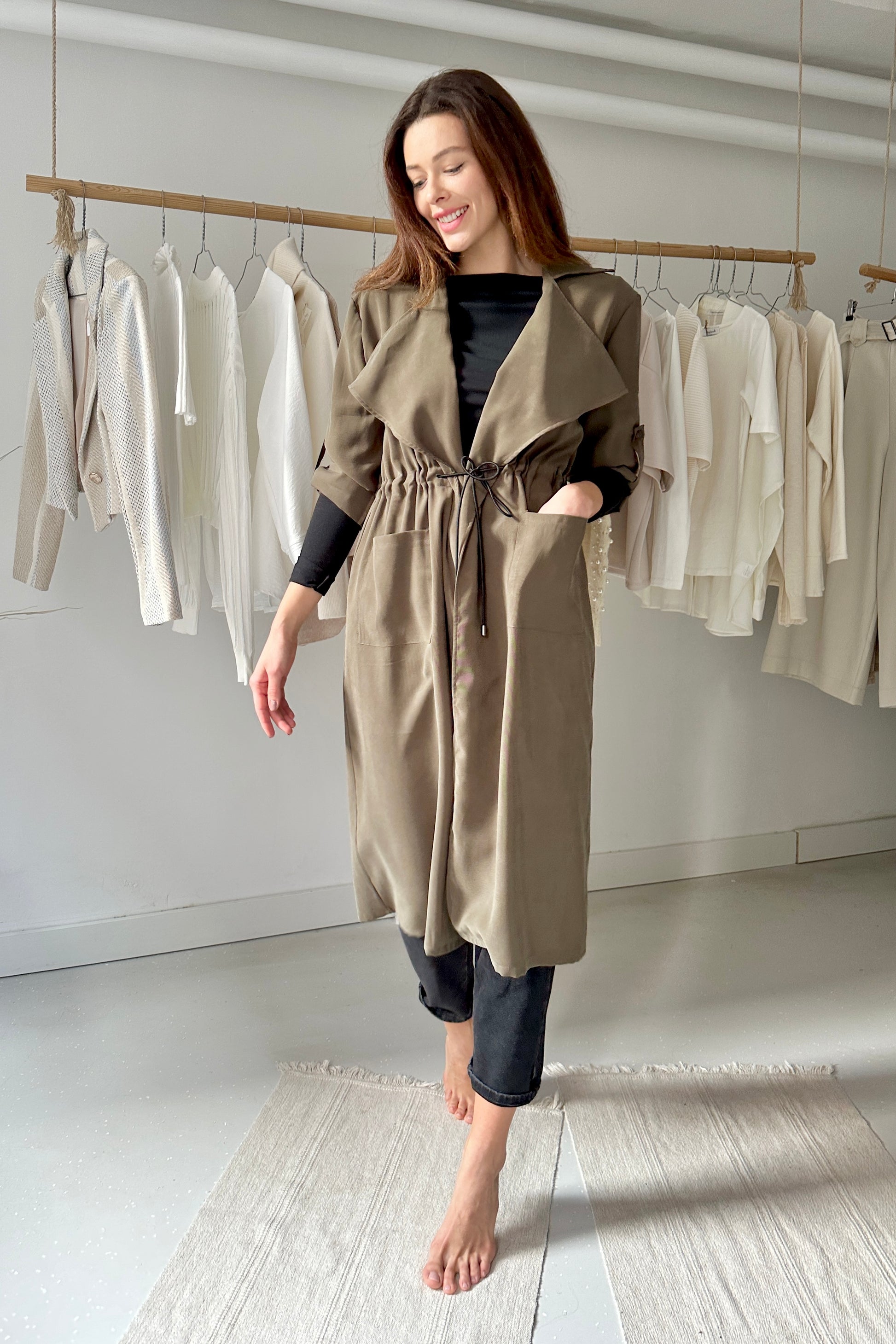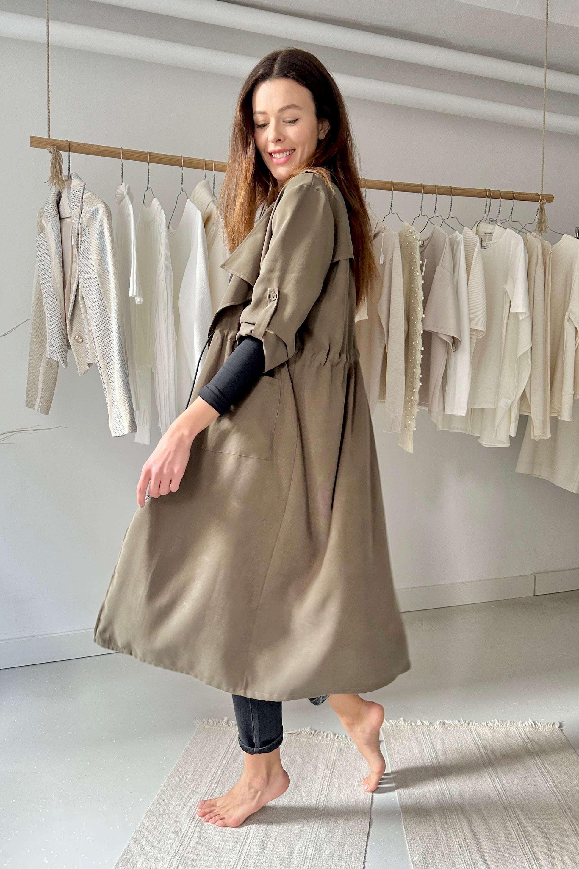 Lenge, köpeny szabású kabát, derekán behúzóval.