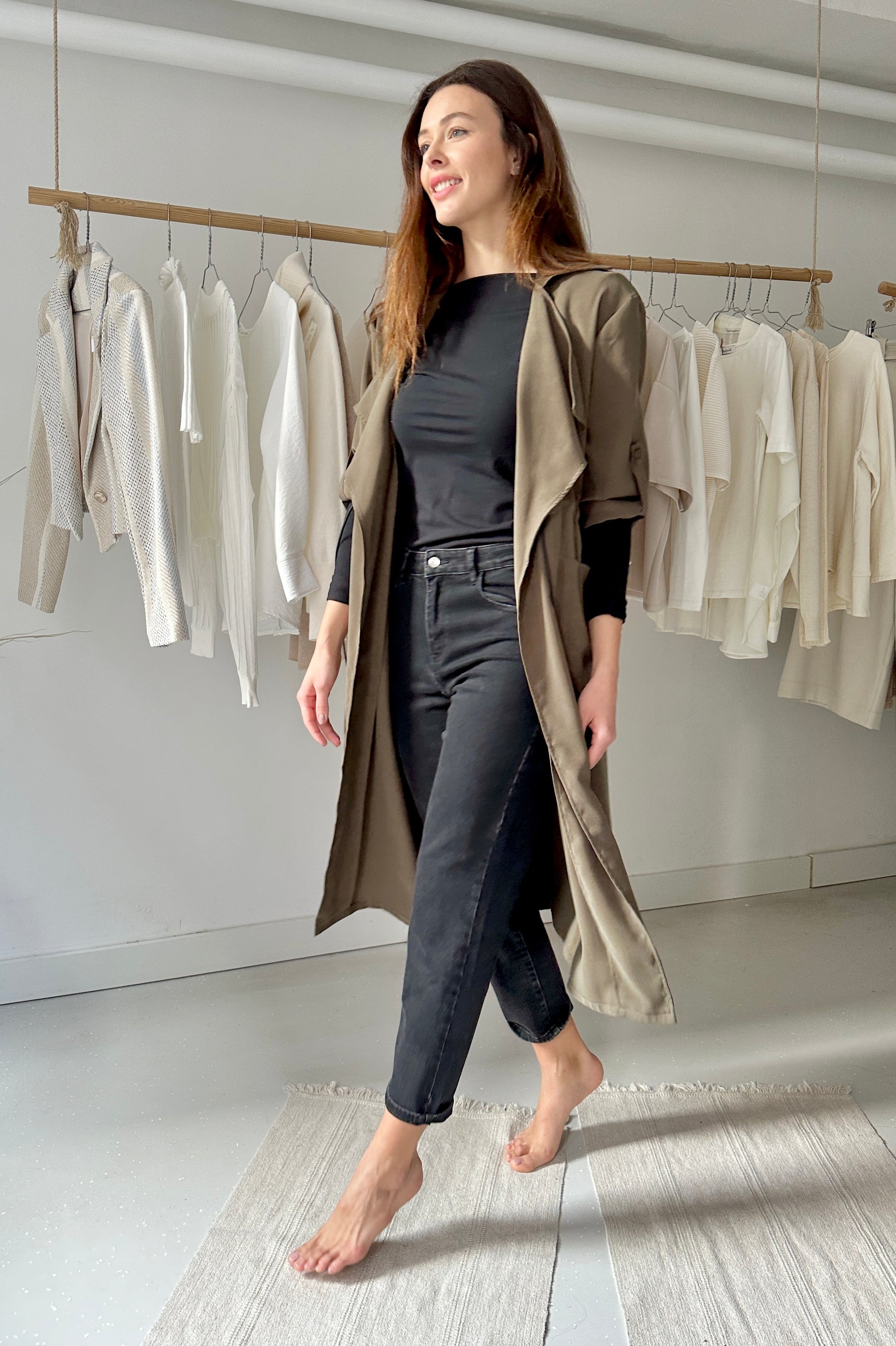 100 % viszkóz - természetes szál, prémium minőségű anyag, elasztánt nem tartalmaz. Vedd fel tavasszal és kora ősszel vékony kabátként, a hűvösebb időkben pedig hosszított blézerként, akár télikabát alá is. Jelenleg egy méretben gyártjuk, bő szabásának köszönhetőrn 34-től 42-es konfekcióméretig tökéletes. Gépben mosható 30 fokon, javasoljuk, hogy az öv kis “végzáróit” vedd le mosás előtt. A modell 177 cm magas.