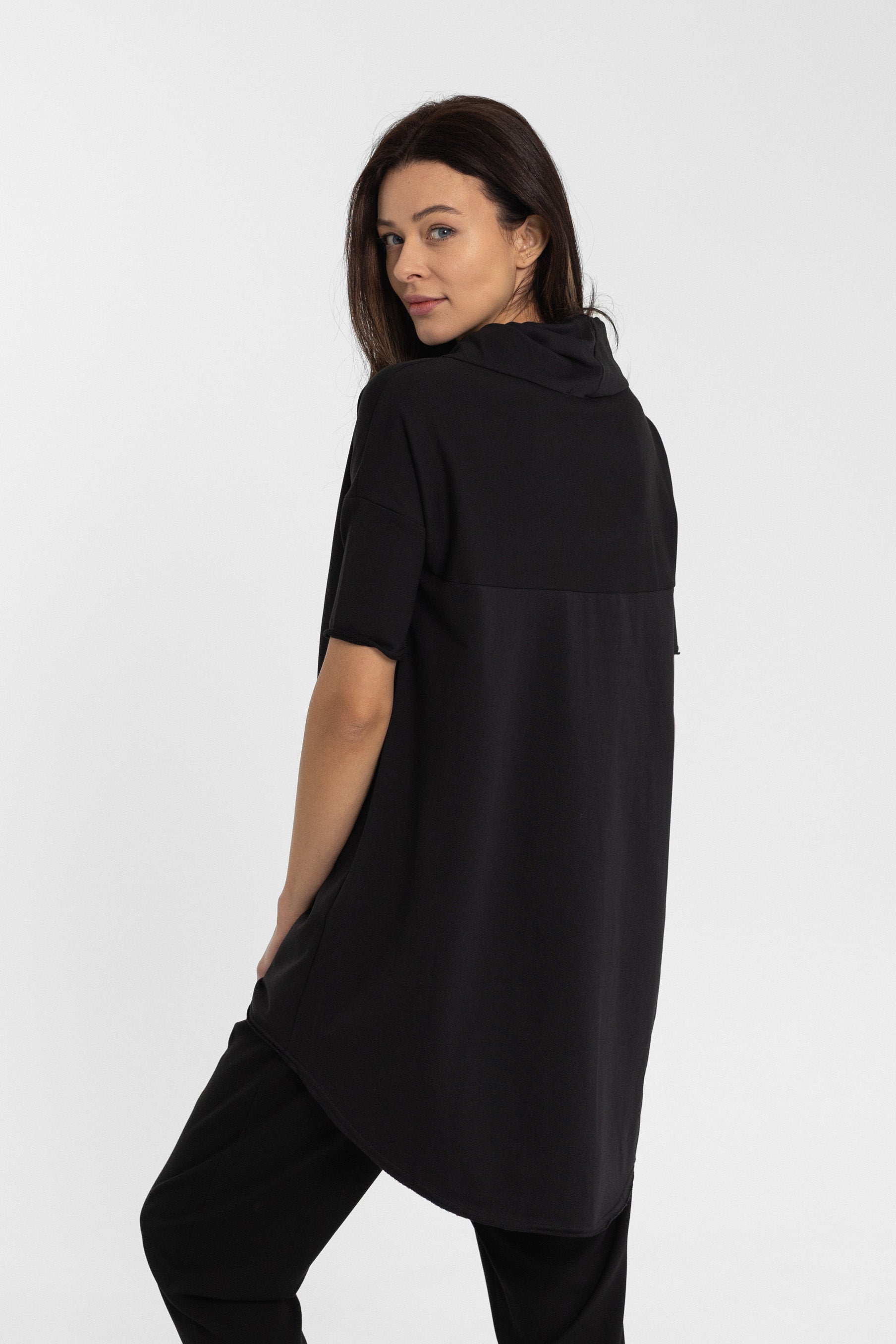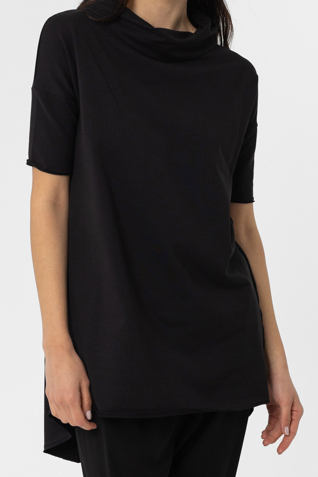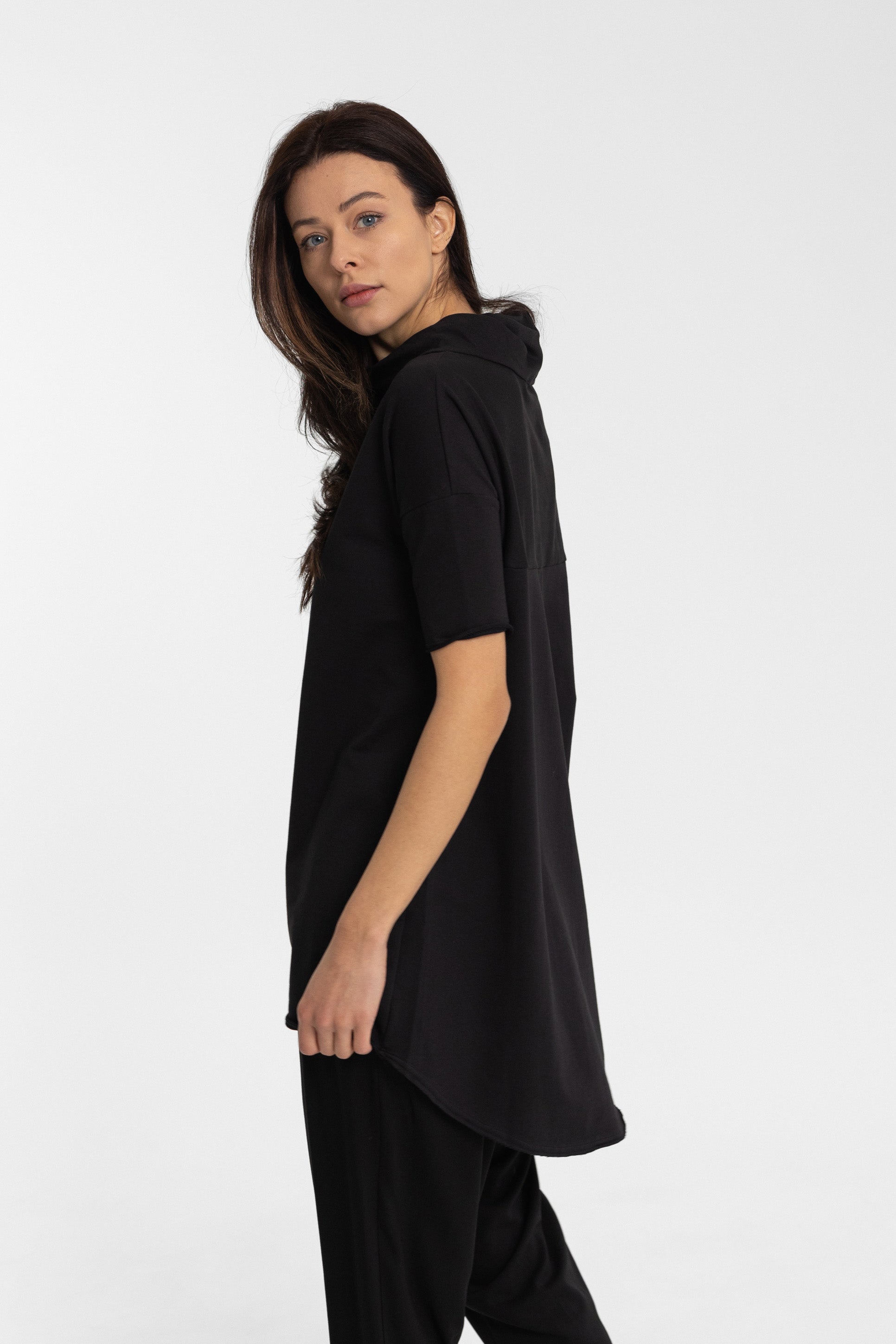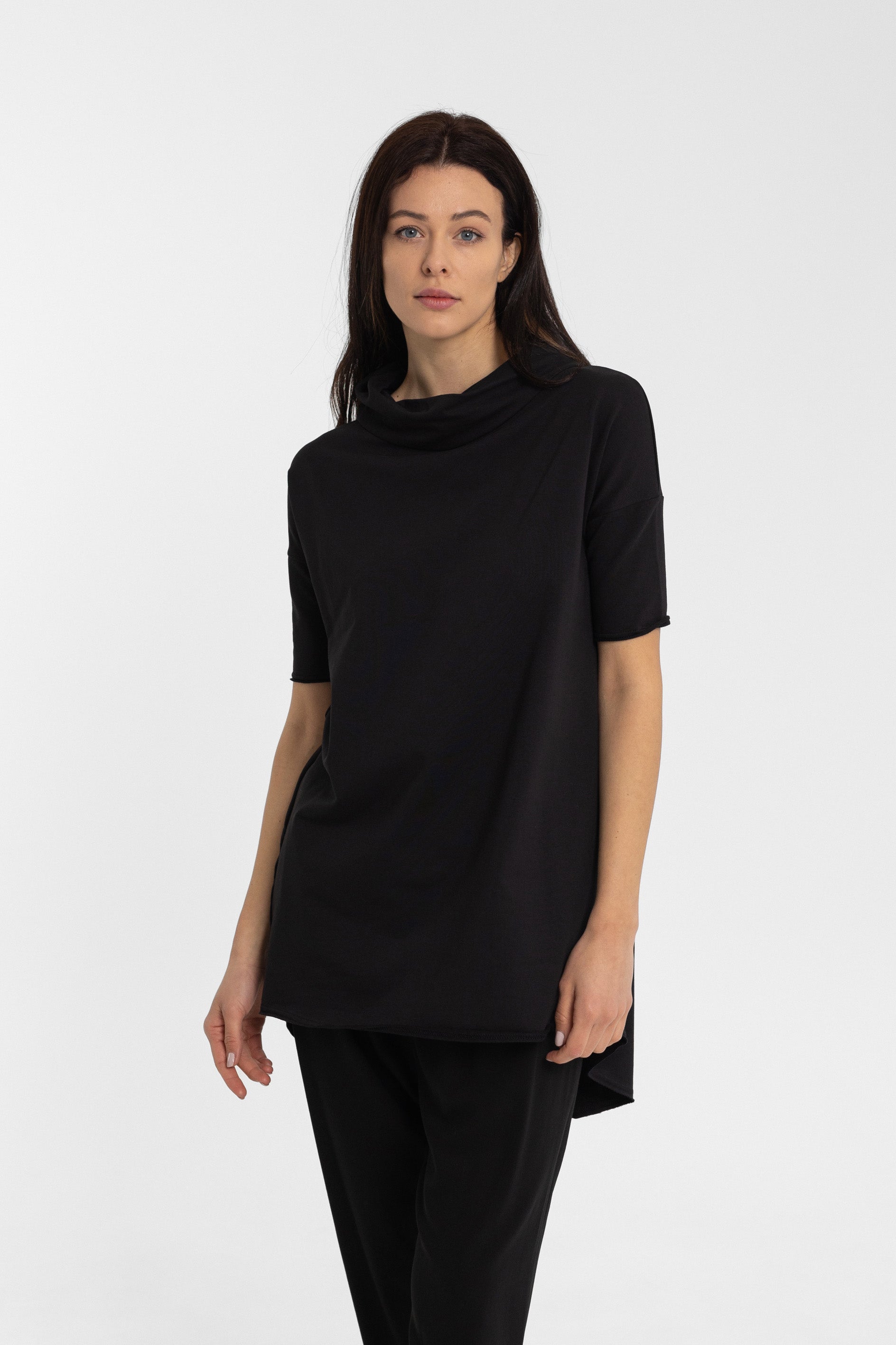 95 % pamut 5% elasztán – futter. Prémium minőségű természetes anyag, elasztikus, kívül sima, belül hurkolt szövet. Csavart nyakmegoldsáért, kényelmes laza fazonáért imádjuk. Elöl rövidebb, hátul hosszabb fazon, mely a mell vonalától lefelé enyhén bővül. Ujja a felkart takarja. Gépben 30 fokon mosható. A modell 177 cm magas, S-es méretet visel.