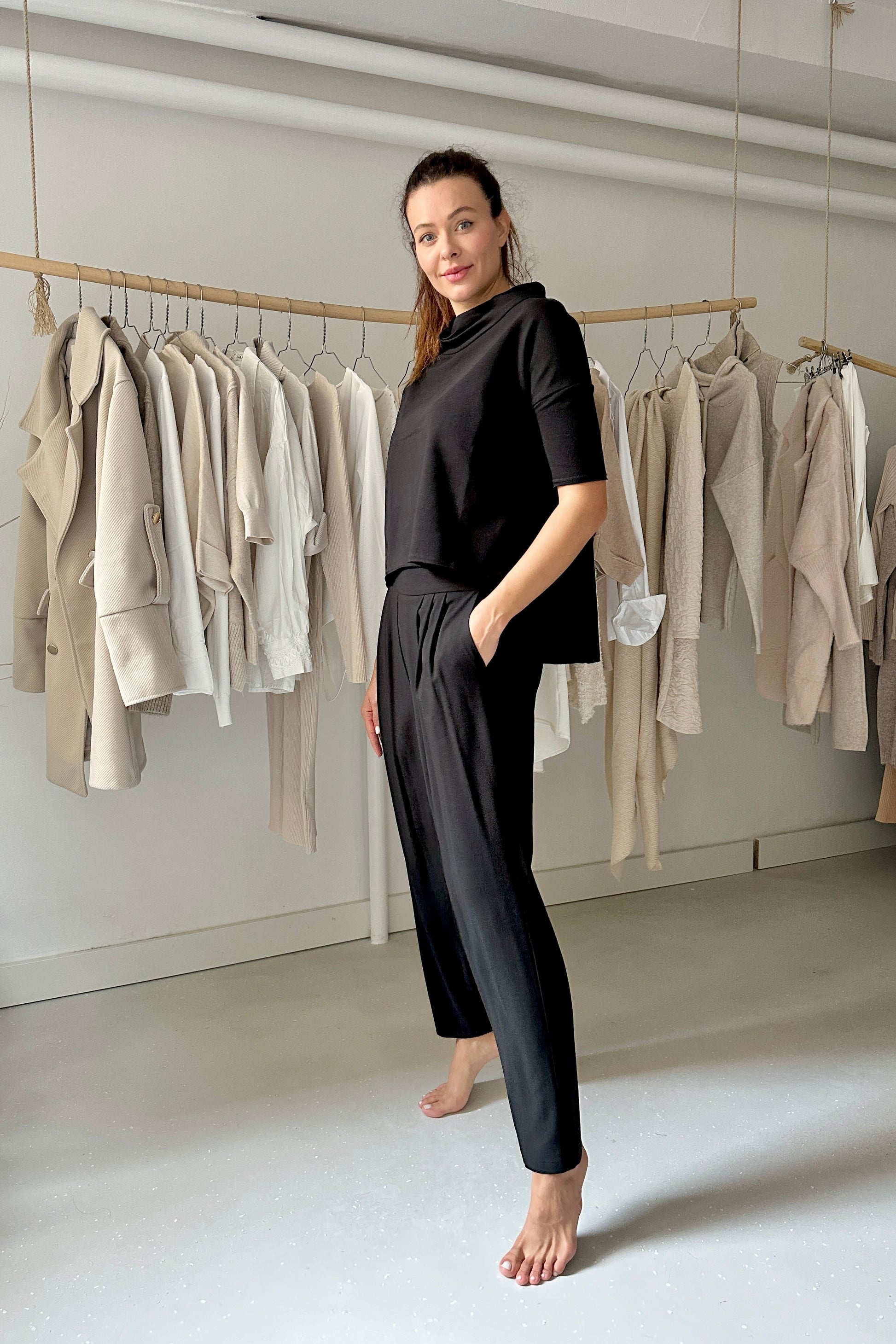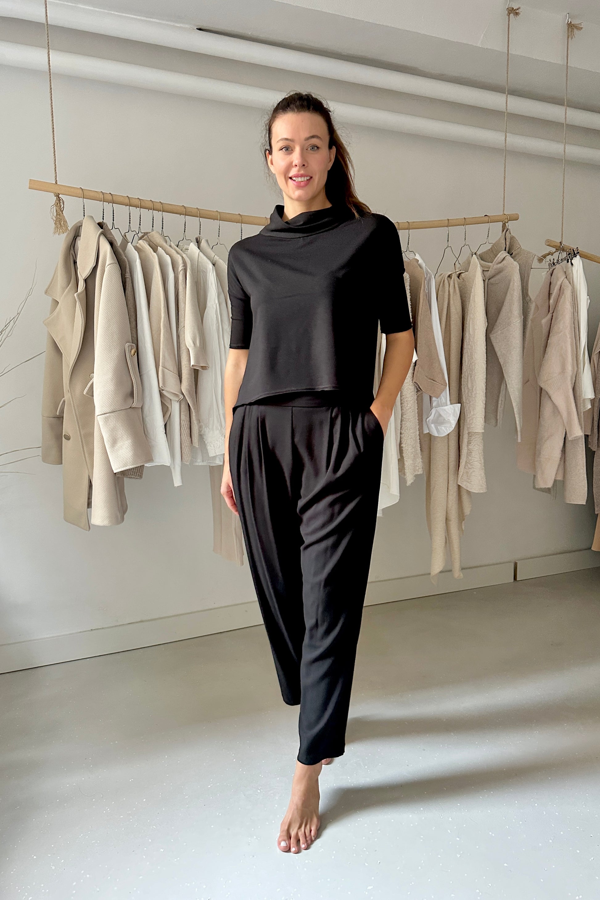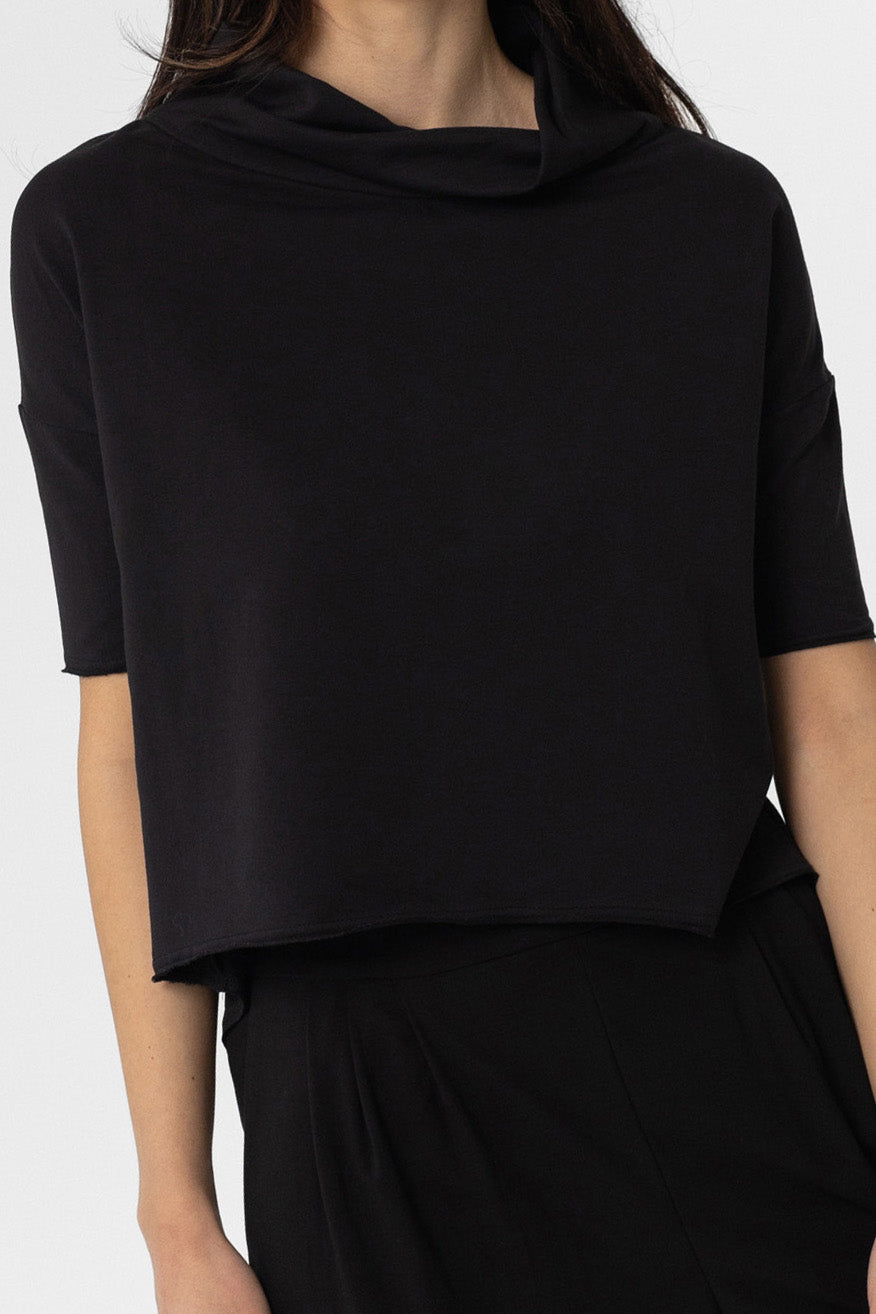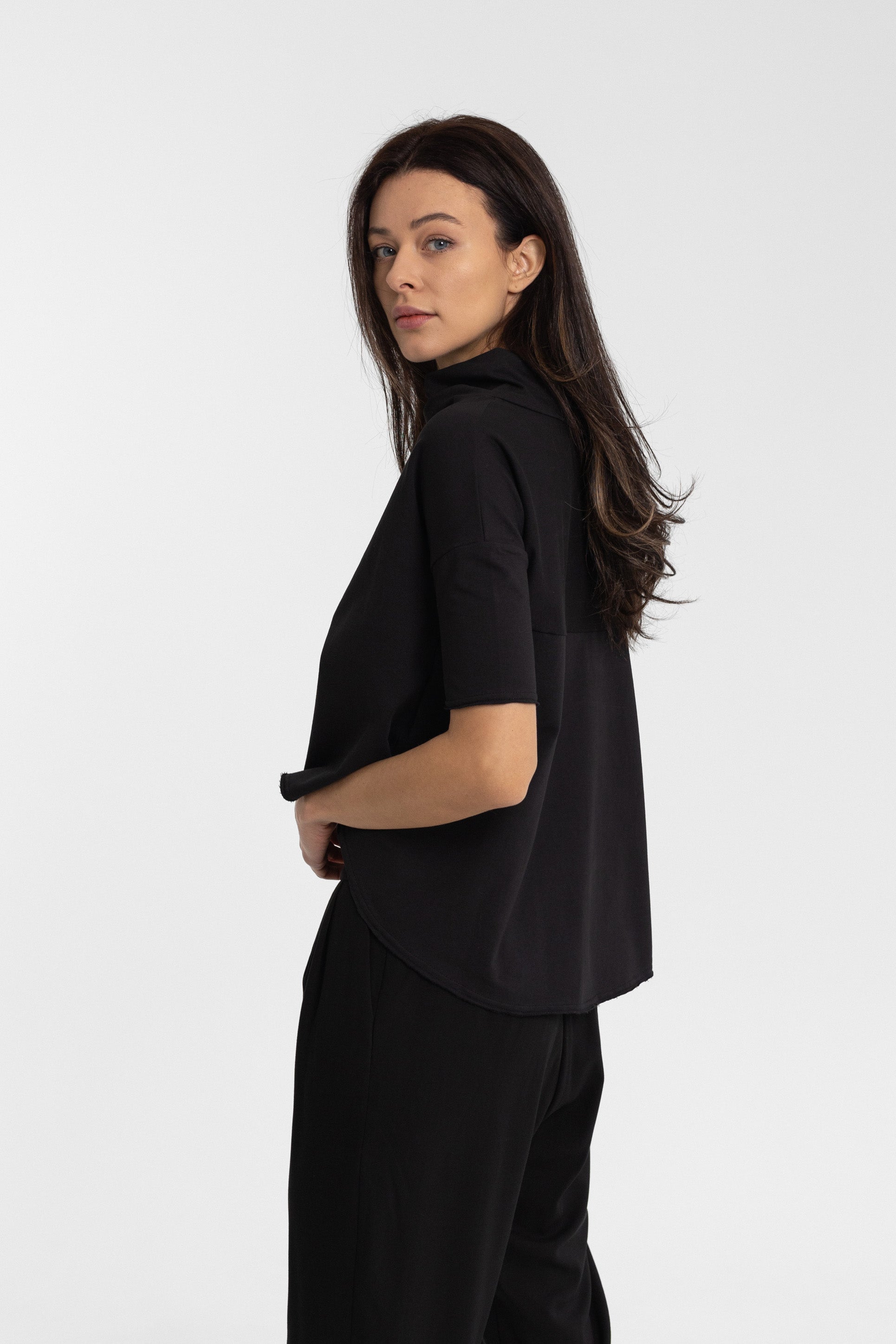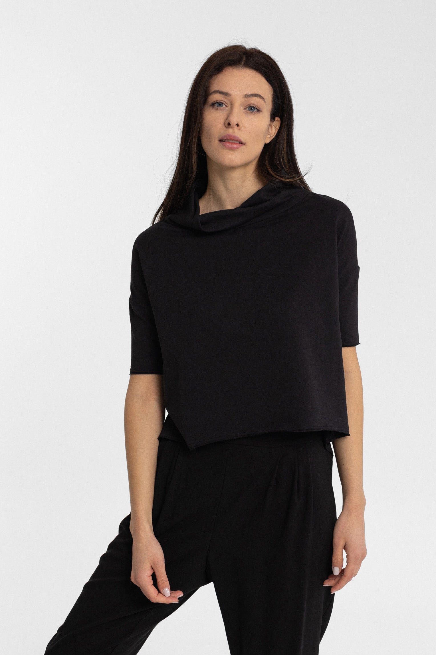 95 % pamut 5% elasztán – futter. Prémium minőségű természetes anyag, elasztikus, kívül sima, belül hurkolt szövet. Csavart nyakmegoldsáért, kényelmes laza fazonáért imádjuk. Elöl rövidebb, hátul hosszabb fazon, mely a mell vonalától lefelé enyhén bővül. Ujja a felkart takarja. Gépben 30 fokon mosható. A modell 177 cm magas, S-es méretet visel.