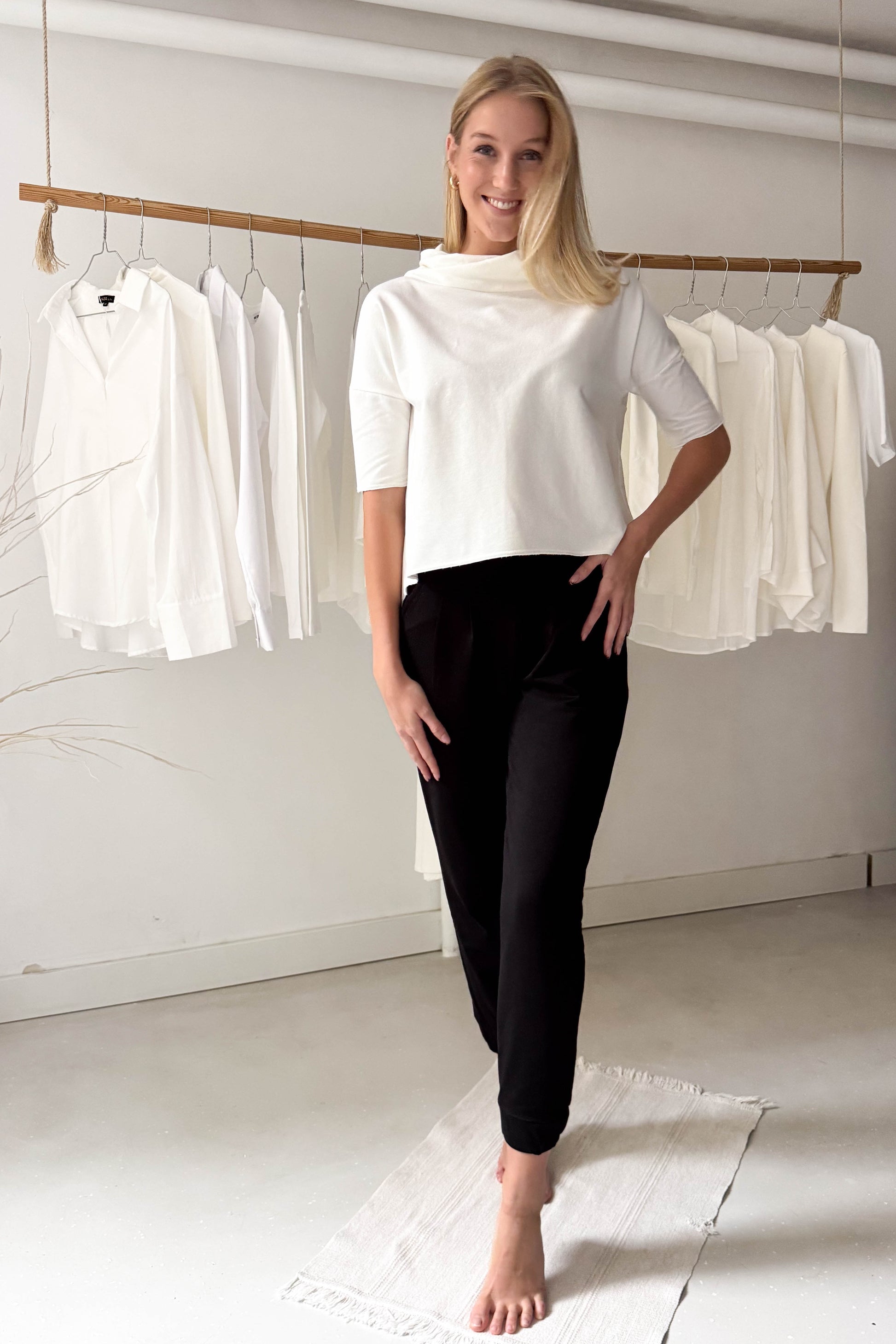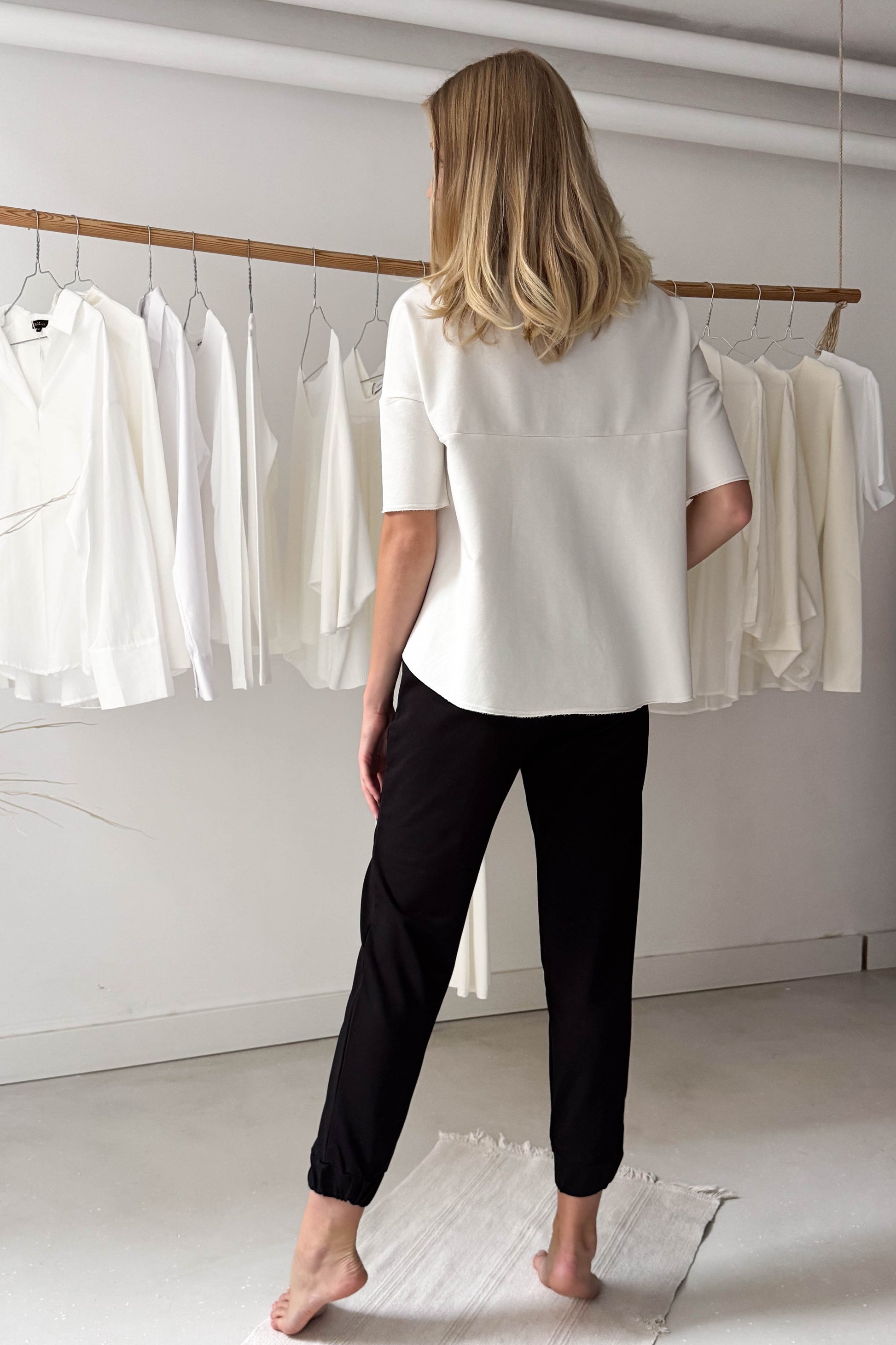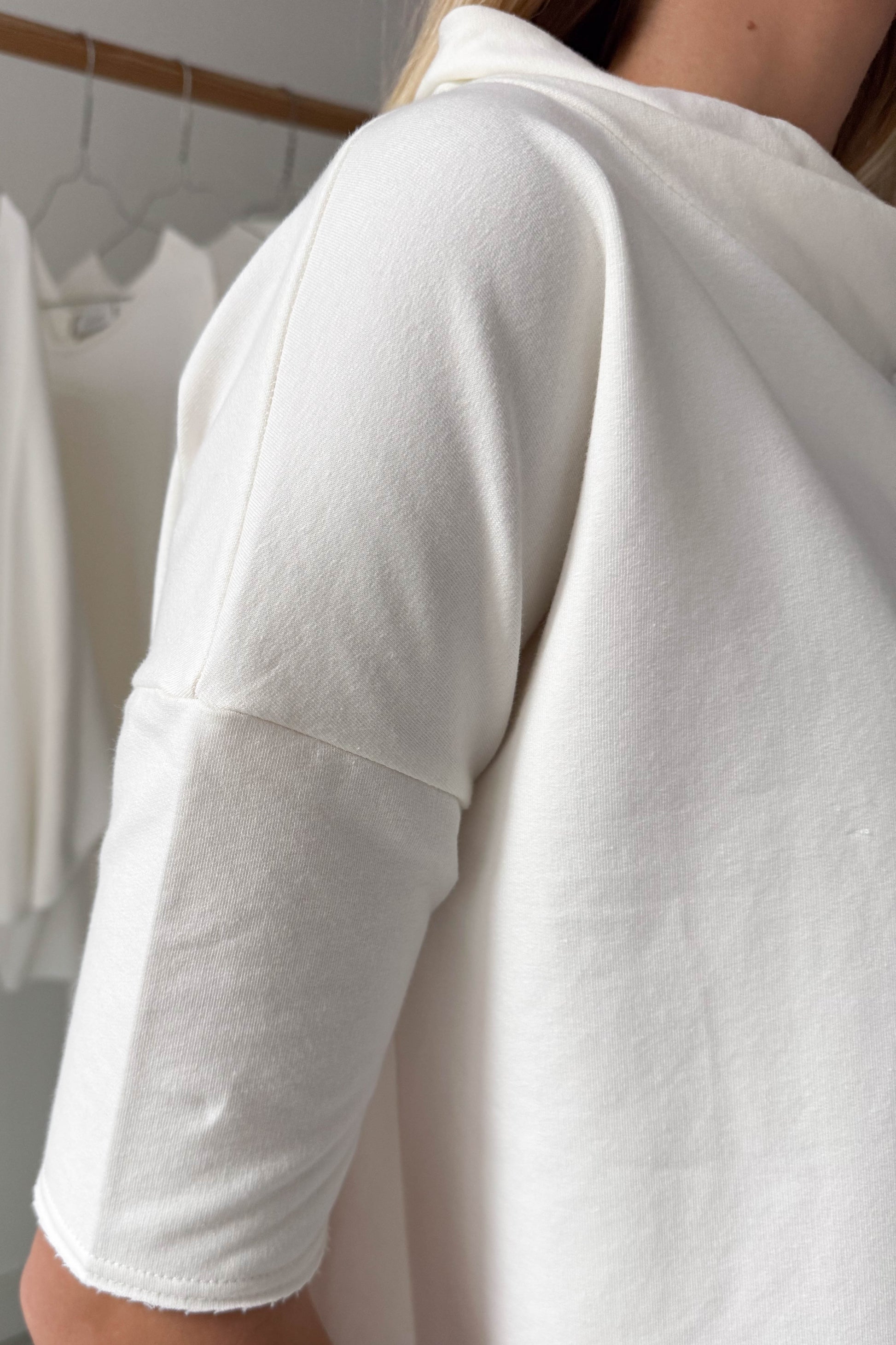 Fehér, rövidujjú, csavart nyakú, lenge felső. Elől rövidebb, hátul hosszabb szabás. Két féle hosszúságban készül, ez a rövidebb fazon. Mell vonaltól lefelé enyhén bővül. Anyaga kívül sima, belül hurkolt szövet, kényelmes, elasztikus.