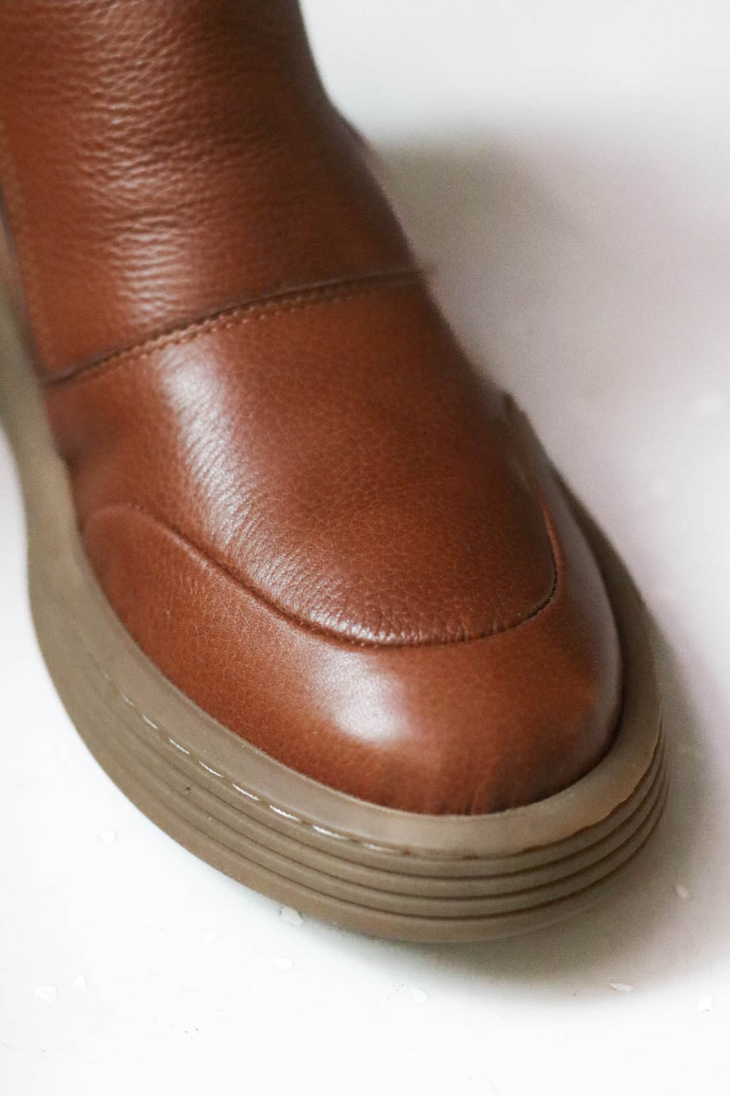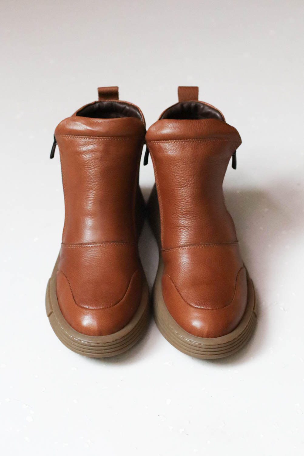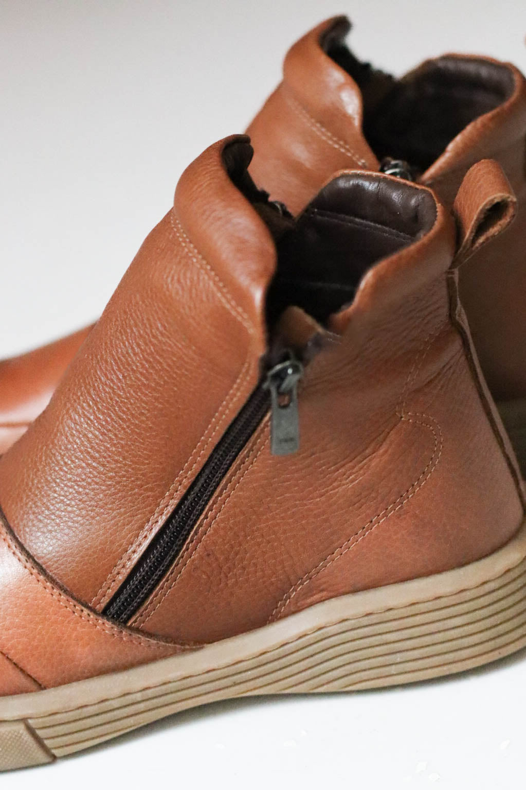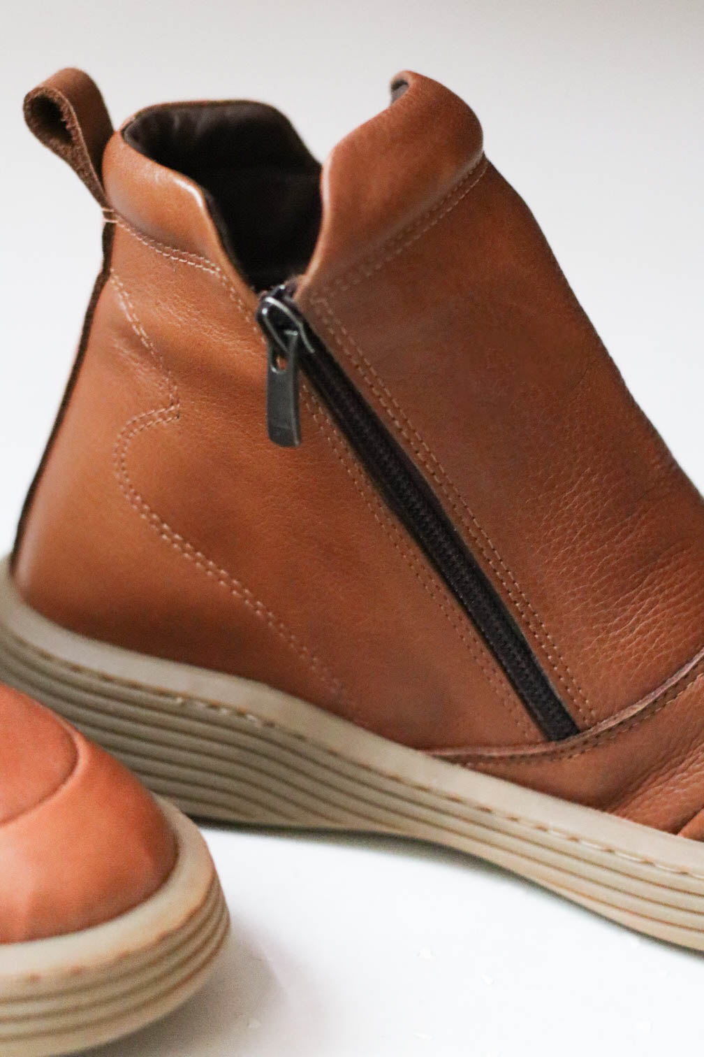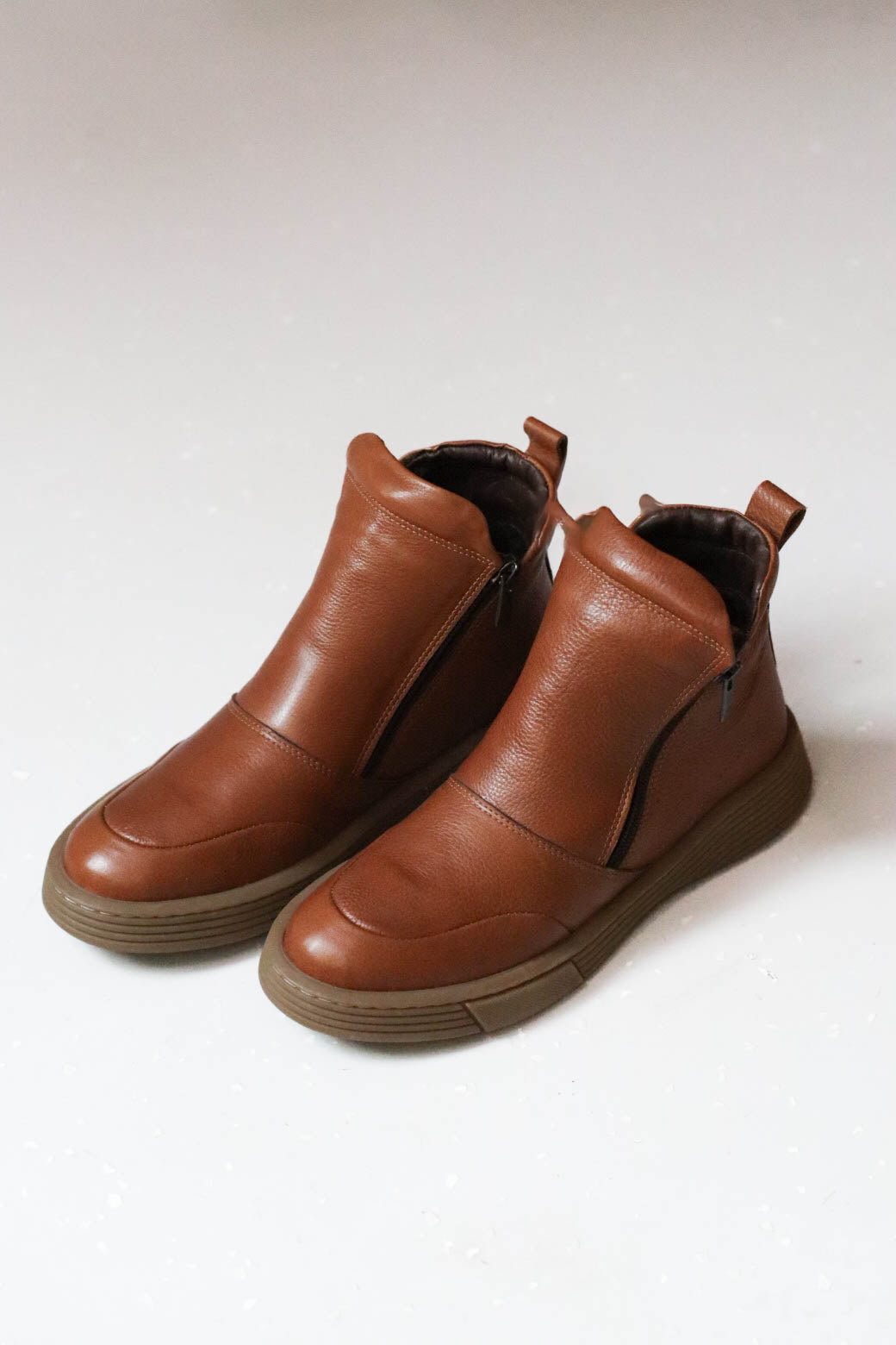 Valódi bőr bokacsizma, meleg textill béléssel. Mindkét oldalán cipzáros. A talpa szintetikus. Talpmagasság: 1,5-2,5 cm.