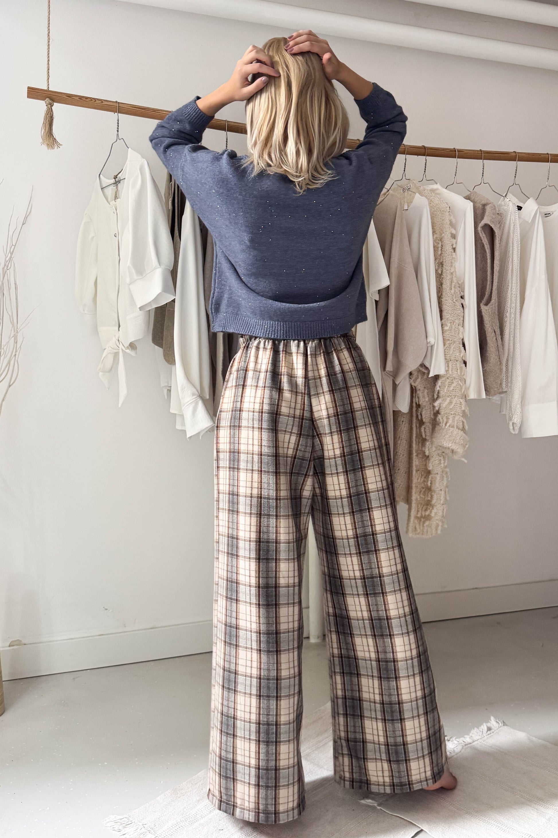 Kerek nyakú, hosszúujjú, ejtett vállú kötött pulcsi, mák kék színben. Apró flitterekkel csillogós fazon. A nyaka, az ujjak vége és az alja passzés.