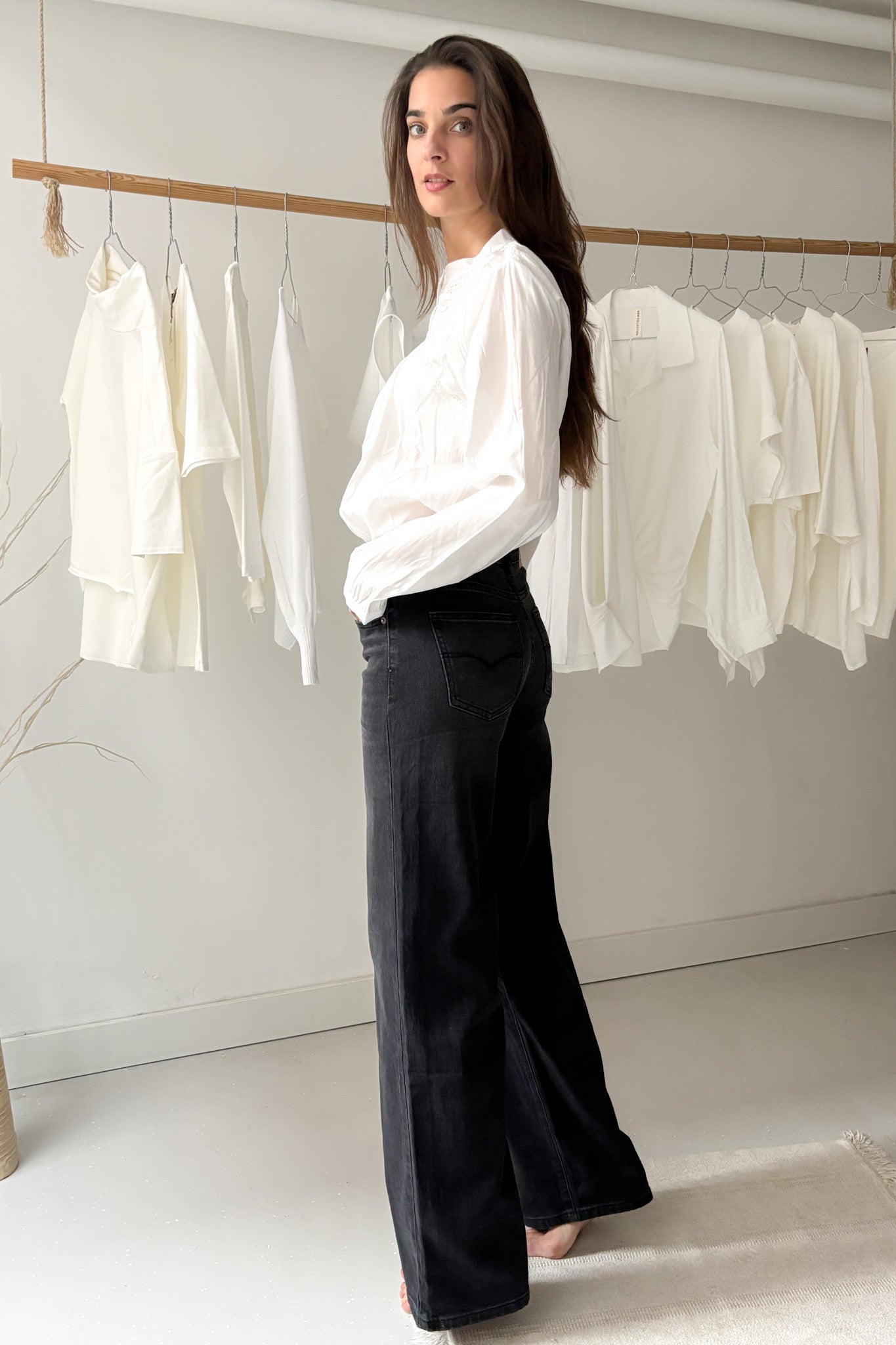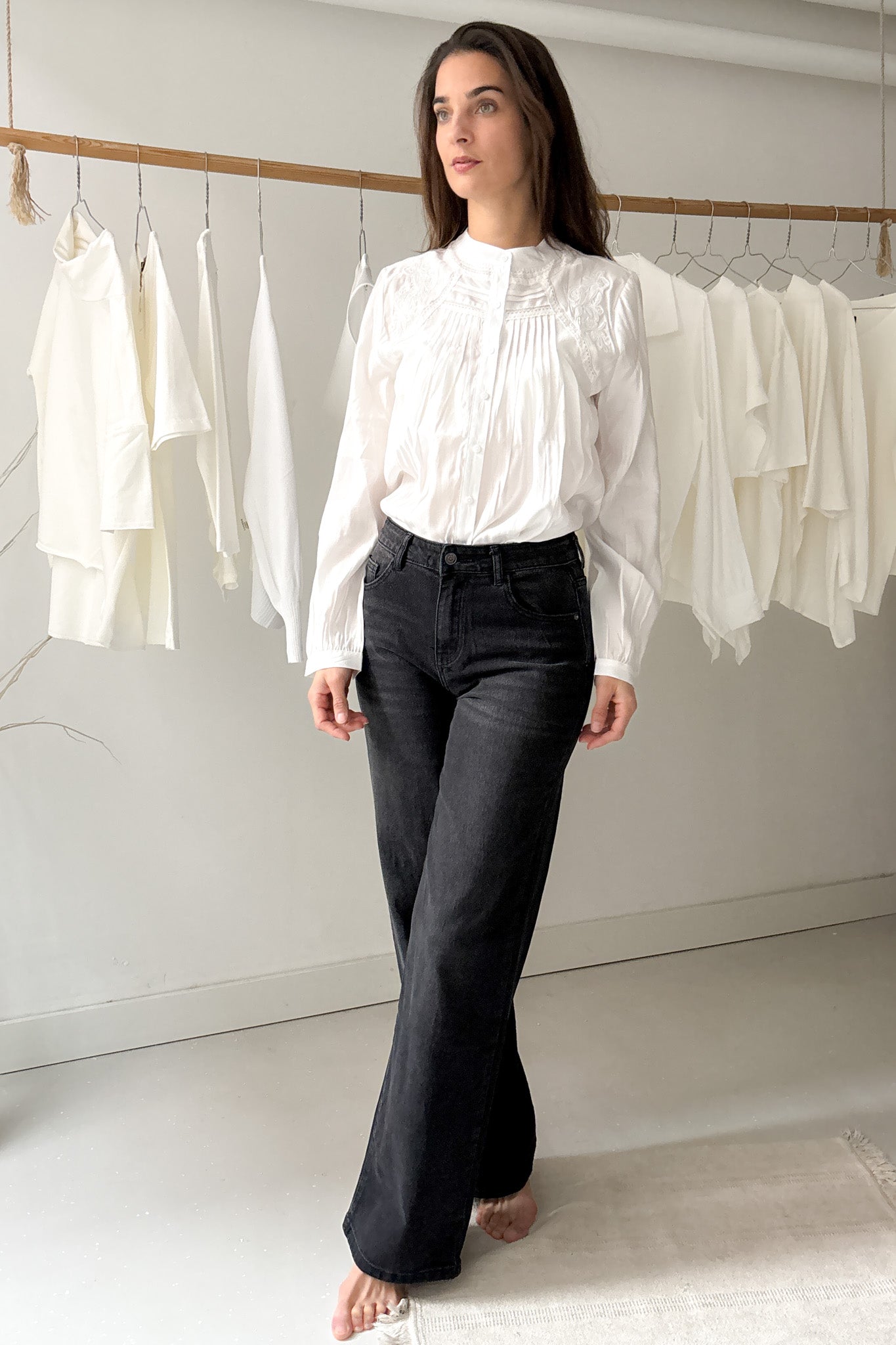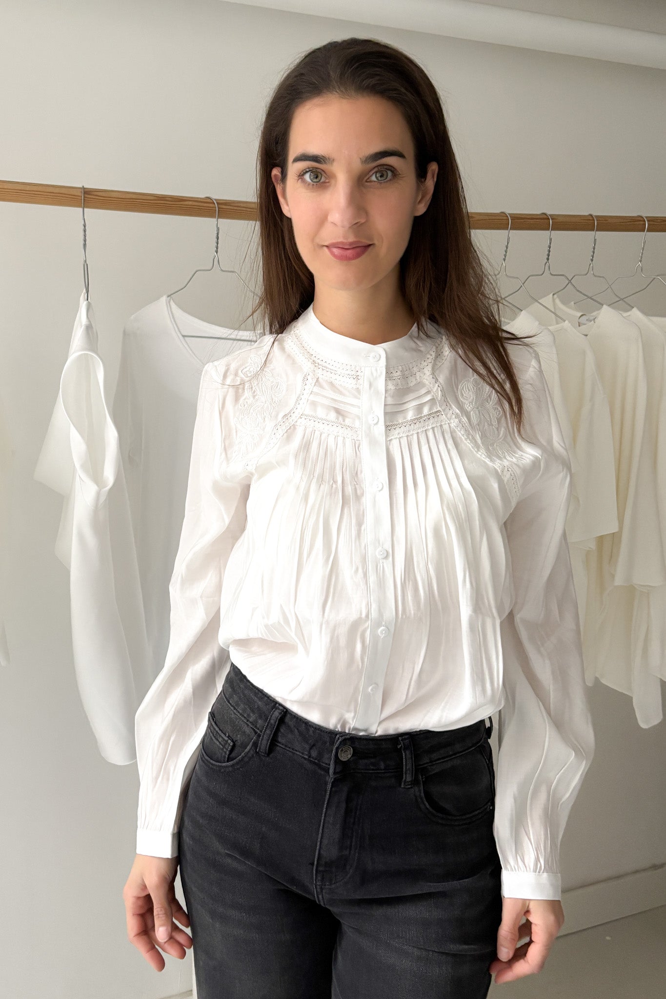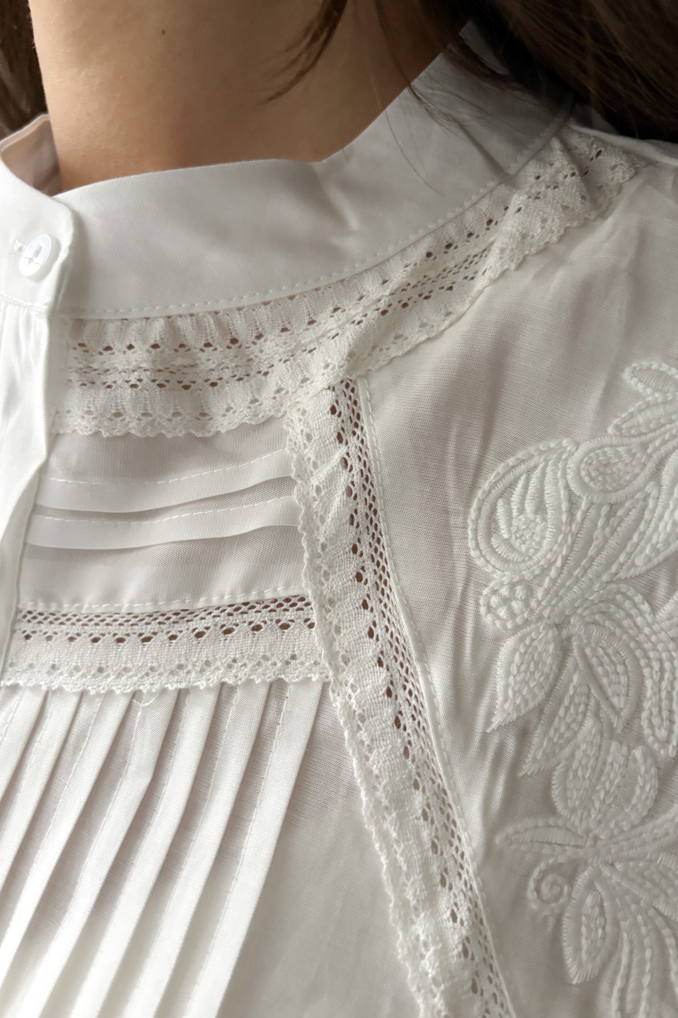 Elegáns, hosszúujjú blúz csipkebetéttel. Apró, fehér gombokkal összefogható. Környakkal ellátott fazon.