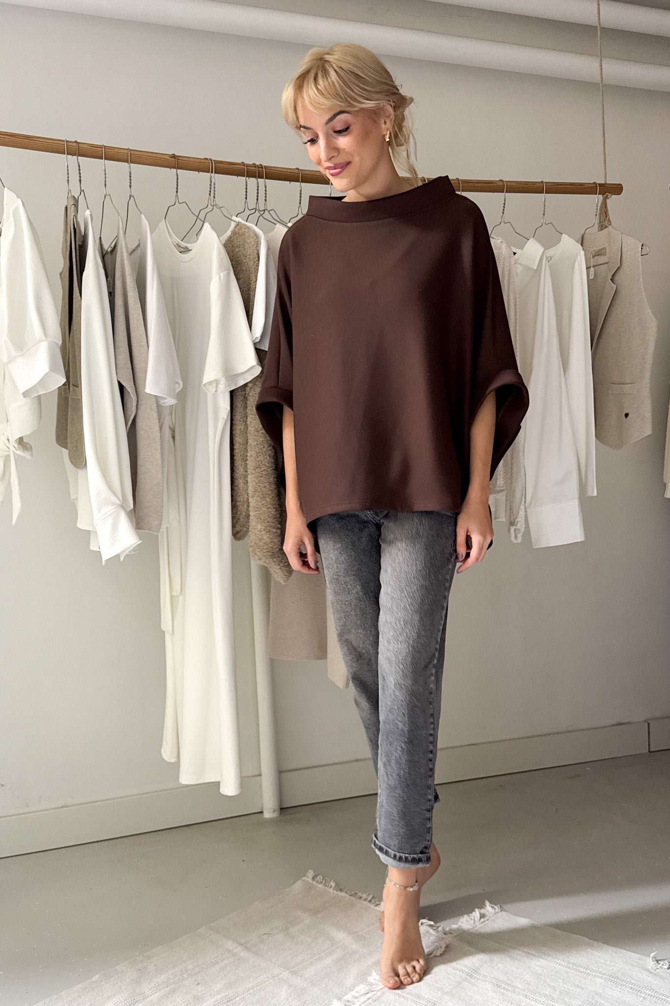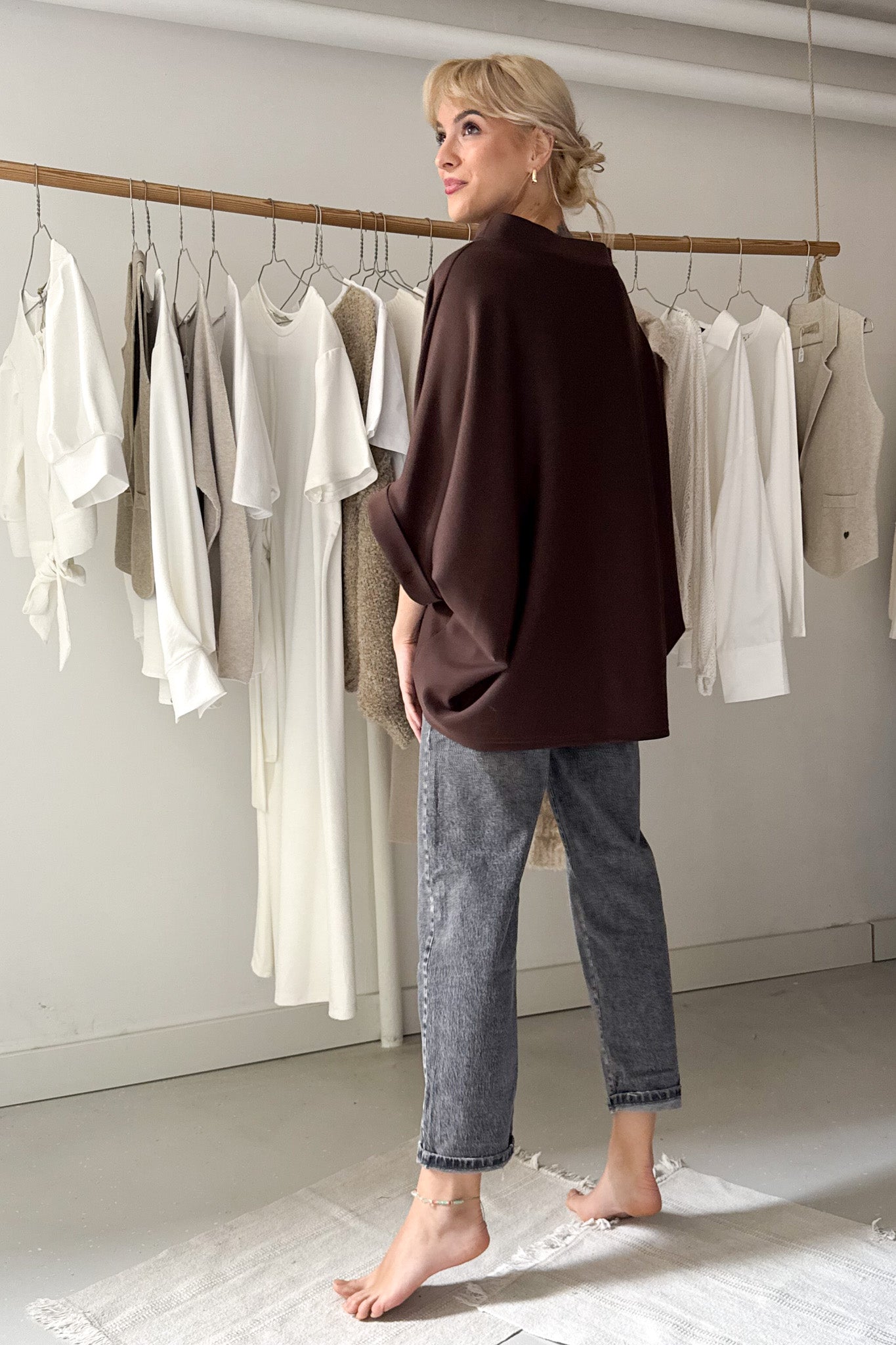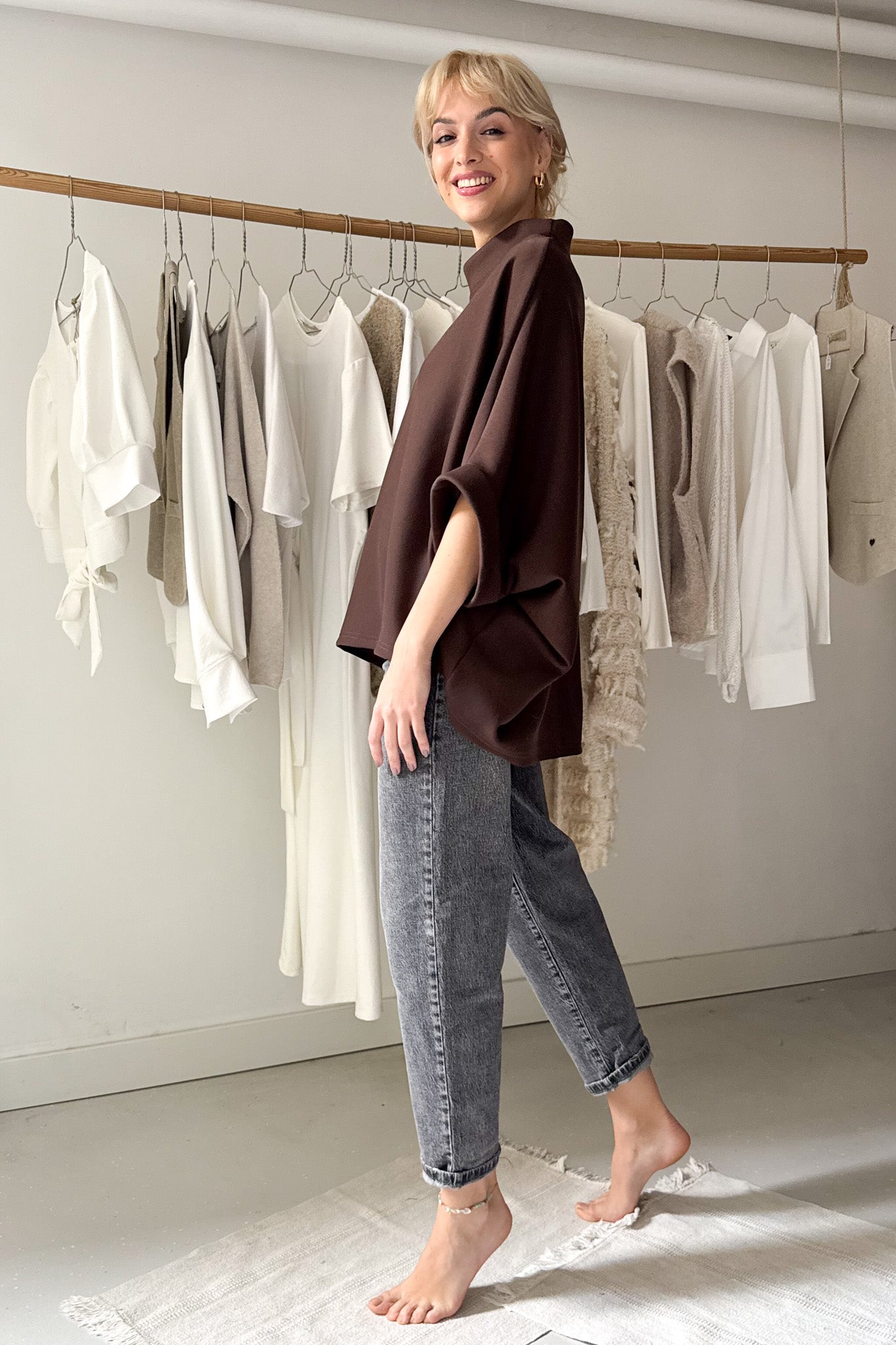 Puha anyagú, lezser, oversize felső. Denevérujjas, állógalléros fazon.