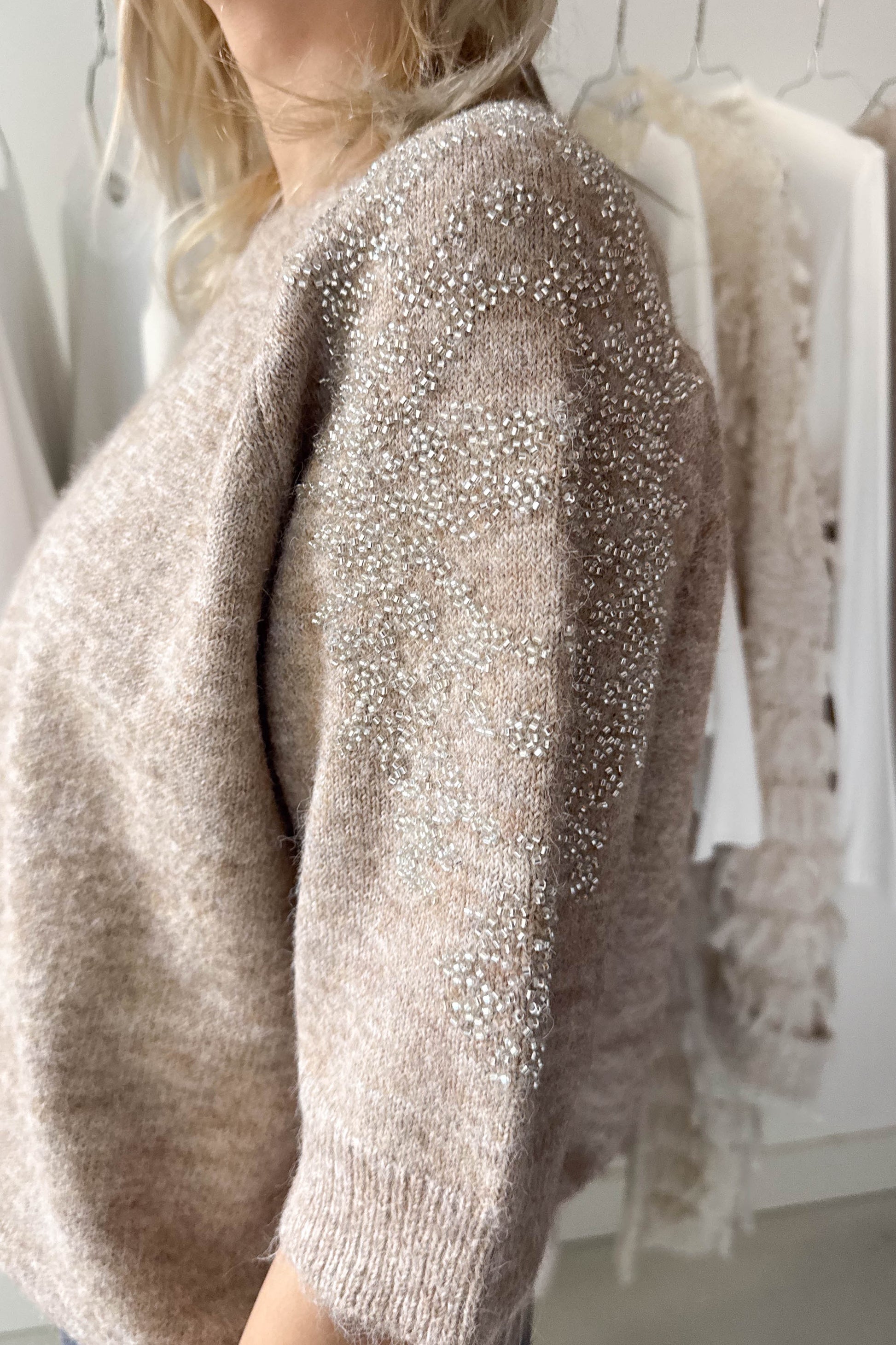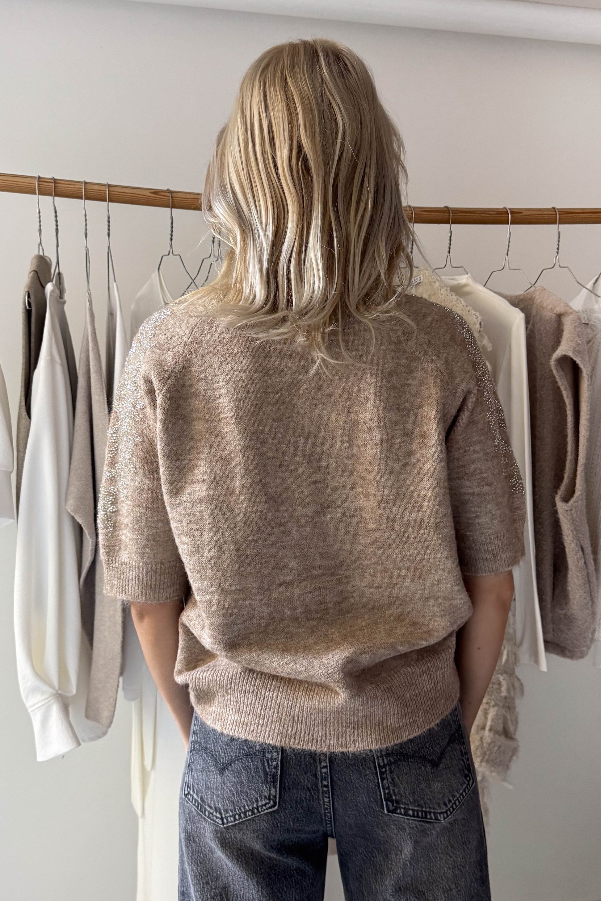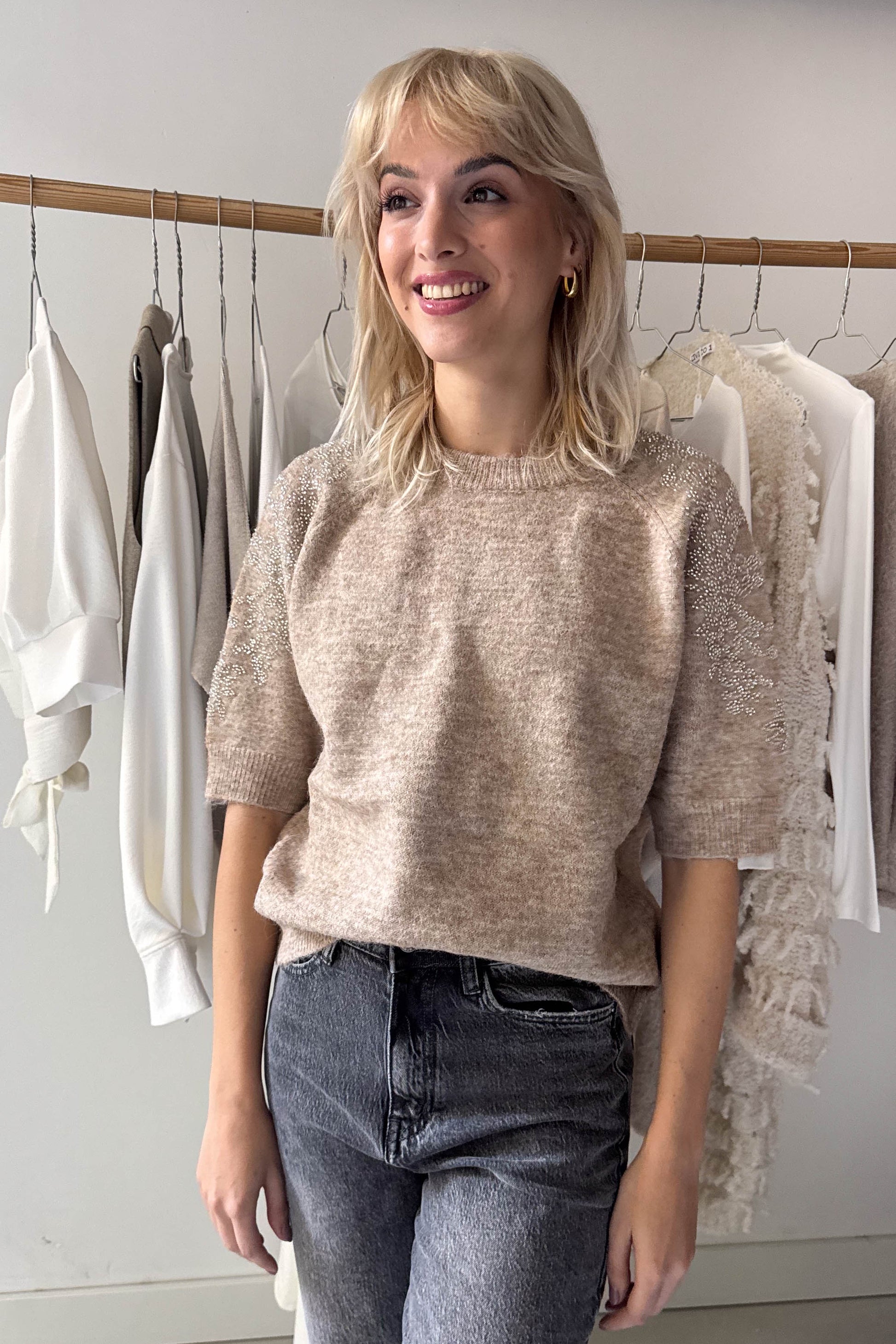 Rövidujjú, kerek nyakkivágású, díszített ujjú, kötött felső, tejkaramell színben. Az ujjakon gyöngydíszítéssel van ellátva. A nyaka, az ujjak vége és az alja passzés.