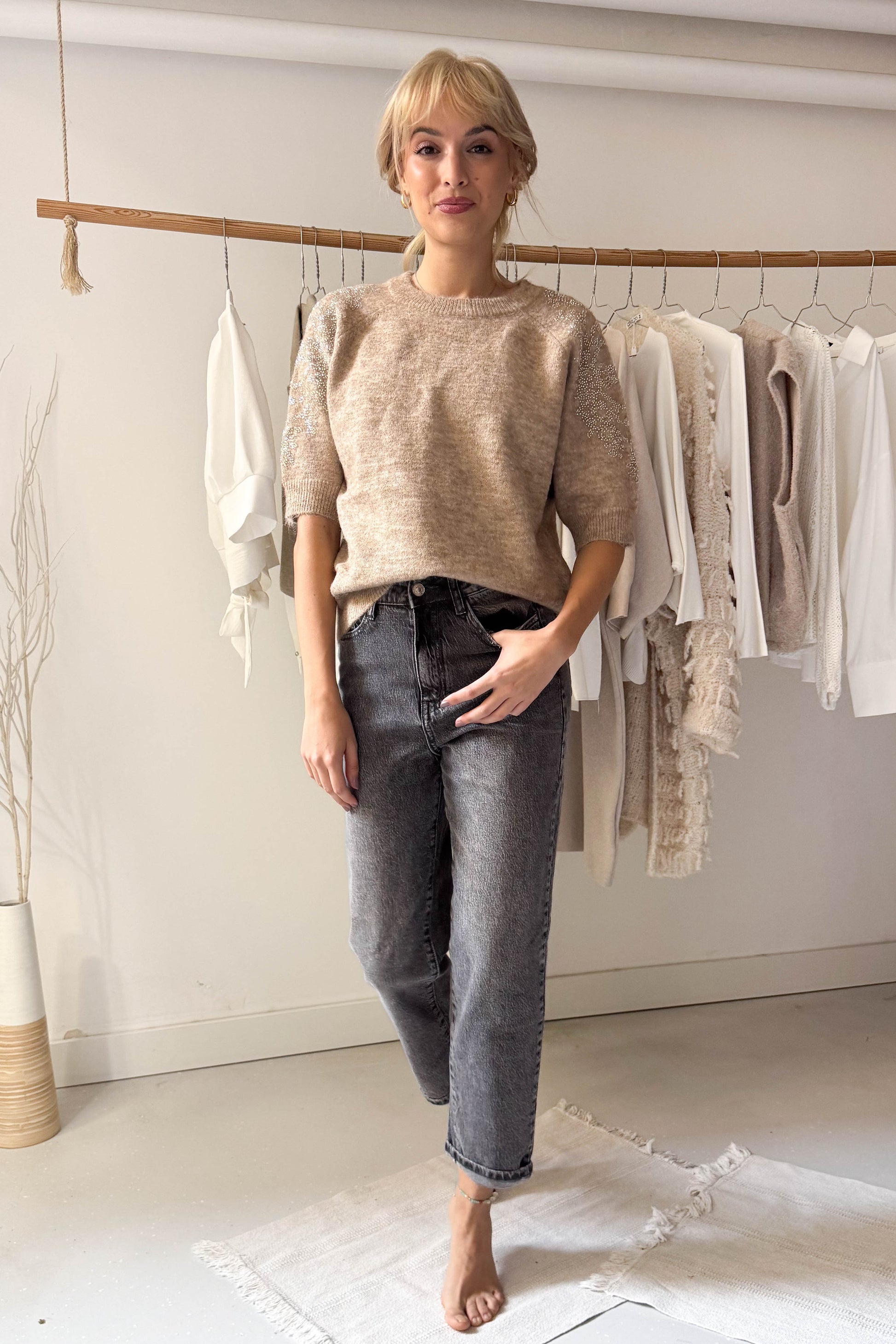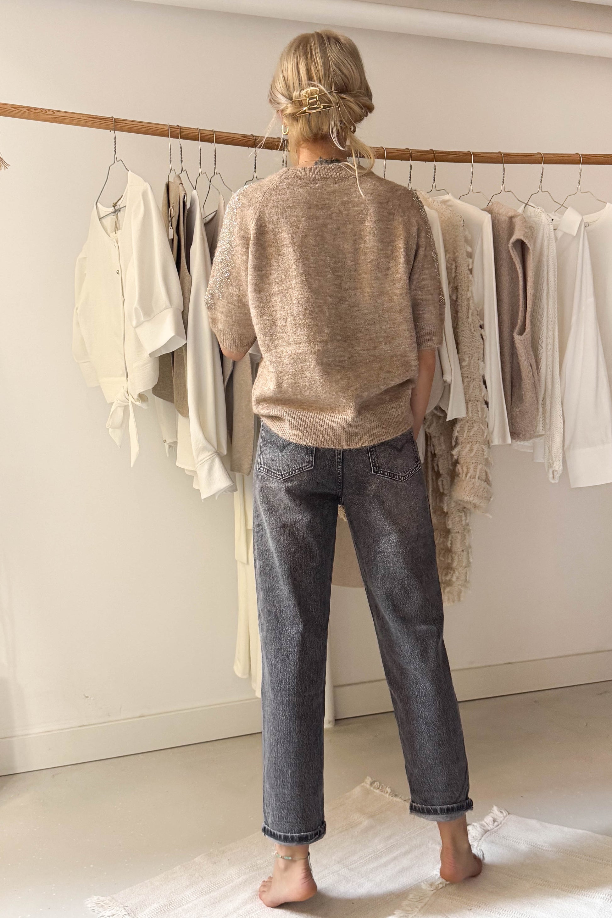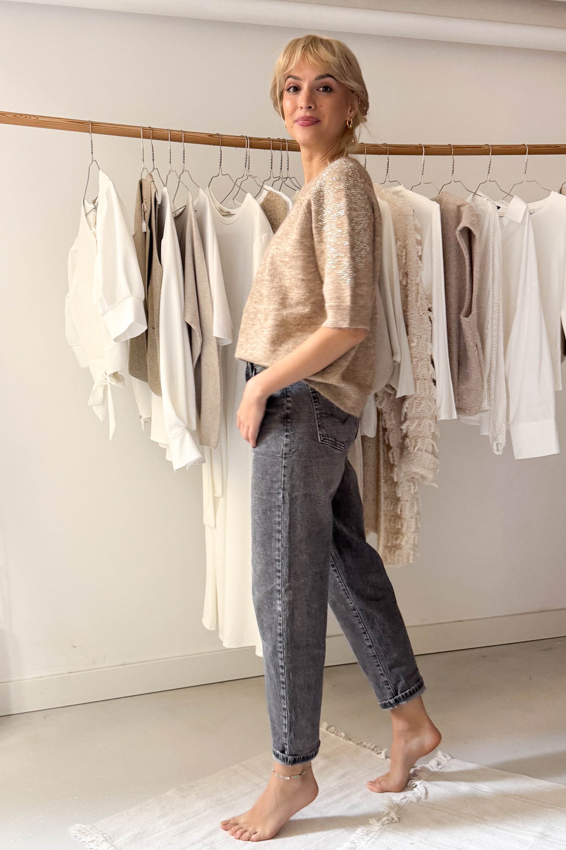 Rövidujjú, kerek nyakkivágású, díszített ujjú, kötött felső, tejkaramell színben. Az ujjakon gyöngydíszítéssel van ellátva. A nyaka, az ujjak vége és az alja passzés.