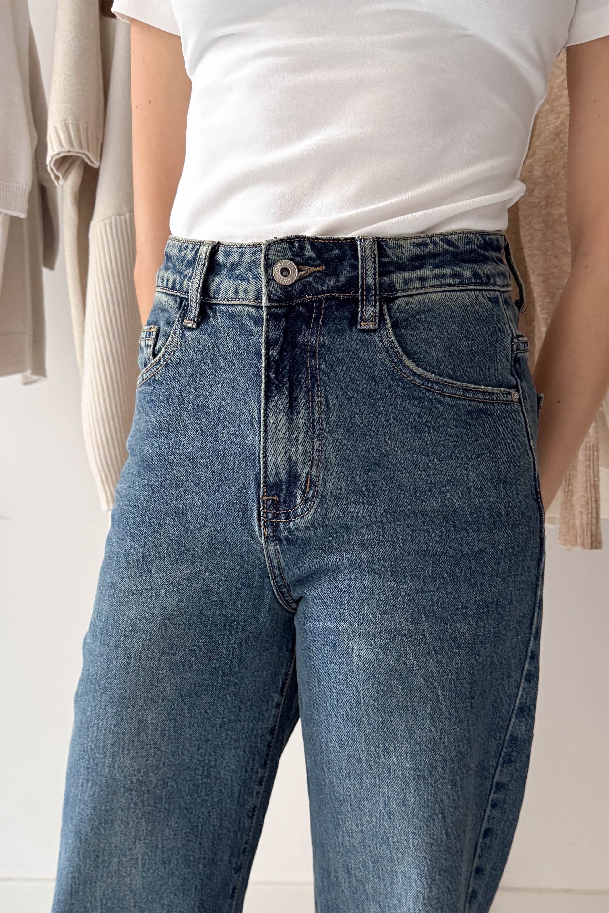 Egyenes szárú farmer nadrág, sötétkék színben. Zsebes fazon. Elől egy gombbal és cipzárral záródik.