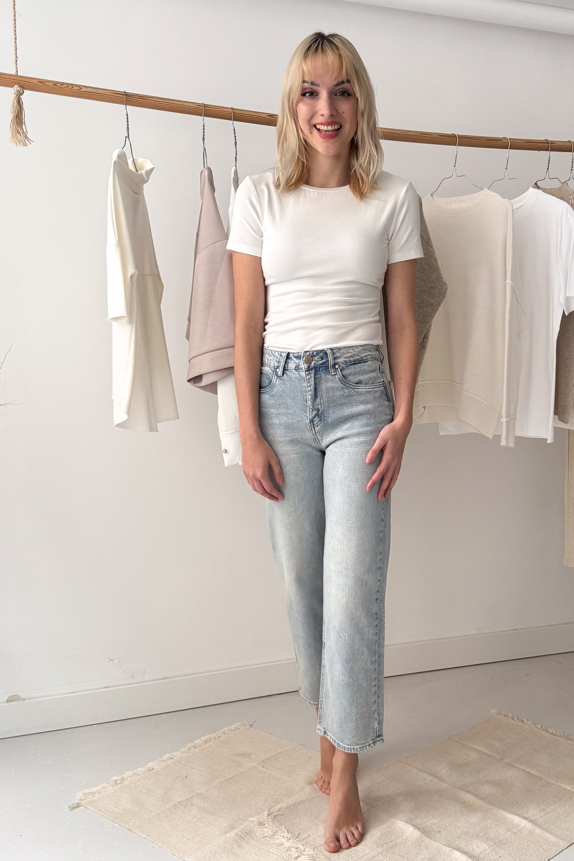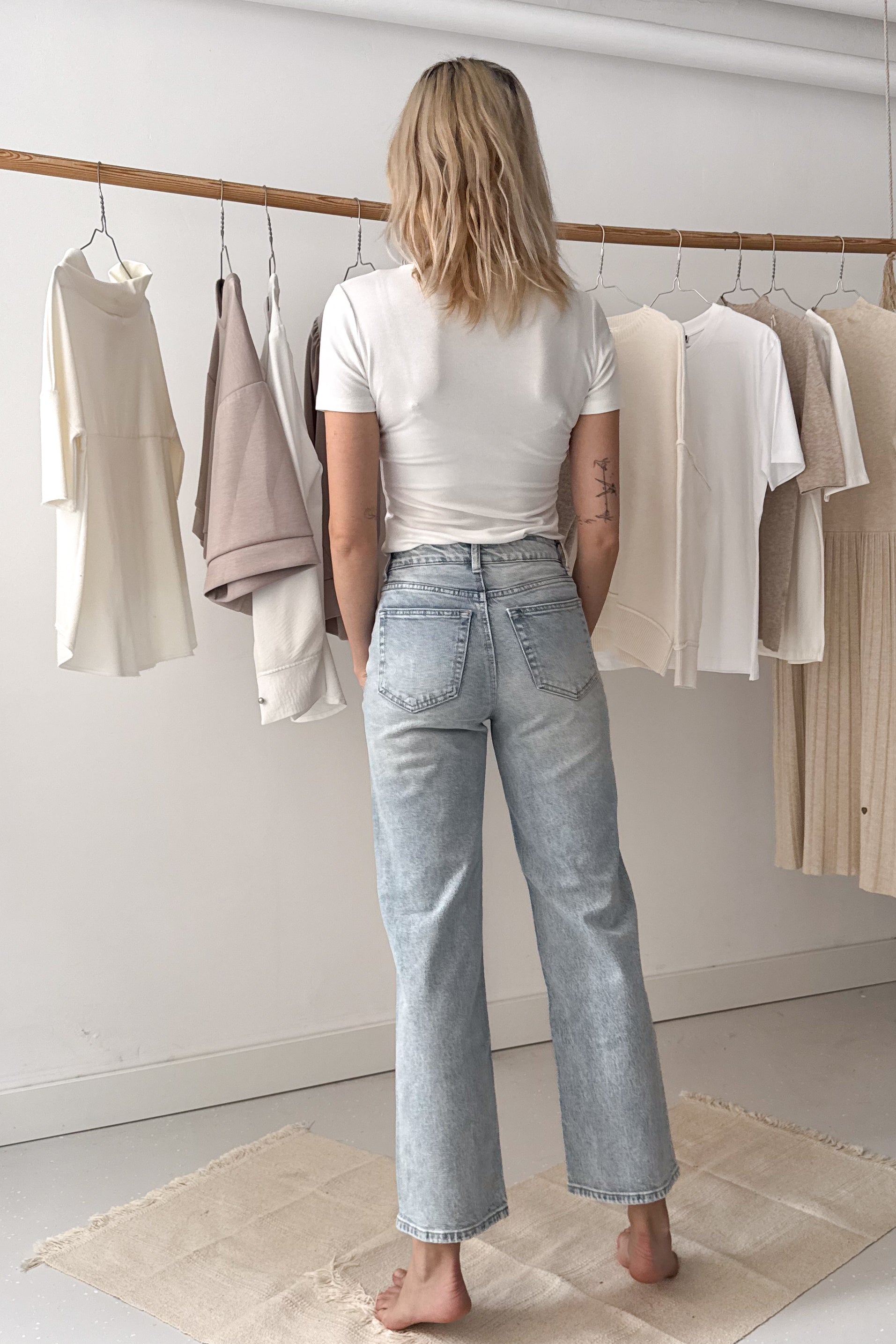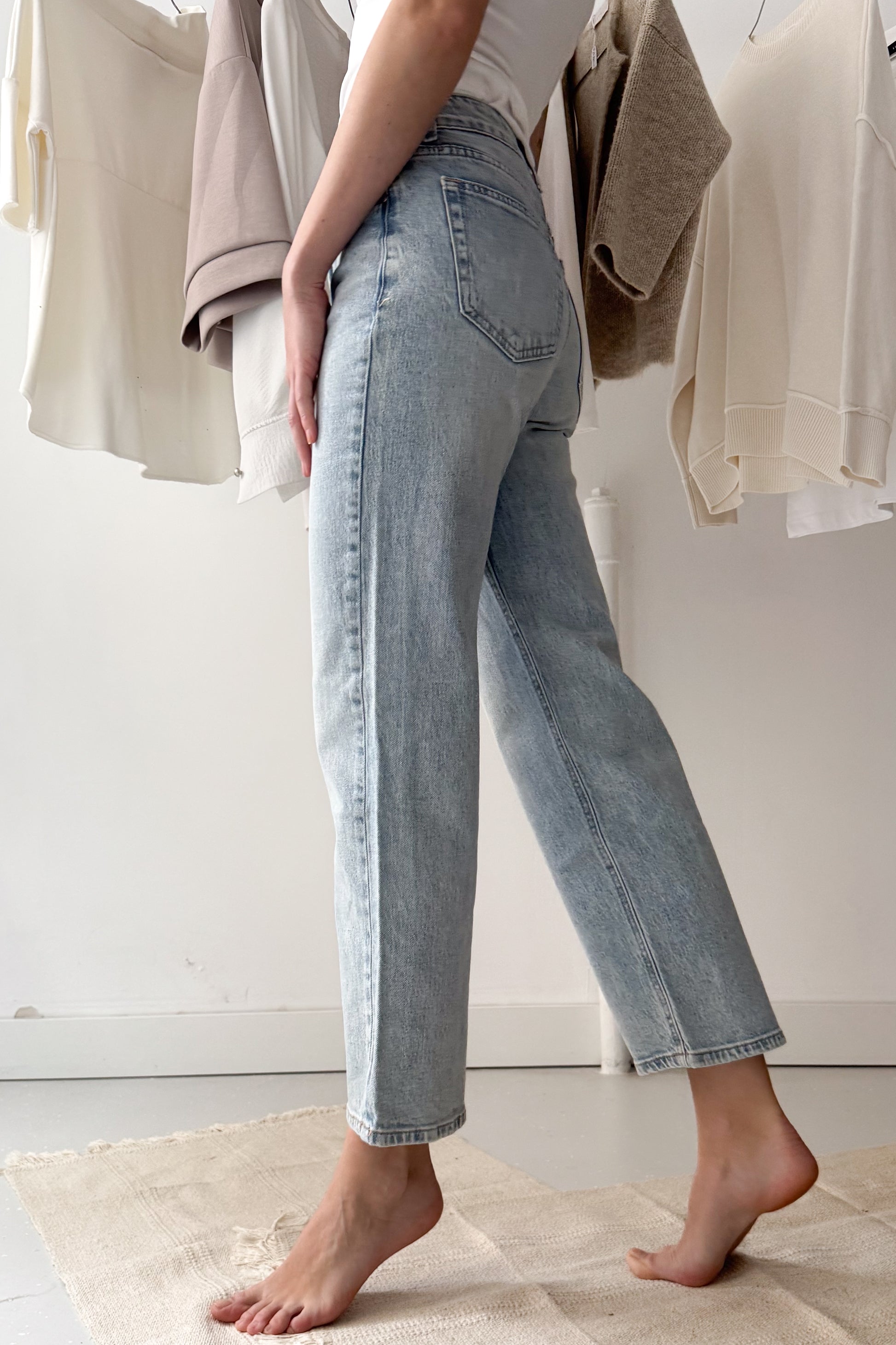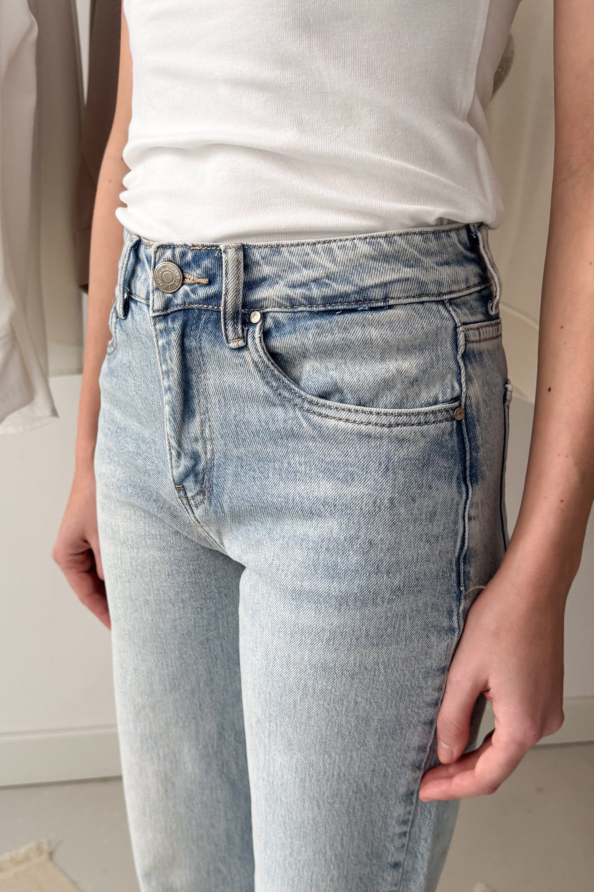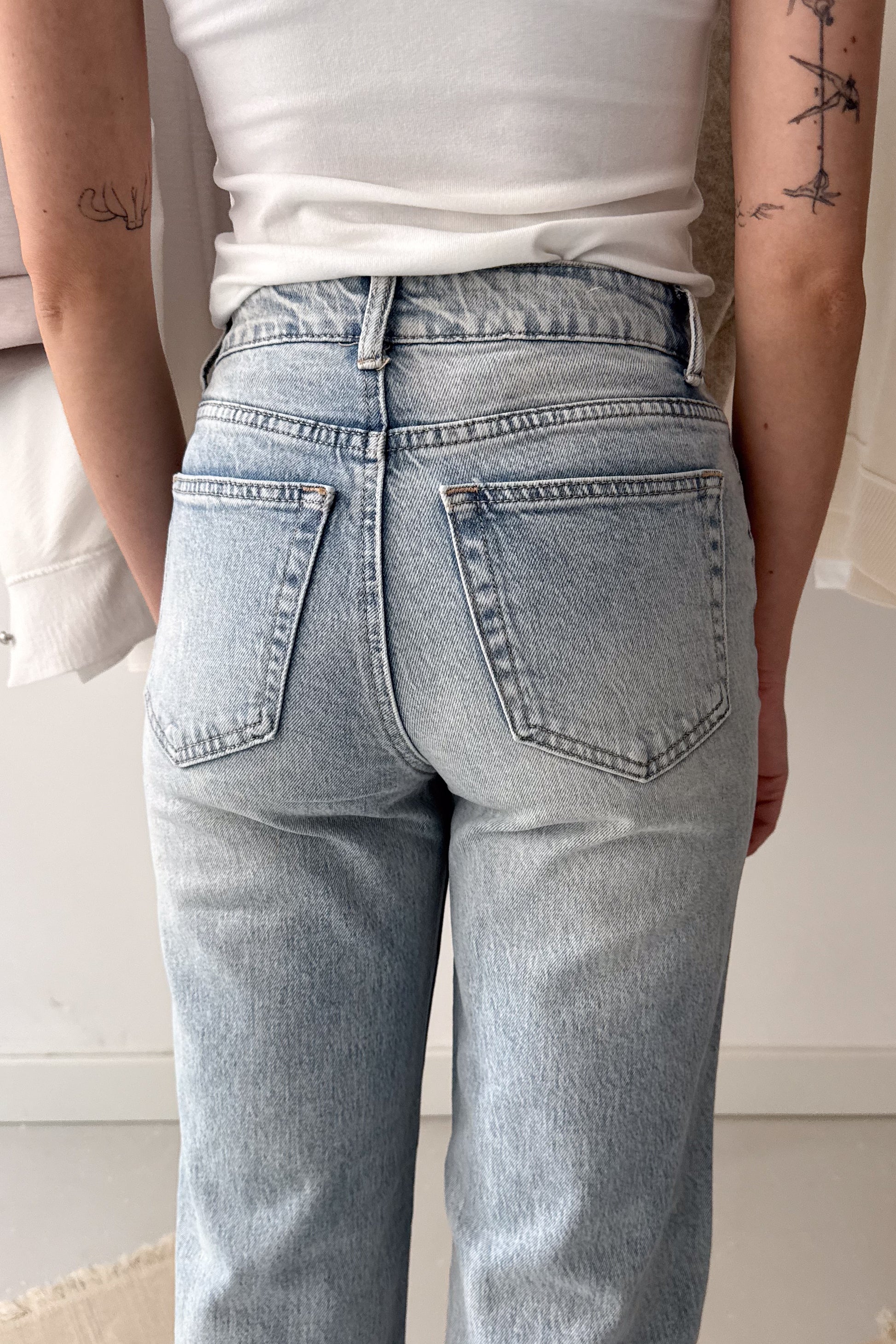Egyenes szárú farmer nadrág, világoskék színben. Zsebes fazon. Elől egy gombbal és cipzárral záródik.