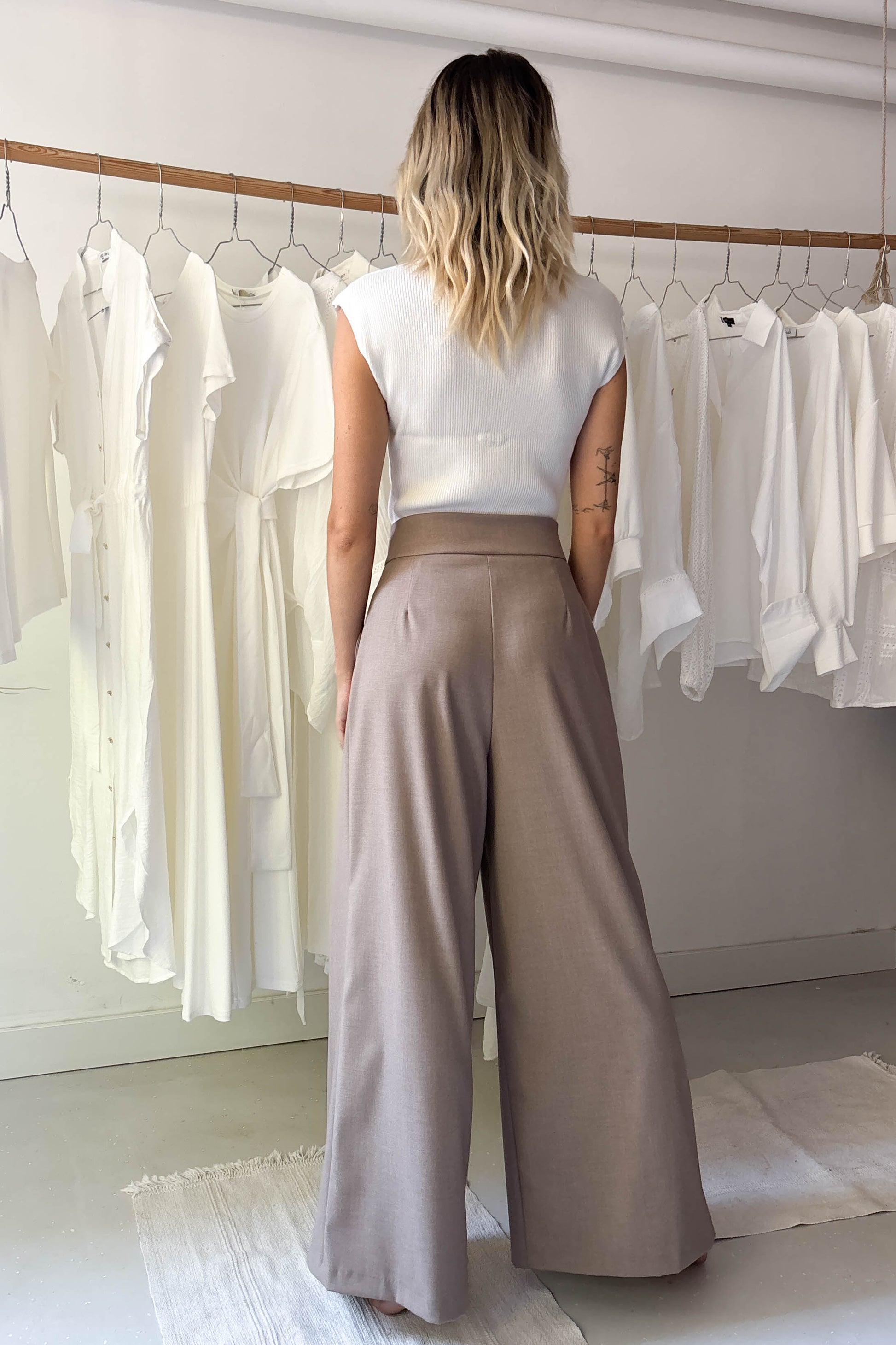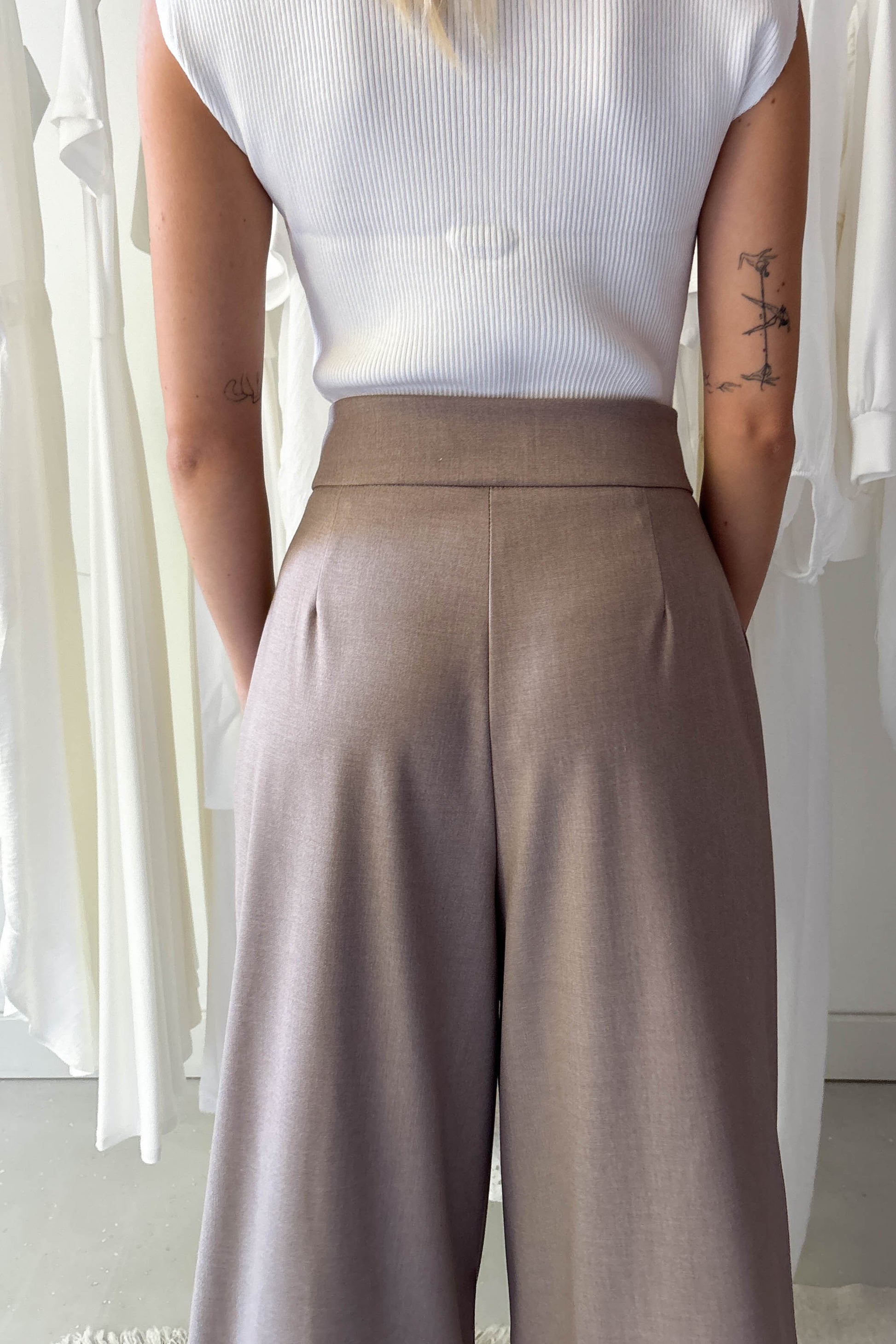 Hosszabb fazonú, elől hajtásos nadrág mandulabarna színben. Hátul szűkítő varrással van ellátva. két gombbal és cipzárral záródik. Zsebes fazon.