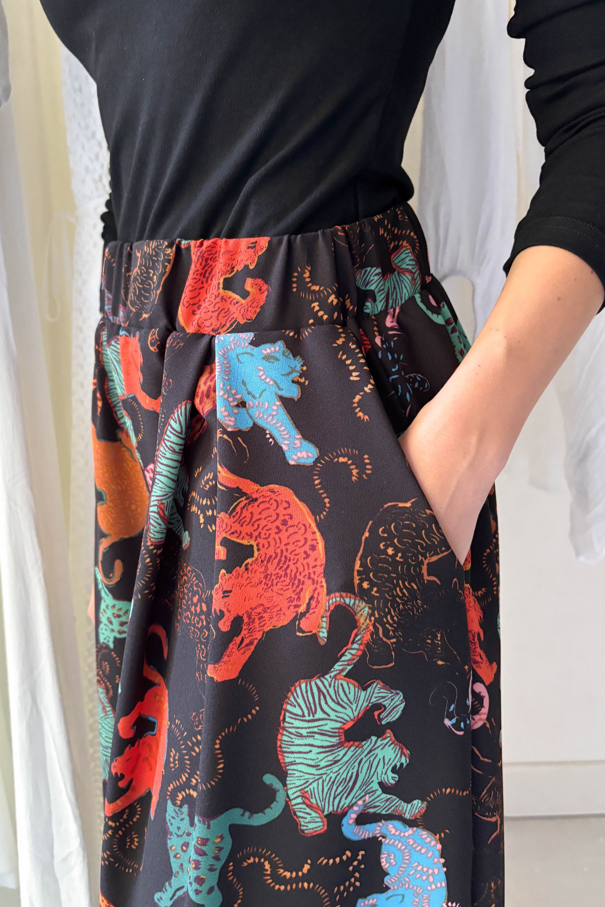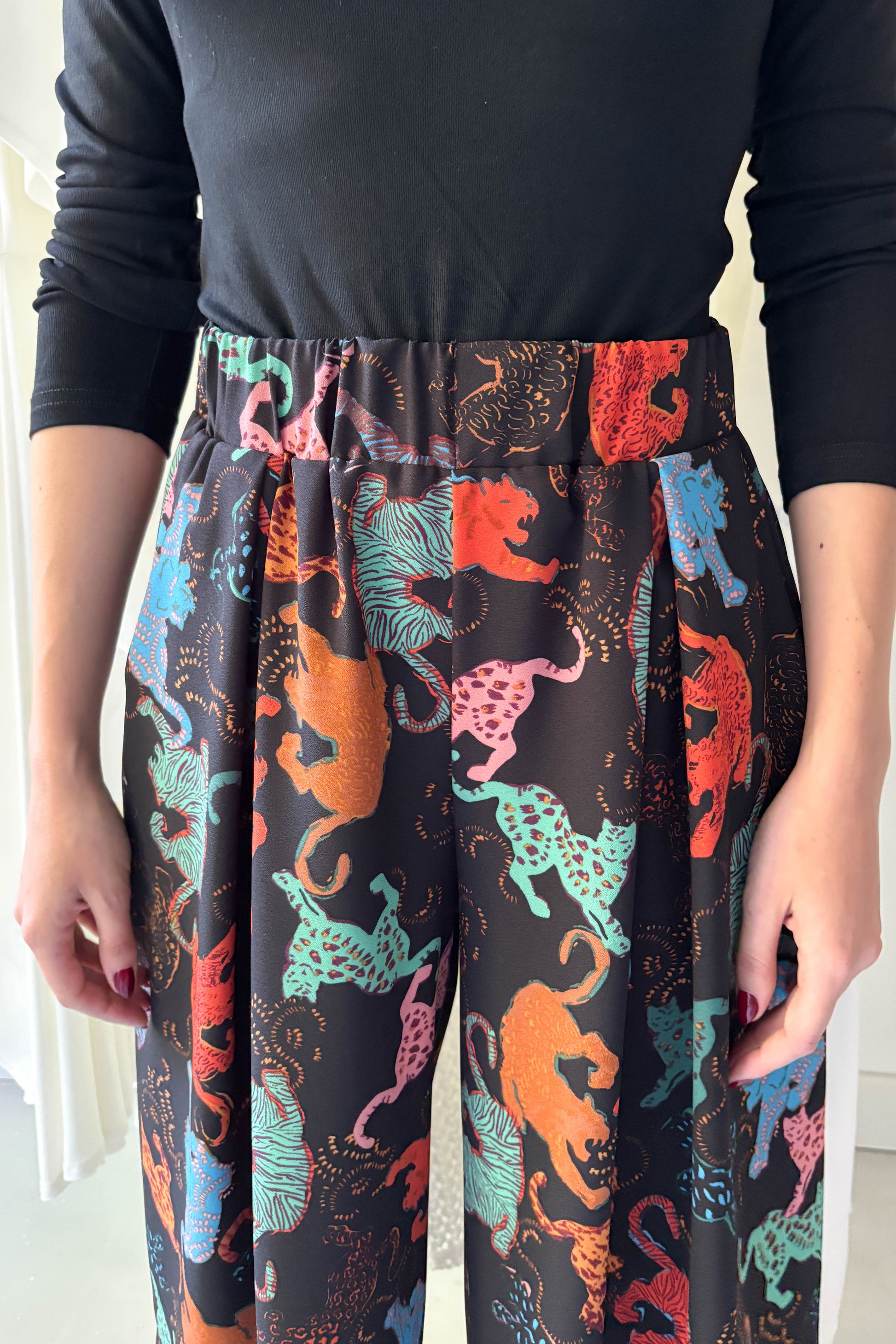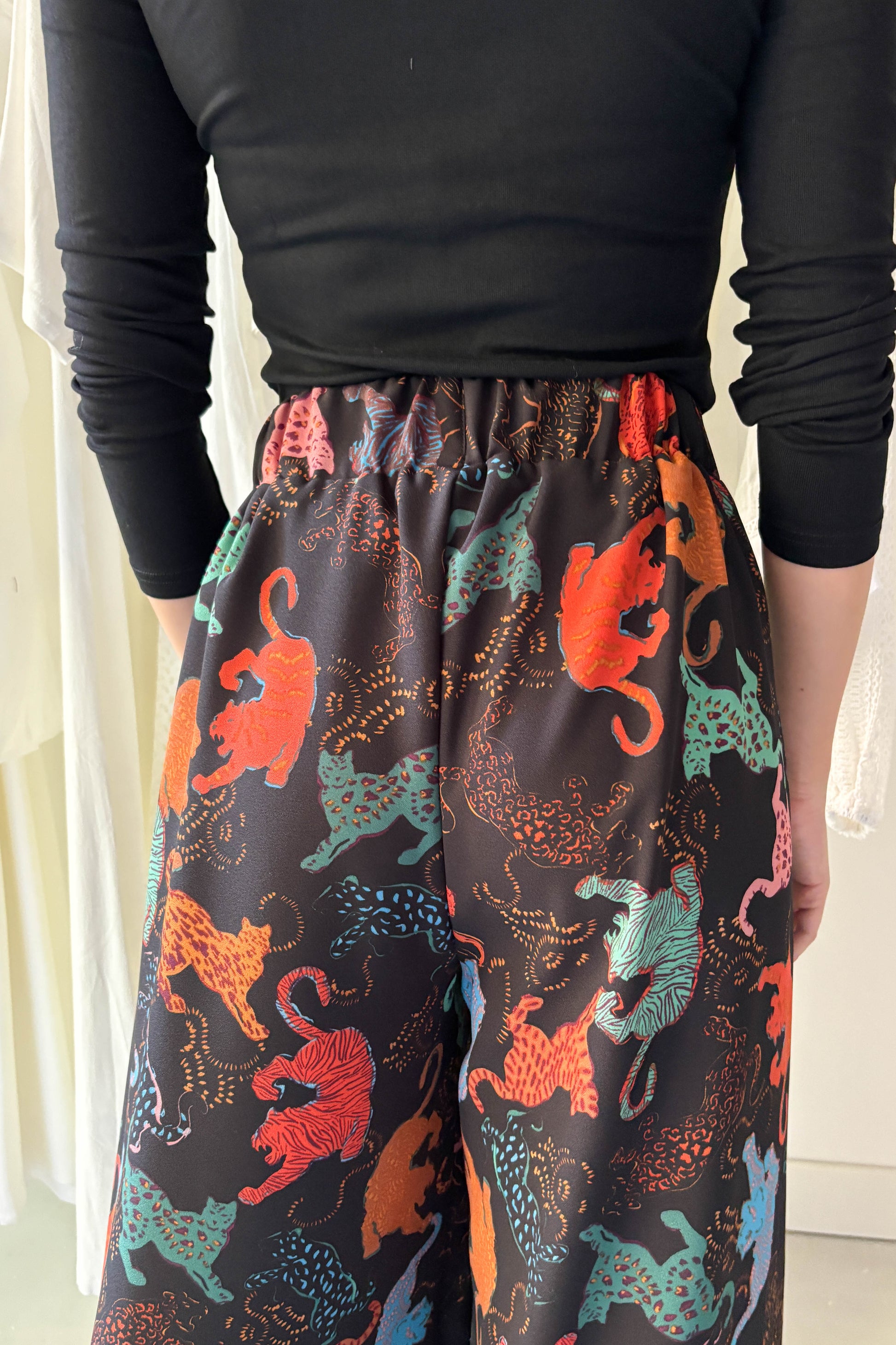 Lenge, elöl hajtásos nagrág, fekete alapon színes állat mintával. Derékon gumírozott, elasztikus. Bő szárú, zsebekkel ellátott. fazon.