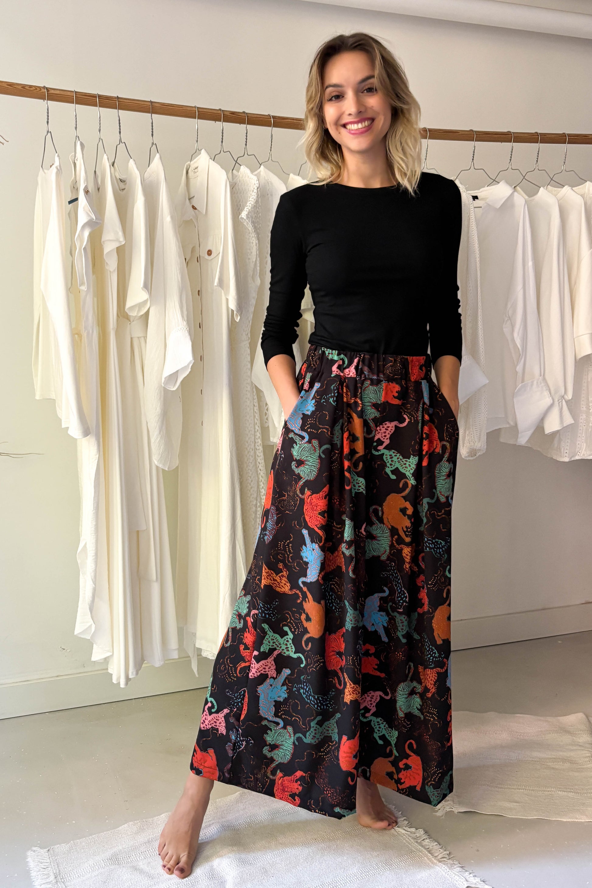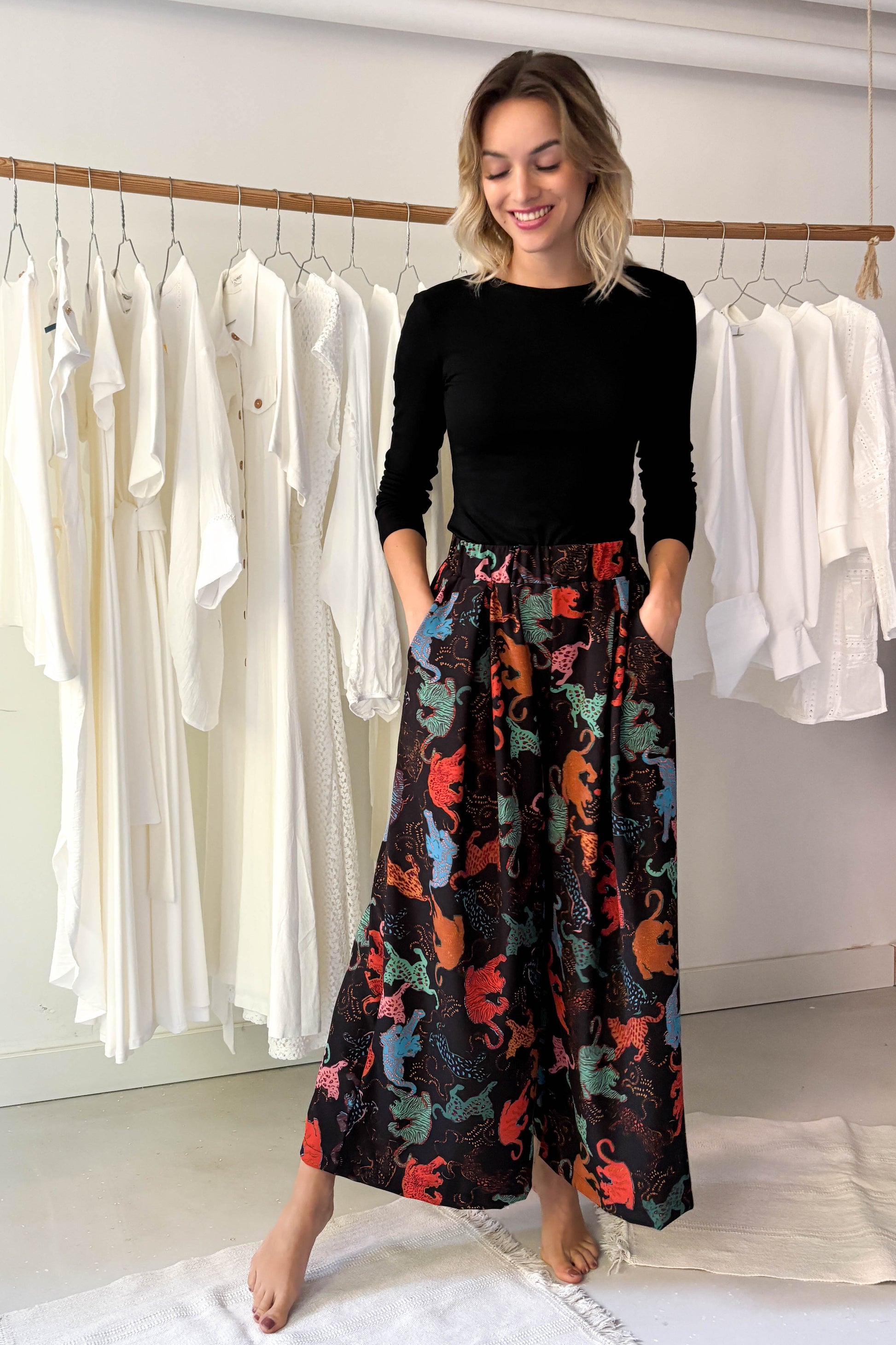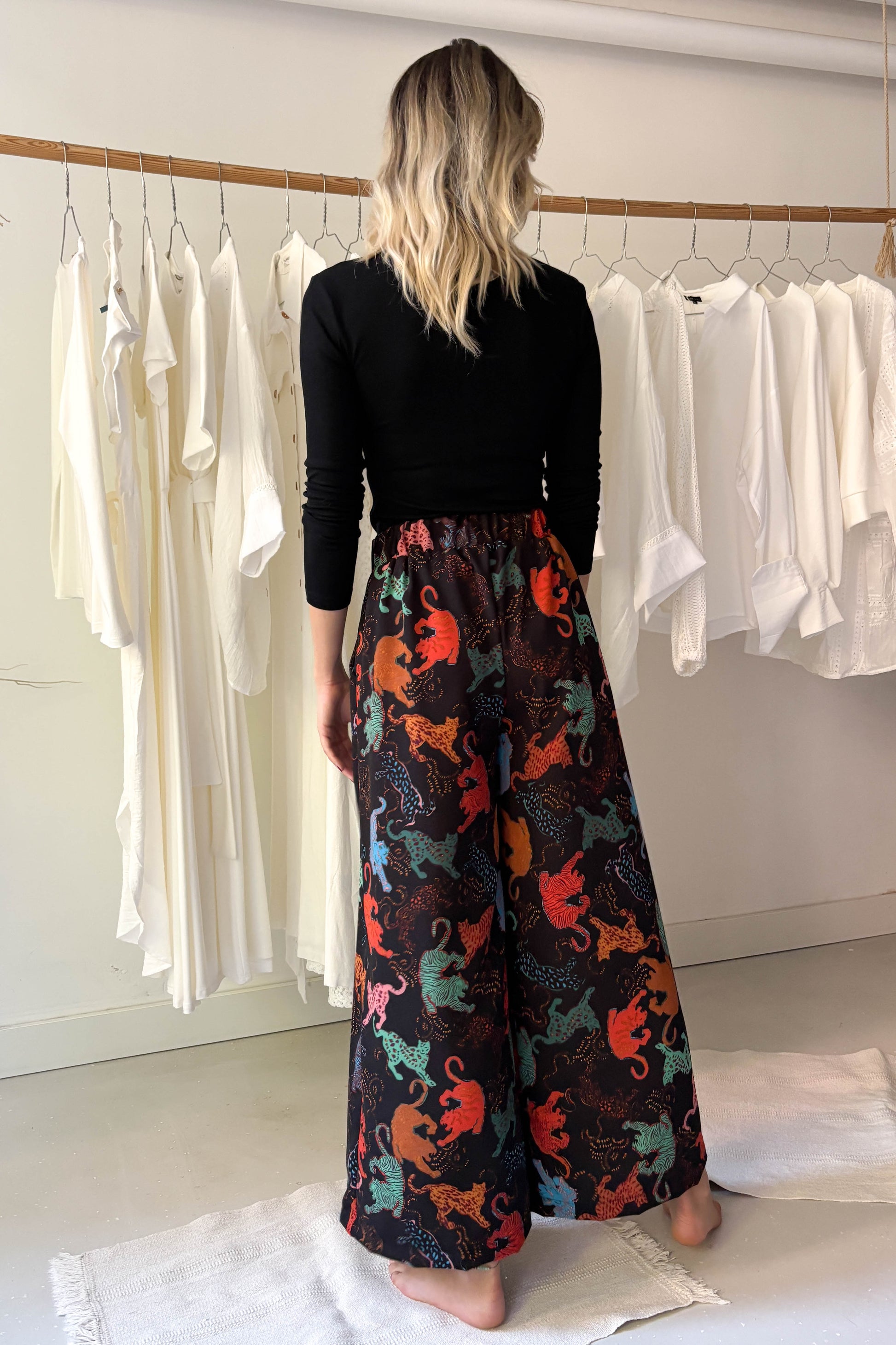 Lenge, elöl hajtásos nagrág, fekete alapon színes állat mintával. Derékon gumírozott, elasztikus. Bő szárú, zsebekkel ellátott. fazon.