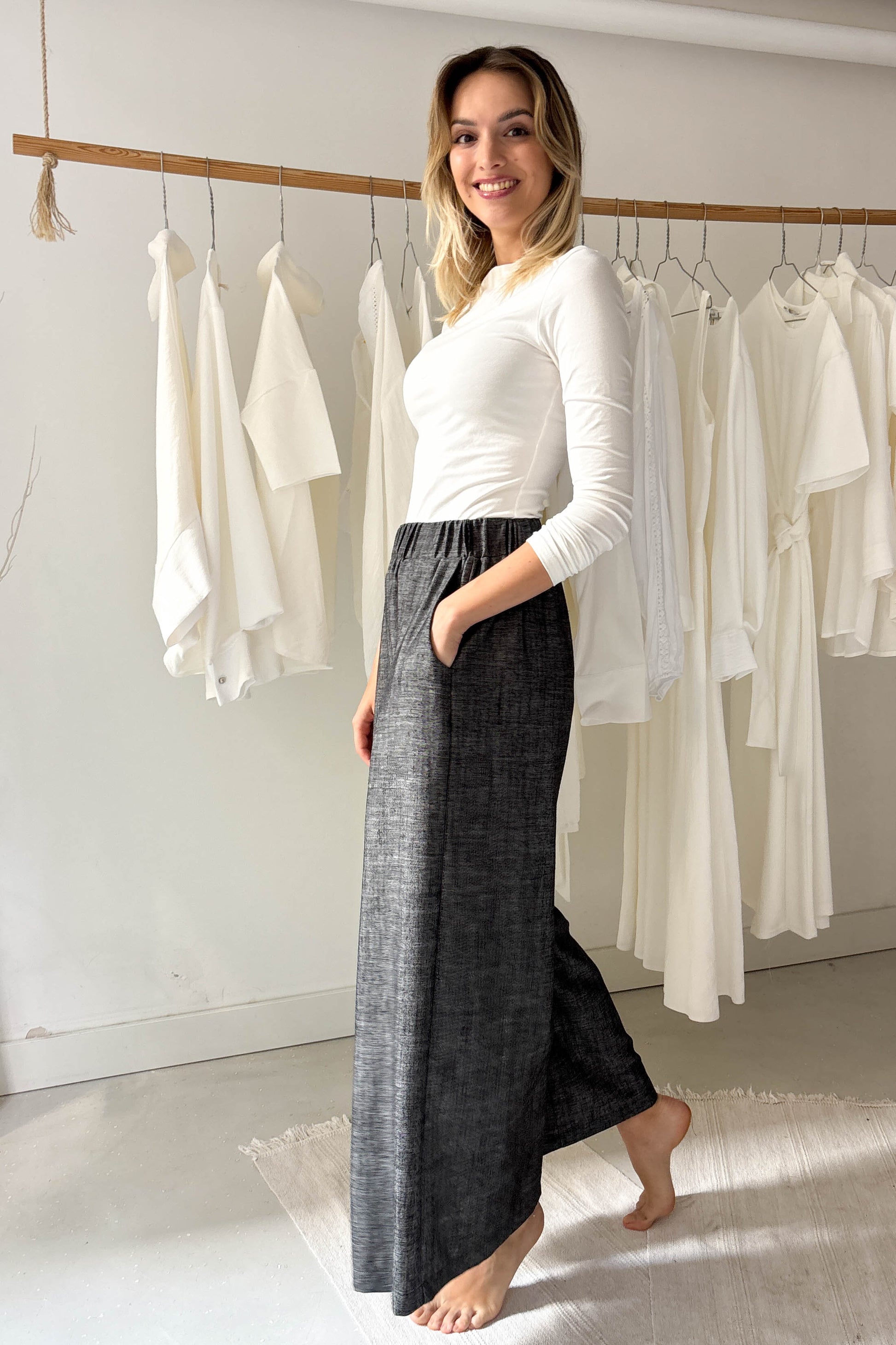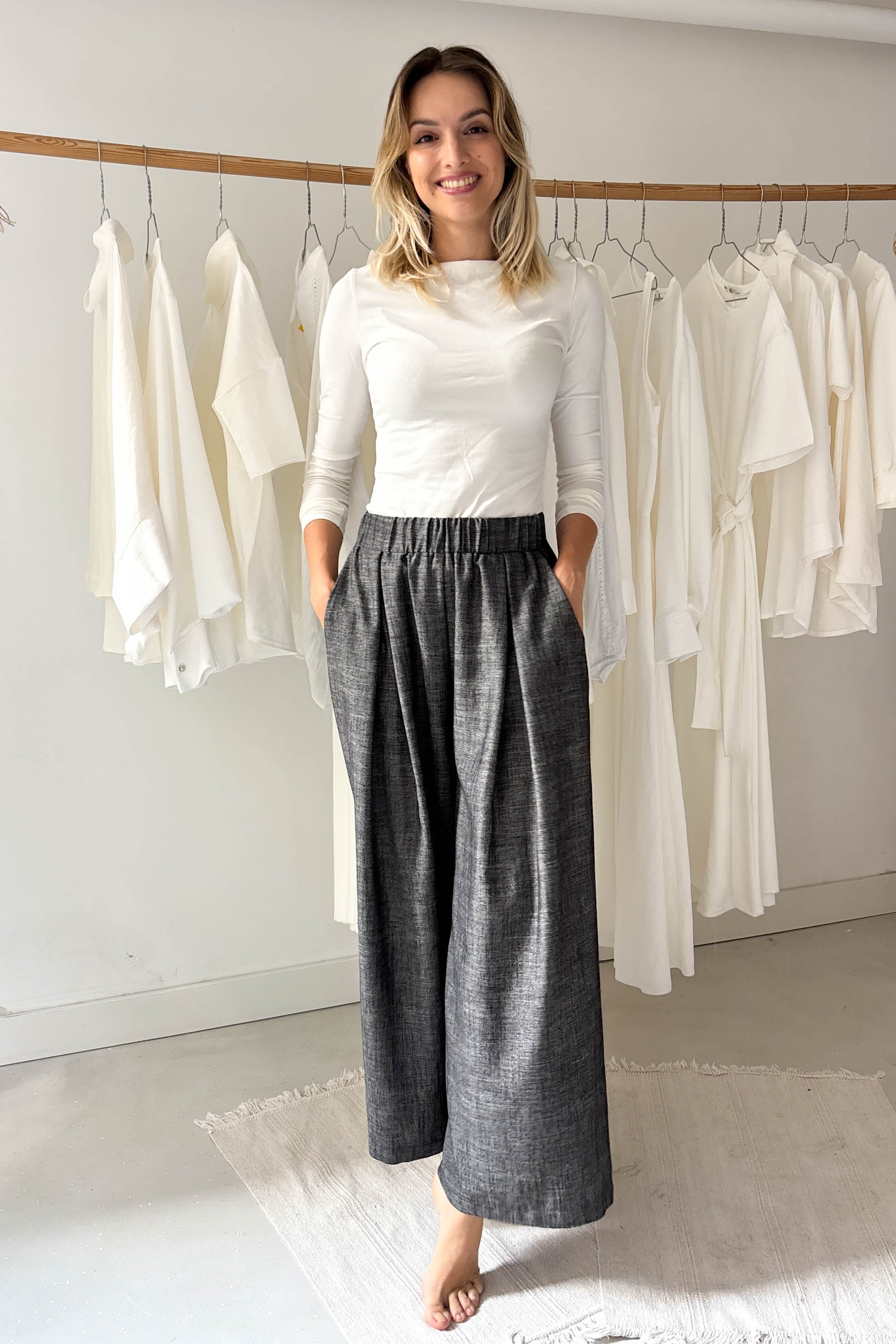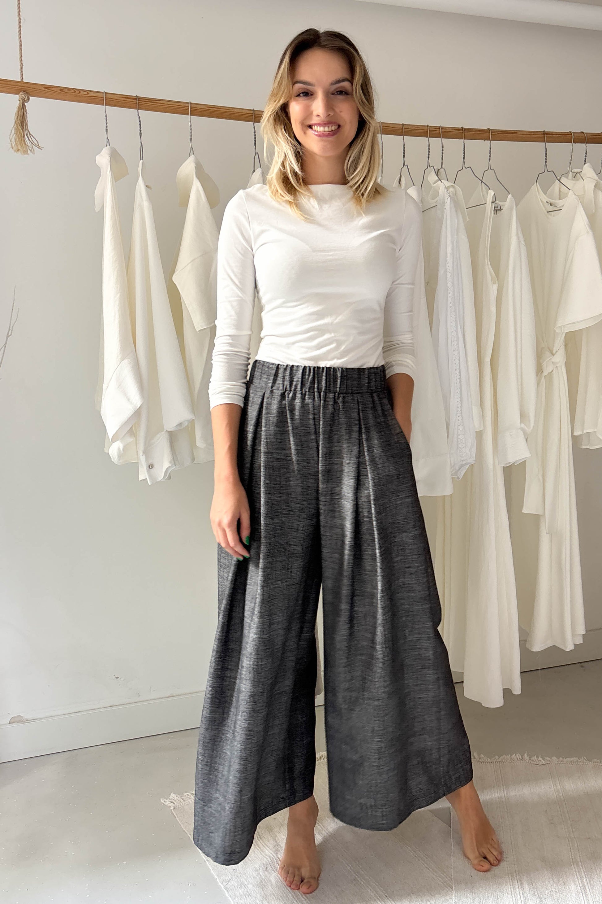 Cirmos szürke, lenge, elöl hajtásos nagrág. Derékon gumírozott, elasztikus. Bő szárú, zsebekkel ellátott fazon.
