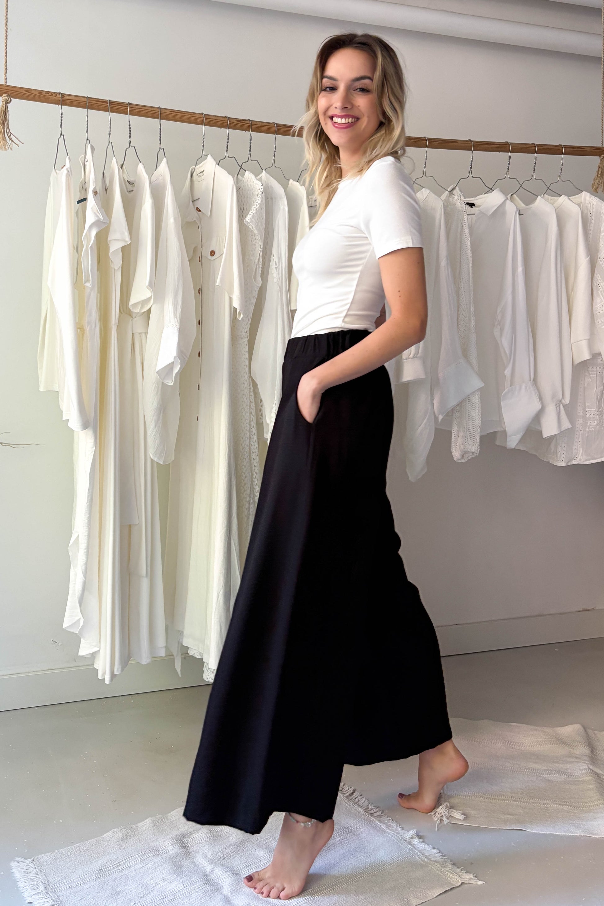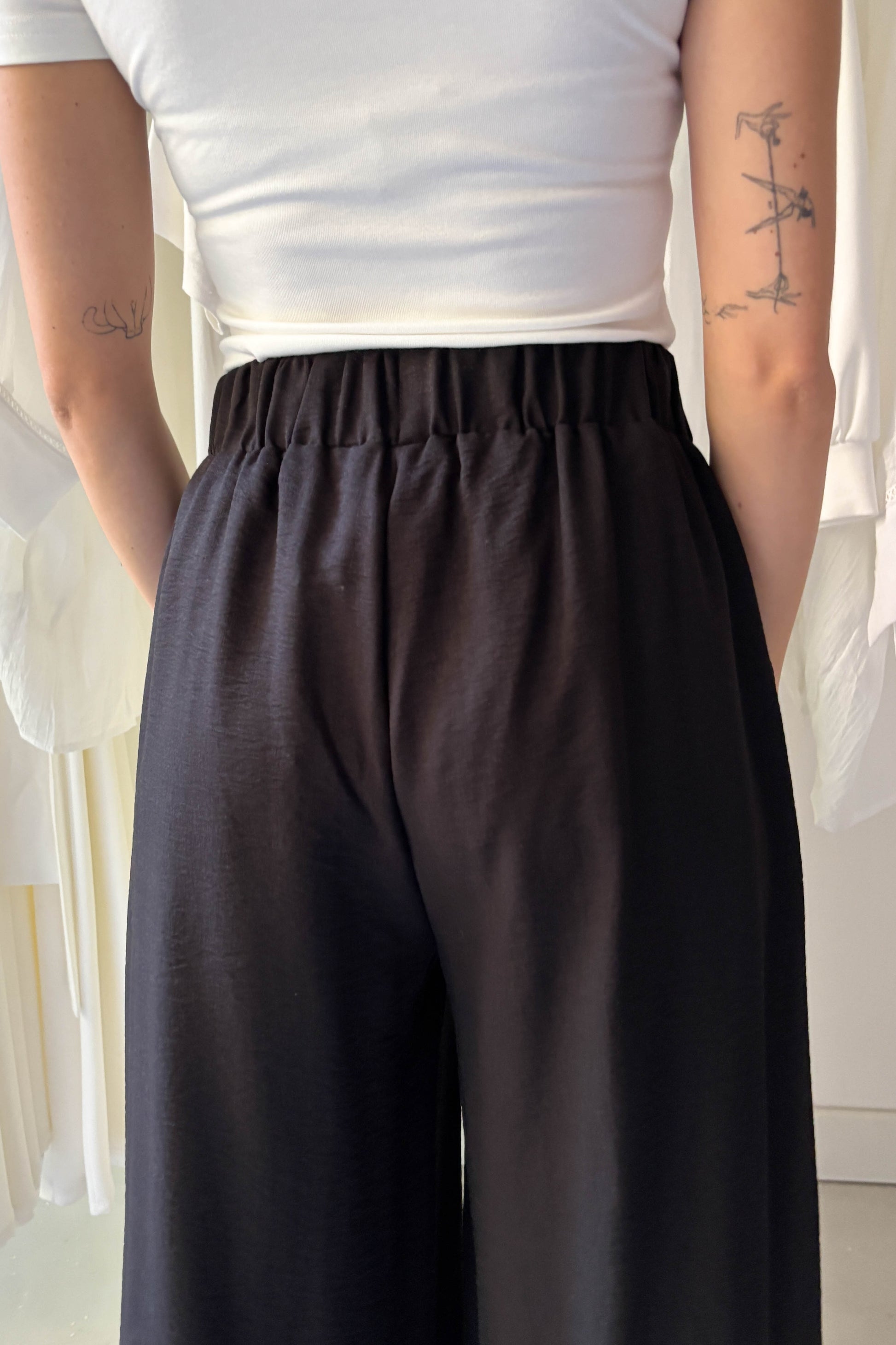 Fekete, lenge, elöl hajtásos nagrág. Derékon gumírozott, elasztikus. Bő szárú, zsebekkel ellátott. fazon.