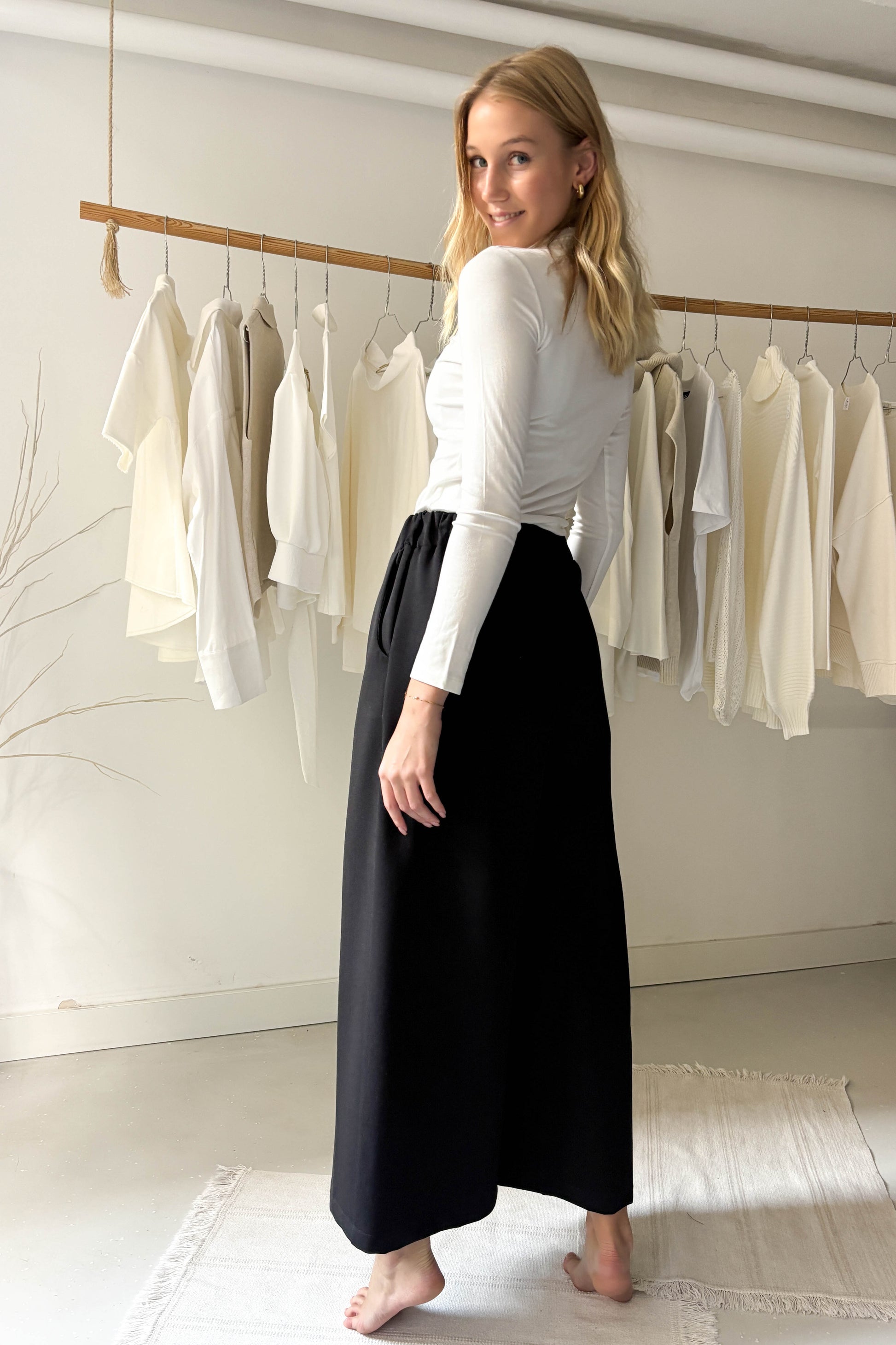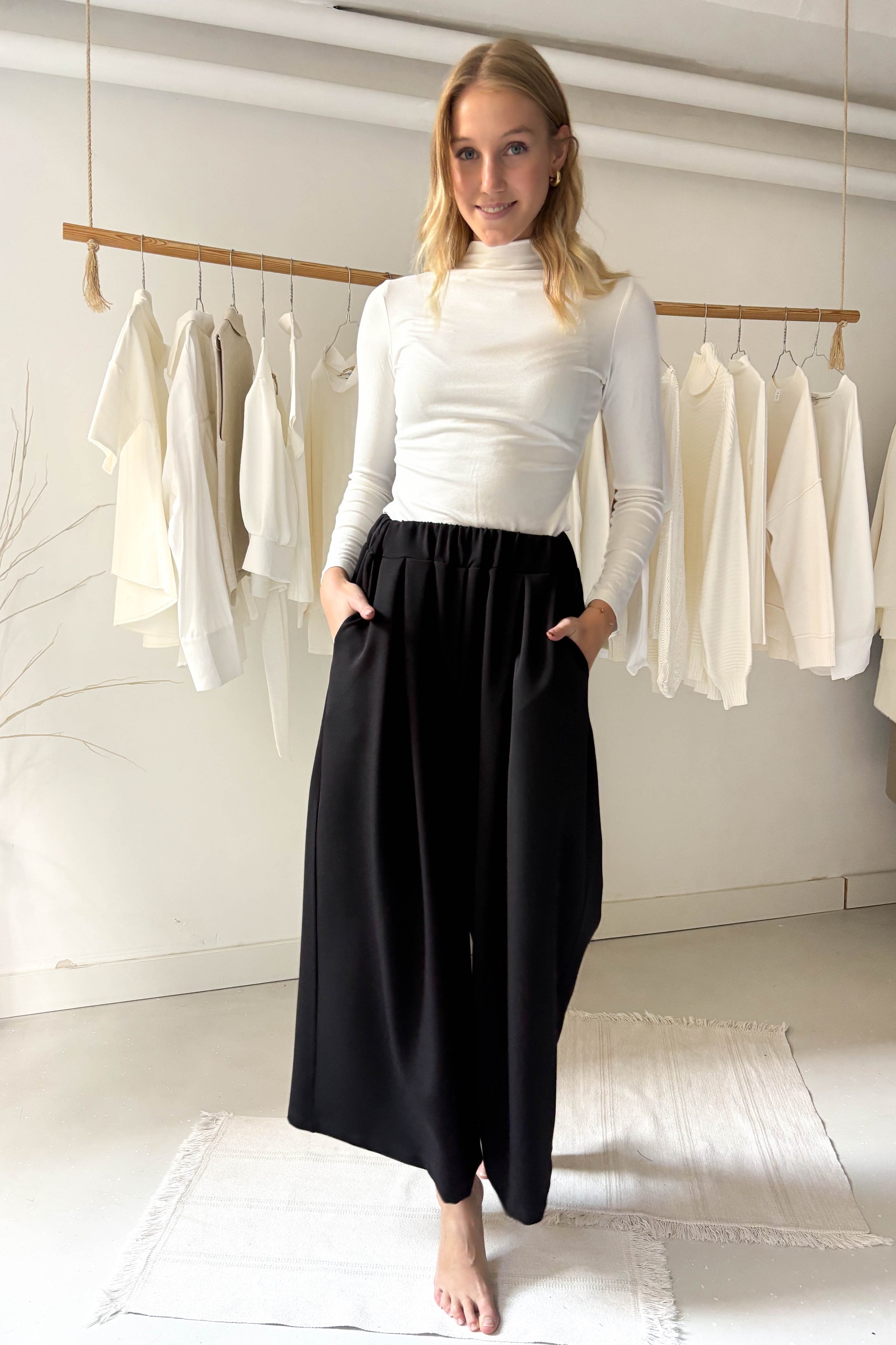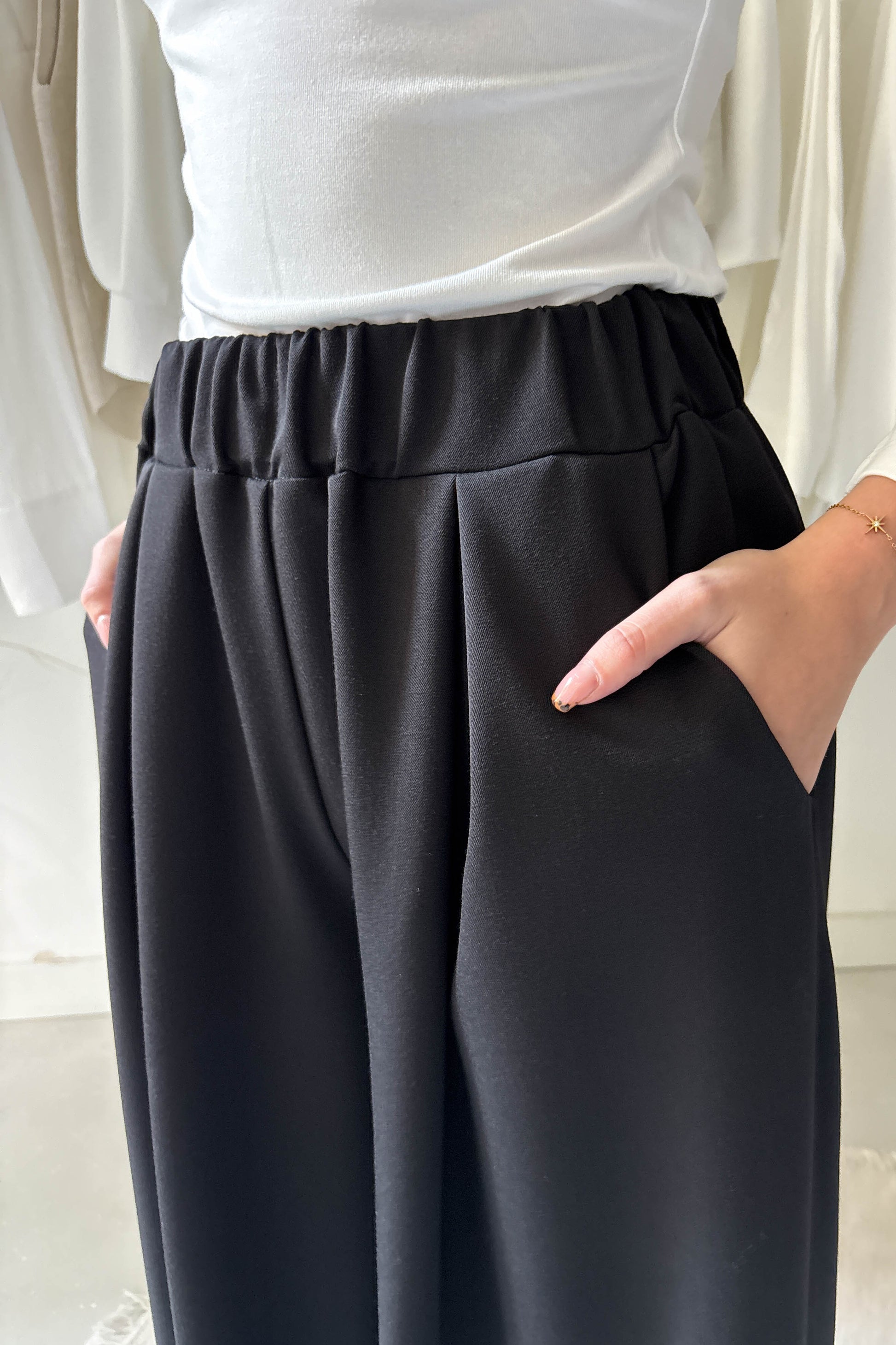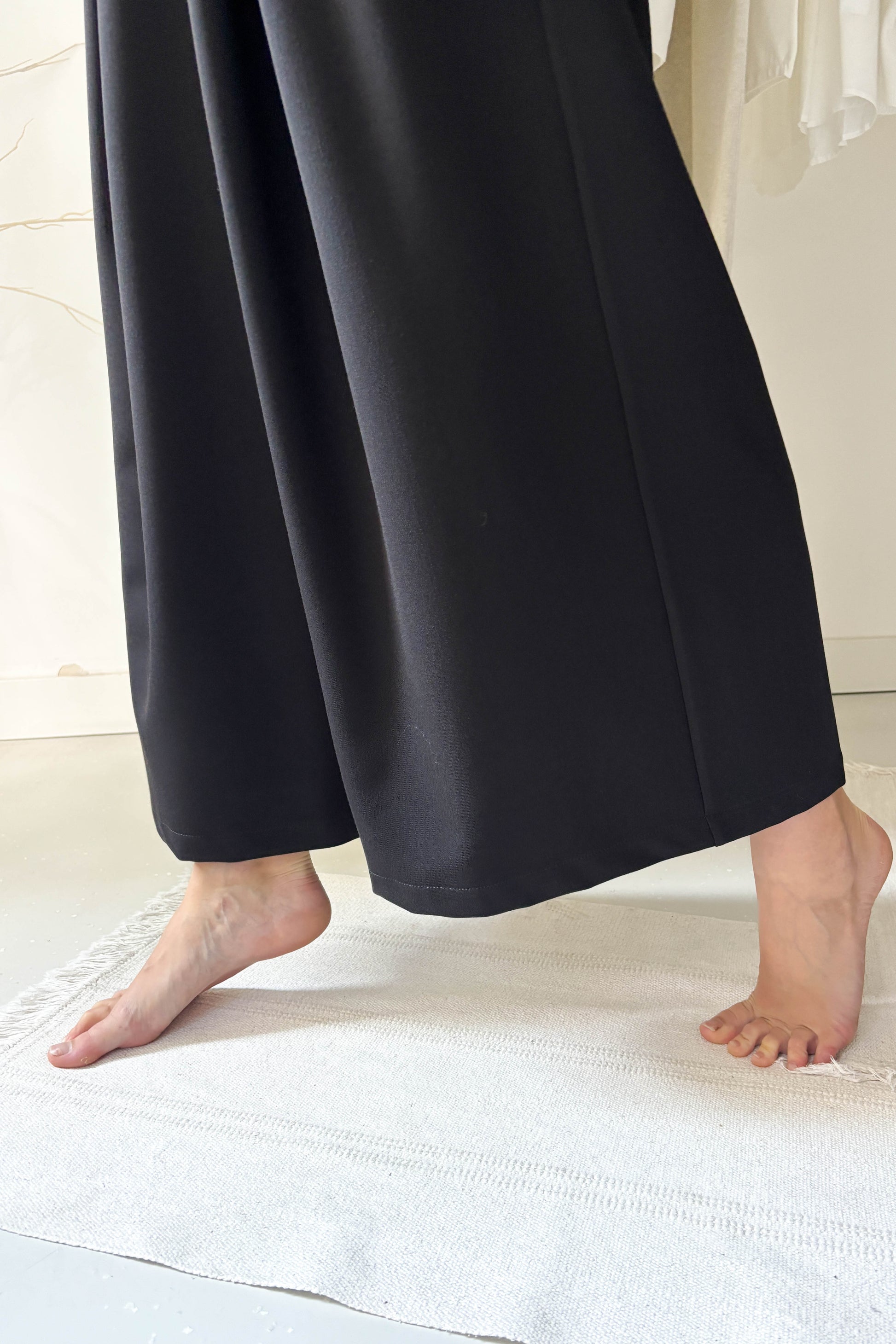 Fekete, elöl hajtásos nagrág. Derékon gumírozott, bő szárú, zsebekkel ellátott fazon.