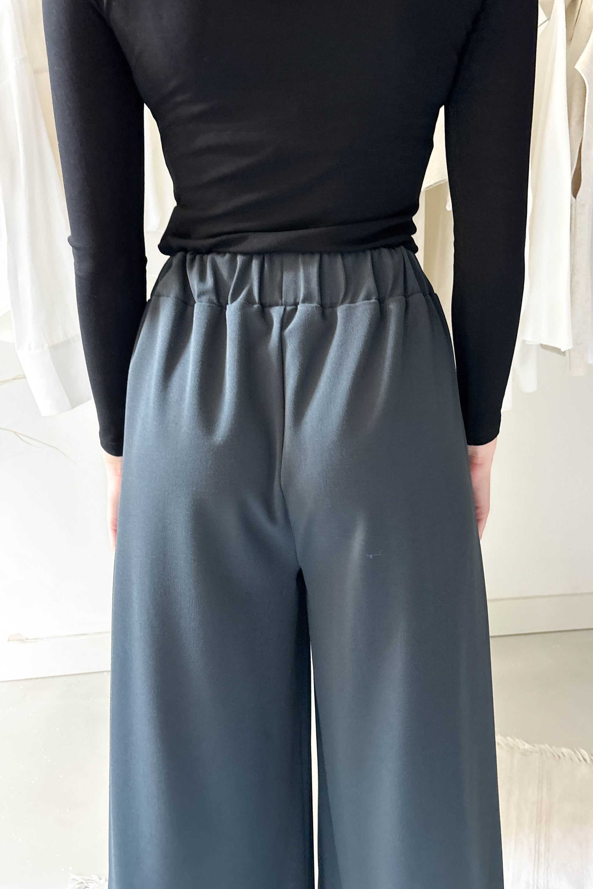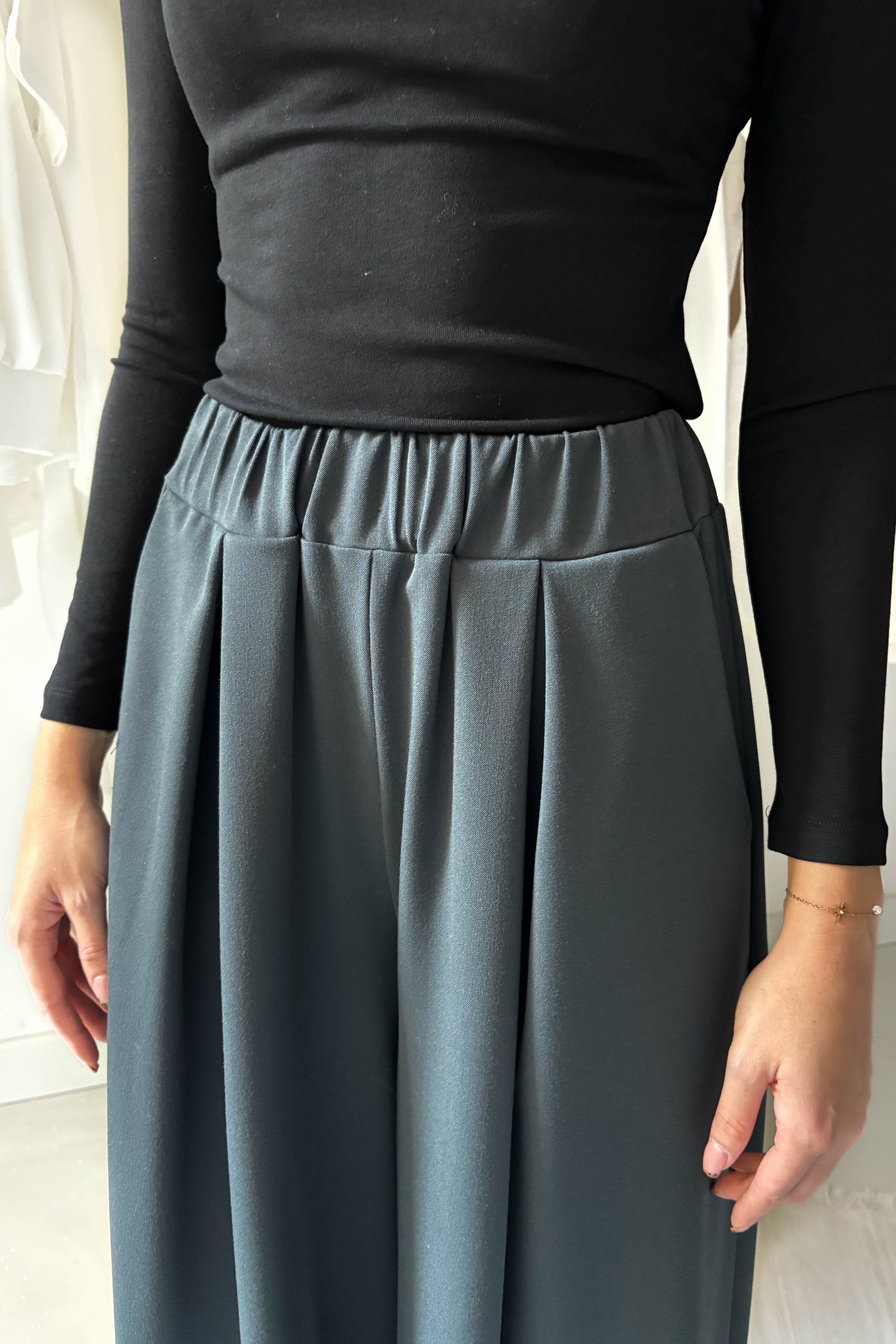 Lenge, elöl hajtásos nagrág, petrolzöld színben. Derékon gumírozott, bő szárú, zsebekkel ellátott fazon.