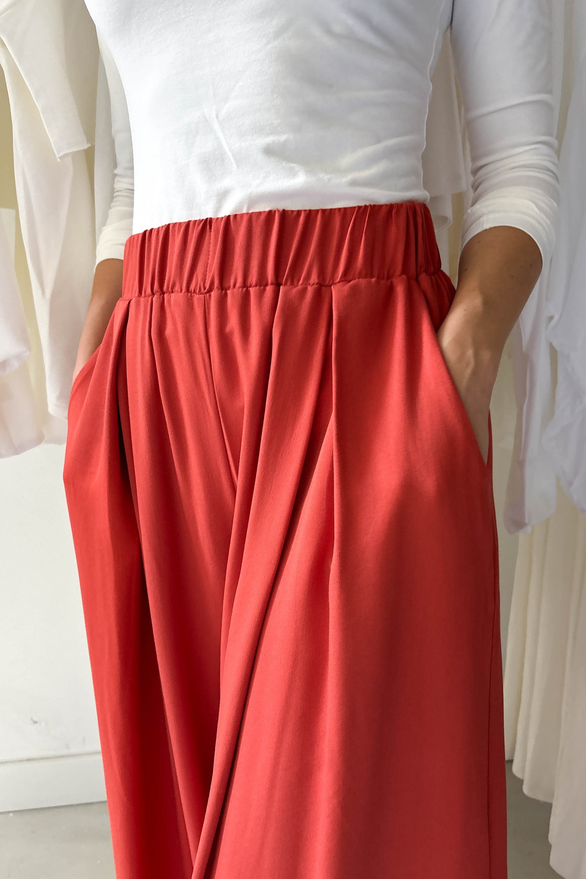 Lenge, elöl hajtásos nagrág téglavörös színben. Derékon gumírozott, elasztikus. Bő szárú, zsebekkel ellátott fazon.