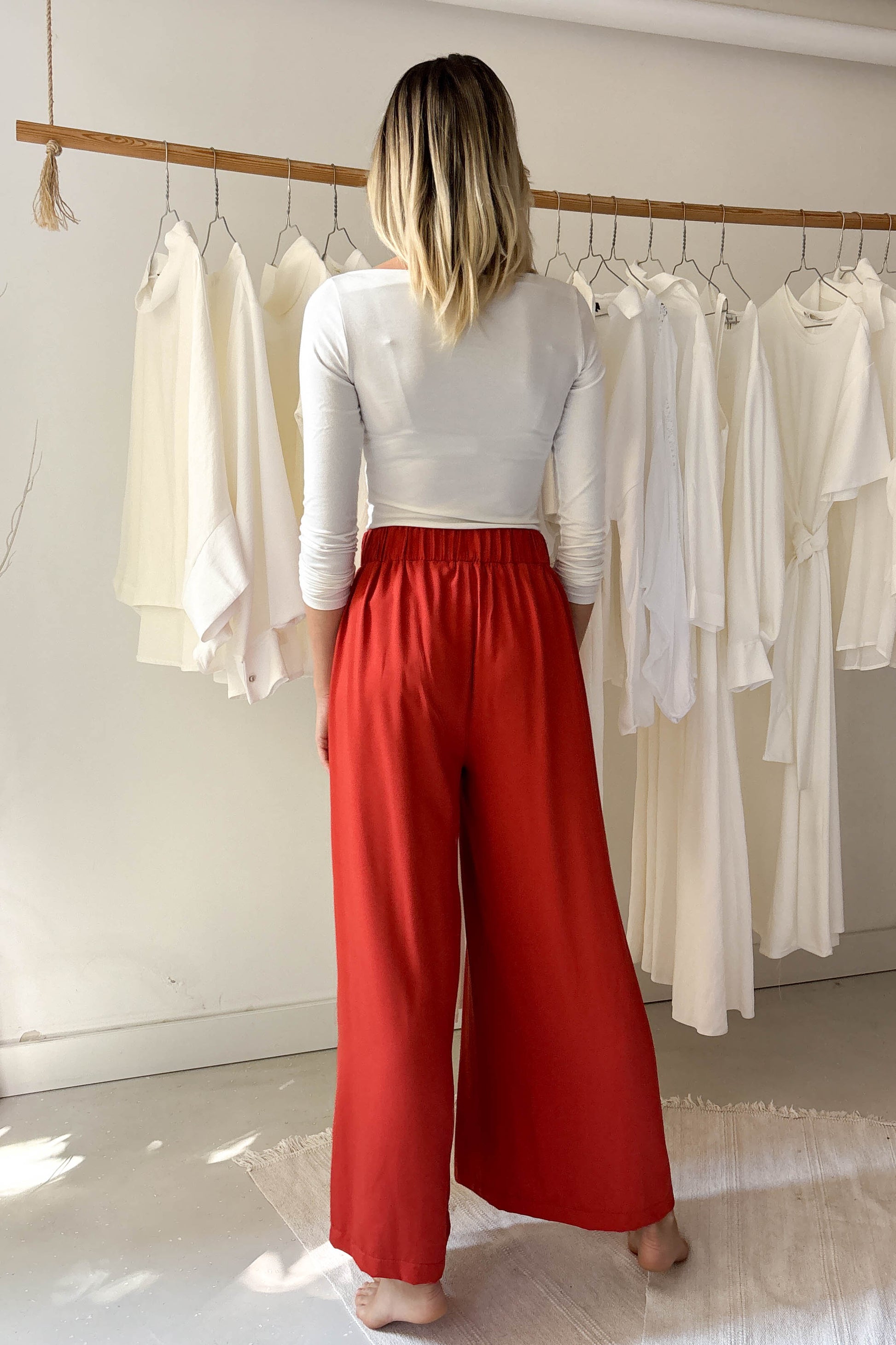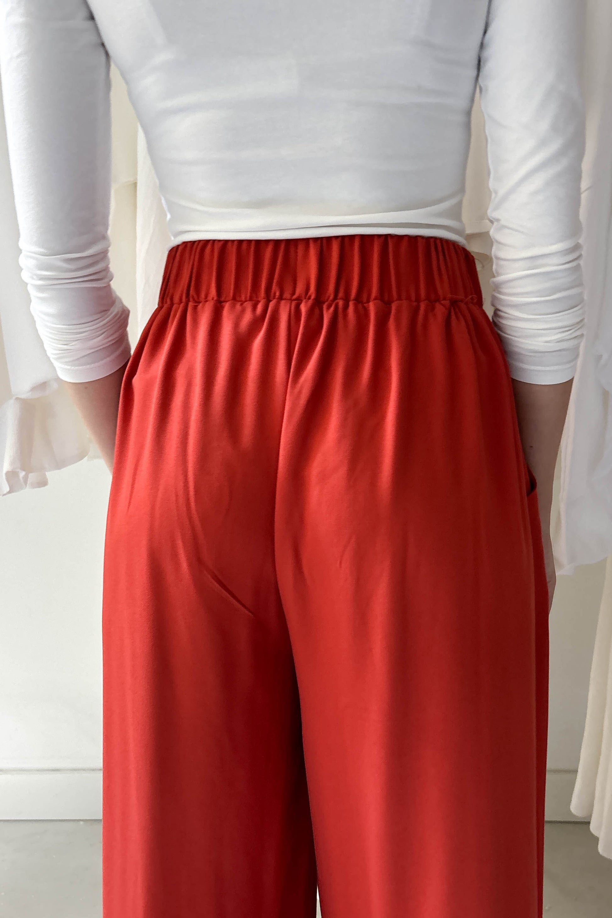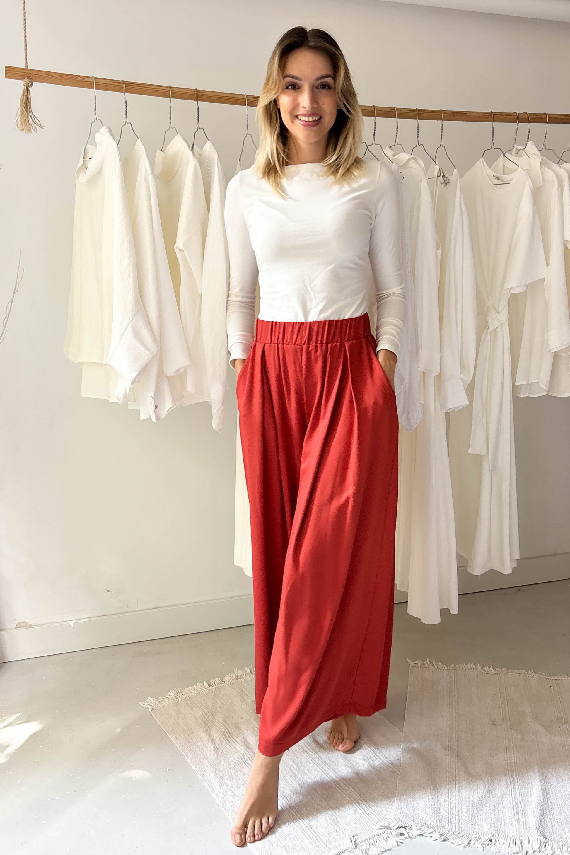 Elöl hajtásos lenge nadrág-téglavörös színben