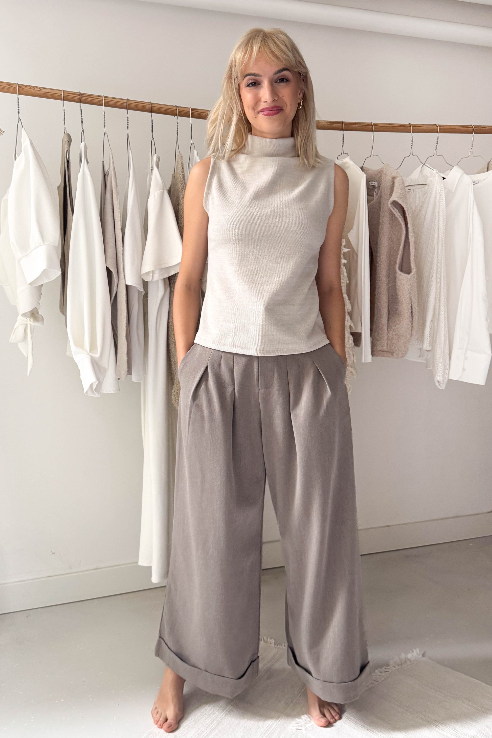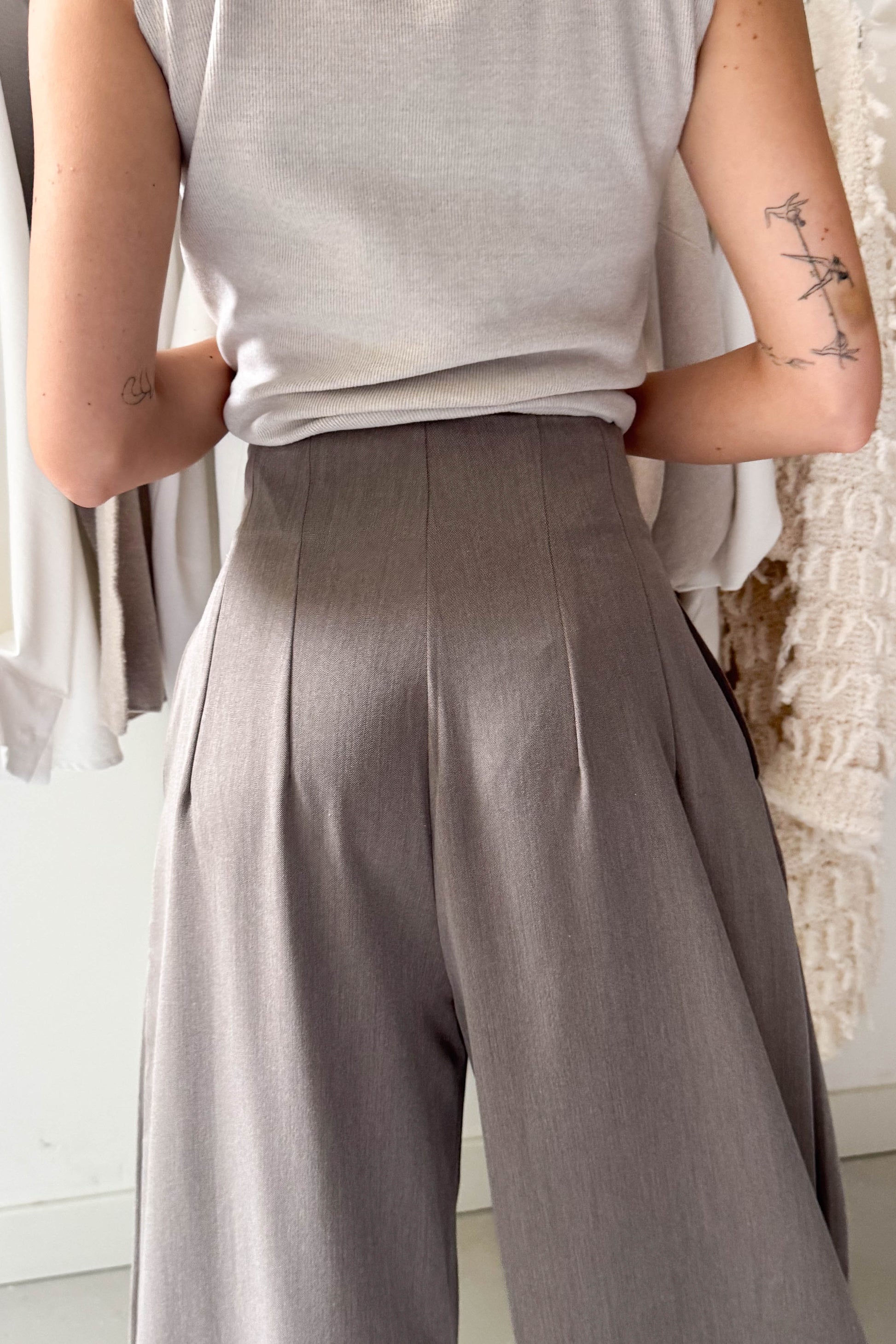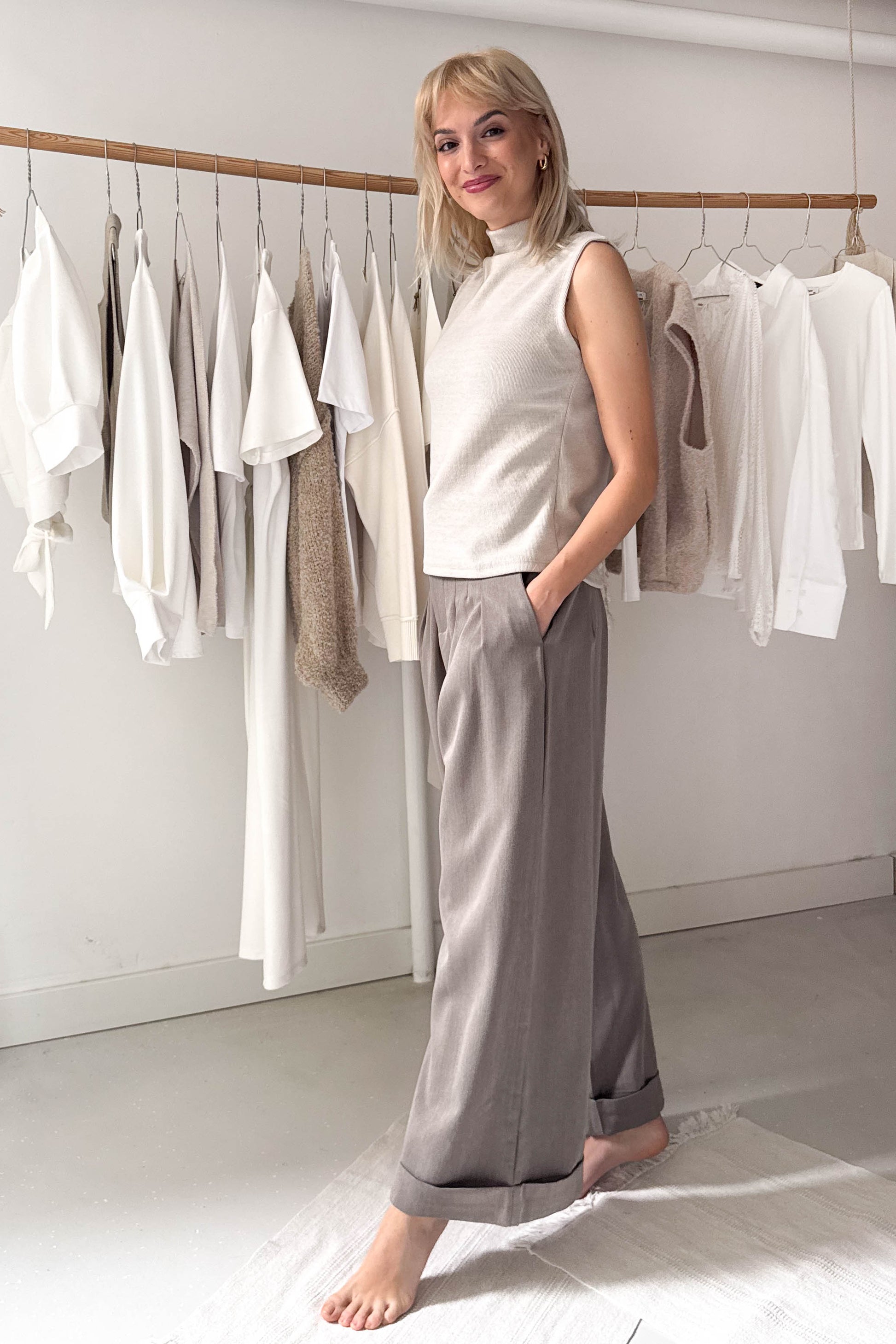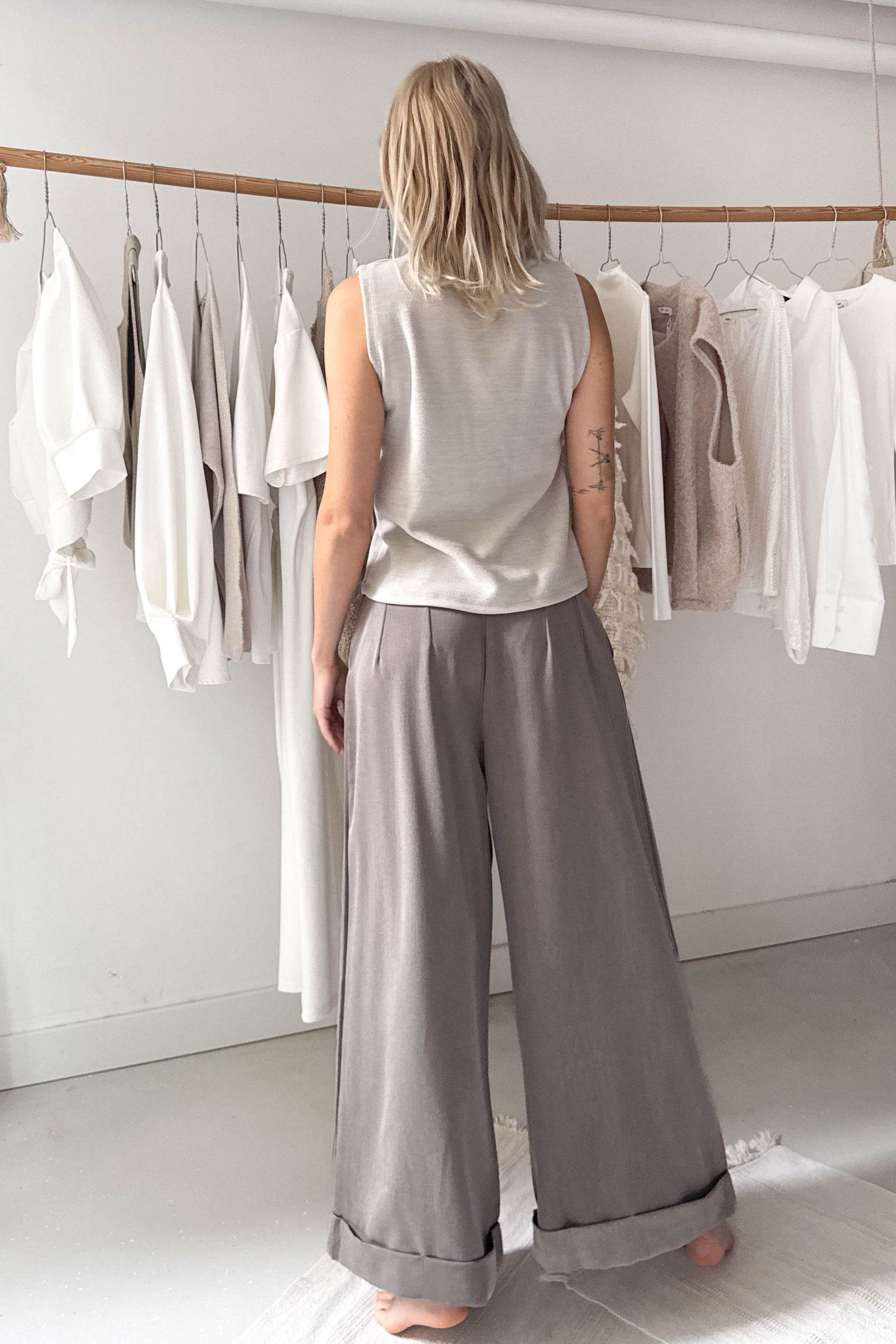 Elöl-hátul hajtásos, bőszárú, zsebes nadrág, füstbarna színben. Elöl cipzáros, alul visszahatjtott fazon.