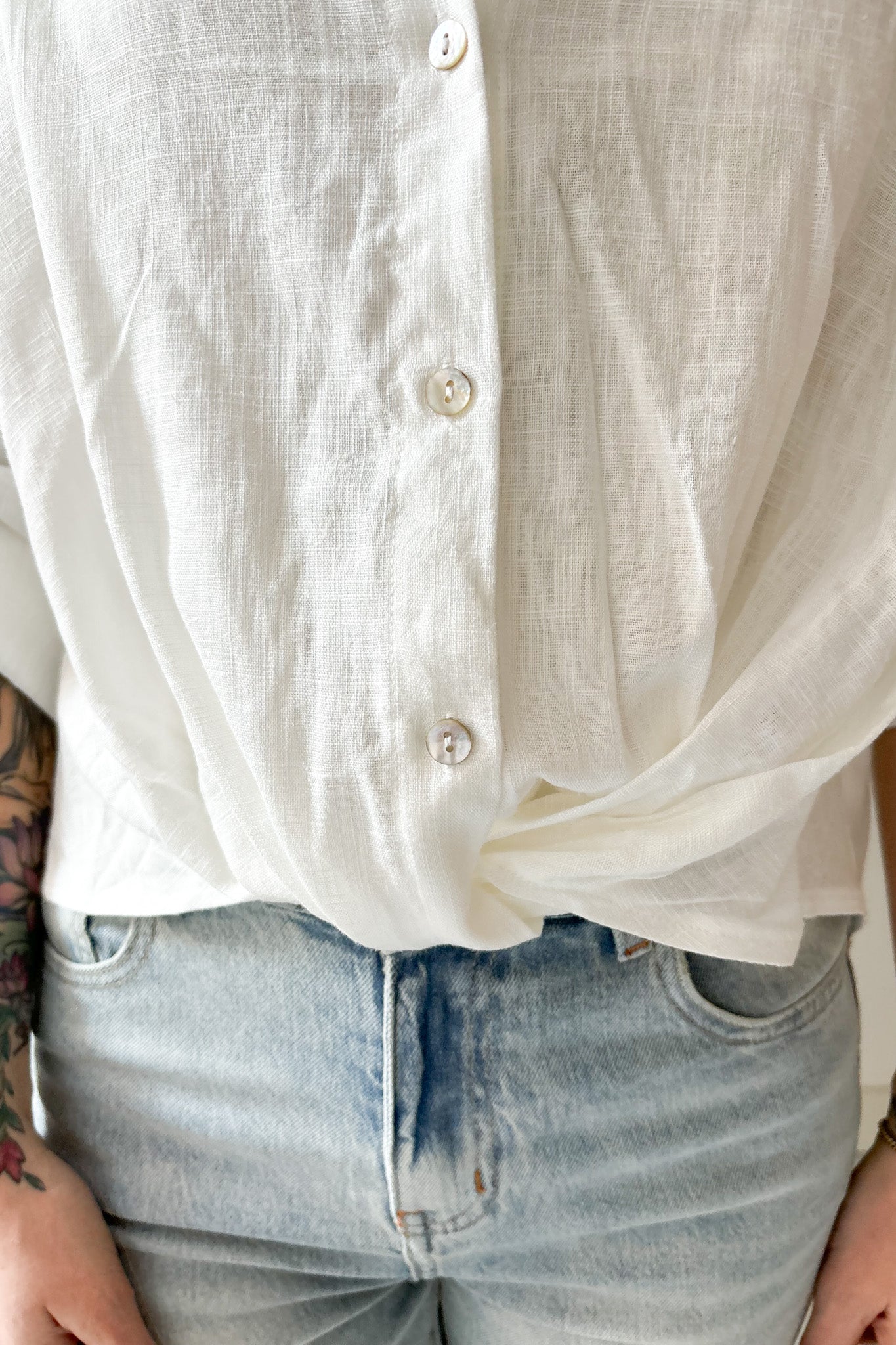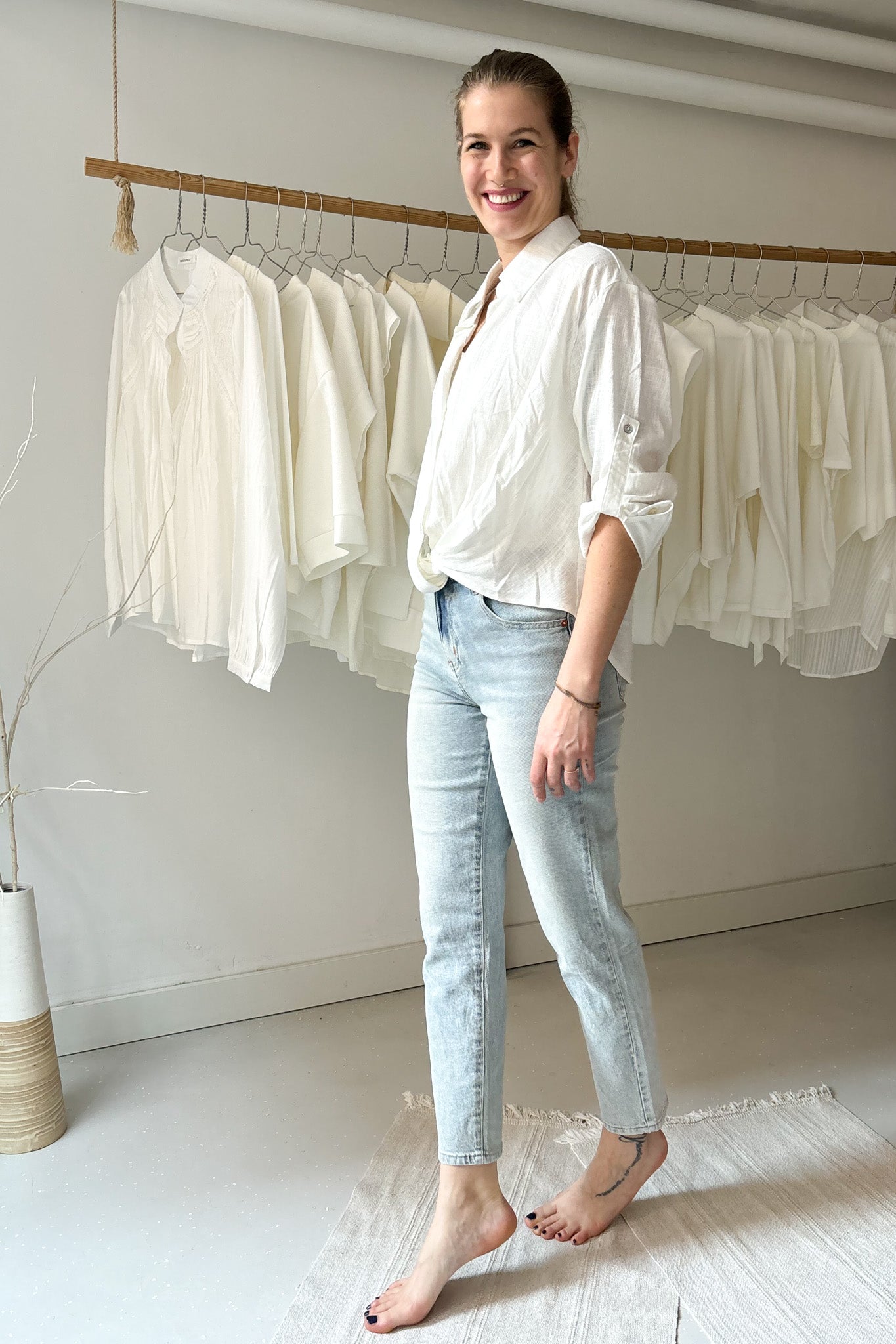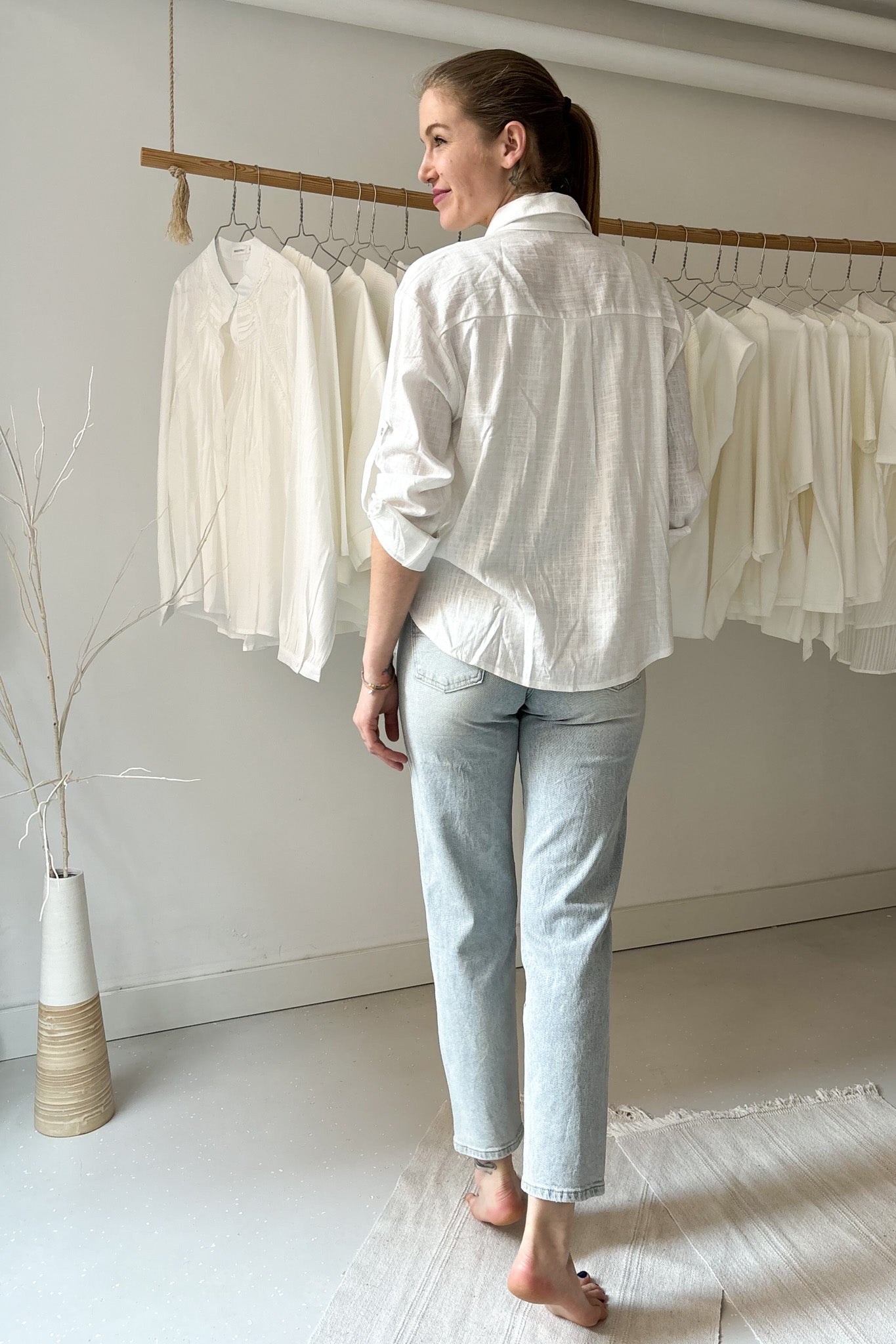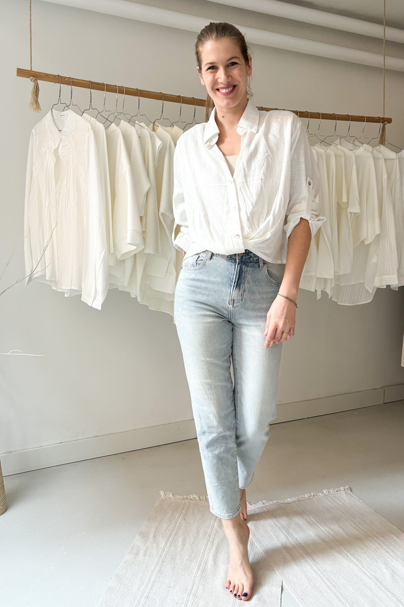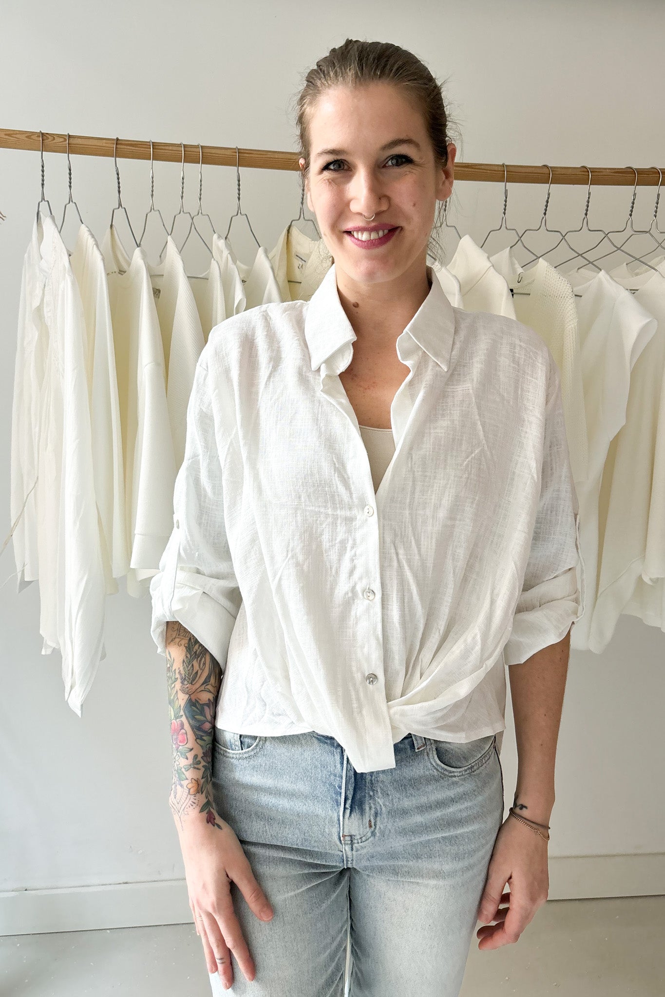 Texturált, laza ing fehér színben. Galléros, elől fixen csavart, hátul hosszabb, lekerekített fazon.