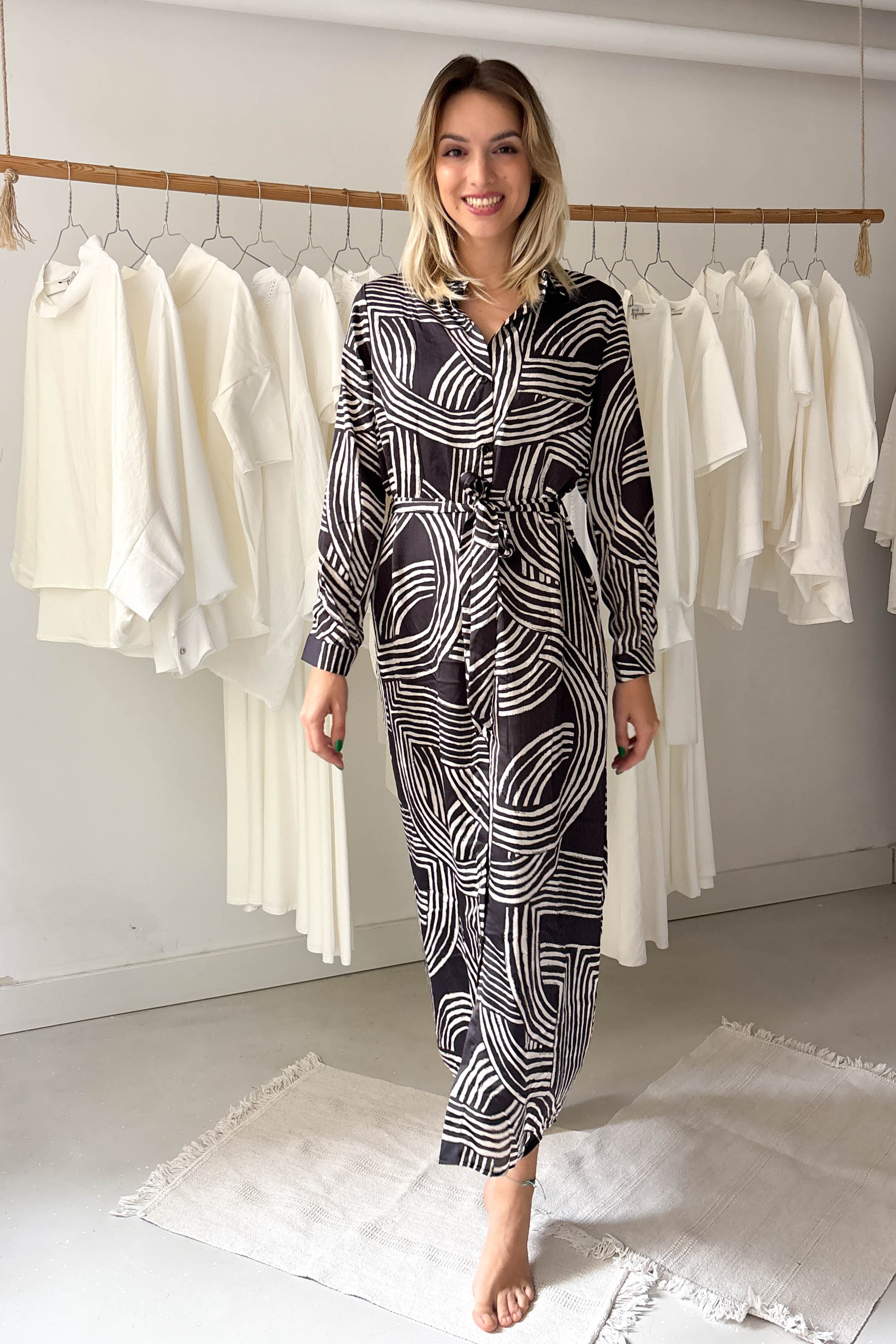 Galléros, hosszúujjú ingruha. Középen és az ujjak végén apró gombokkal záródik. Derékon megkötővel ellátott fazon. Áttetsző anyag, ezért az ujjak kivételével bélelt szabás.