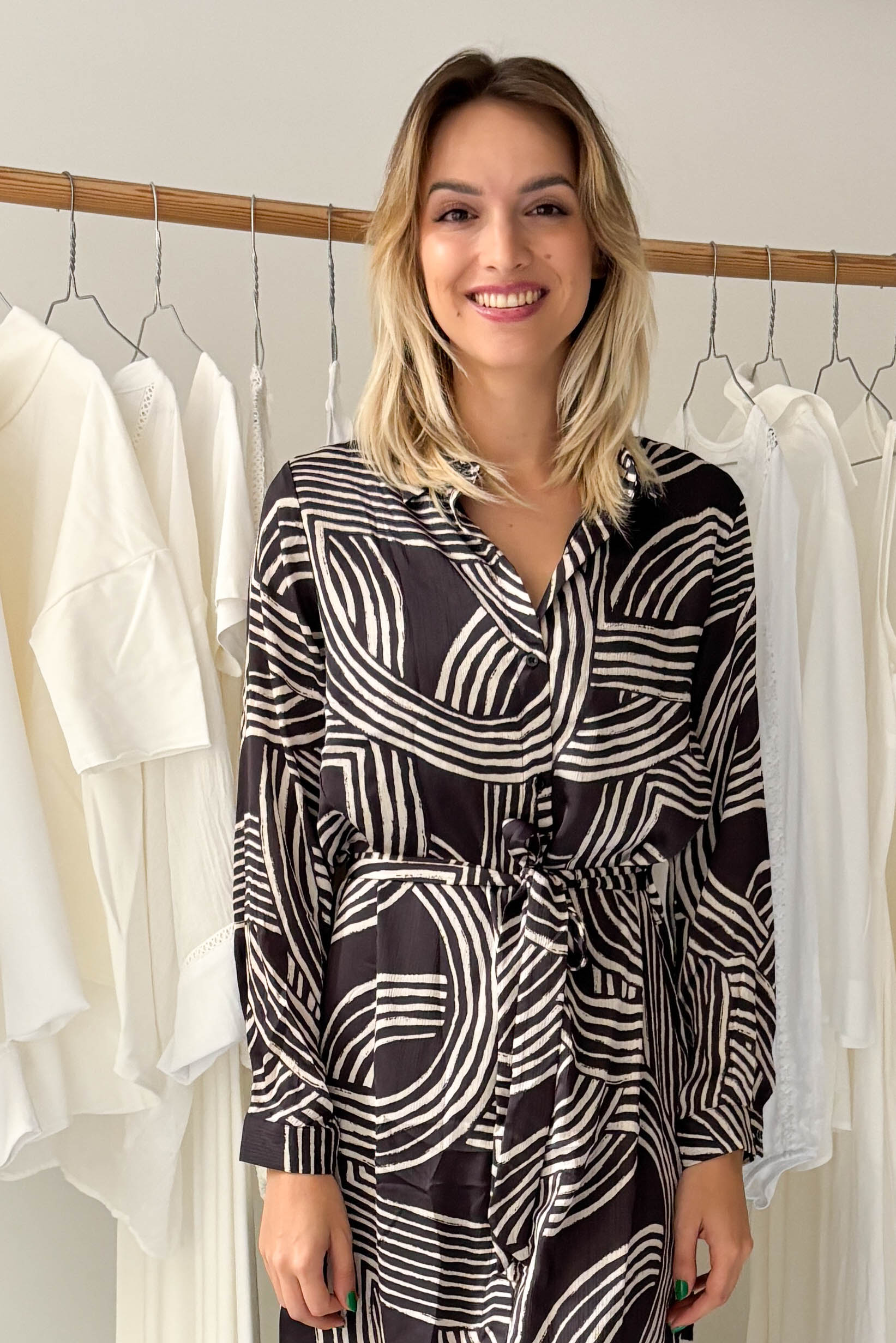 A modell 174 cm magas, a ruha pedig S/M méret.