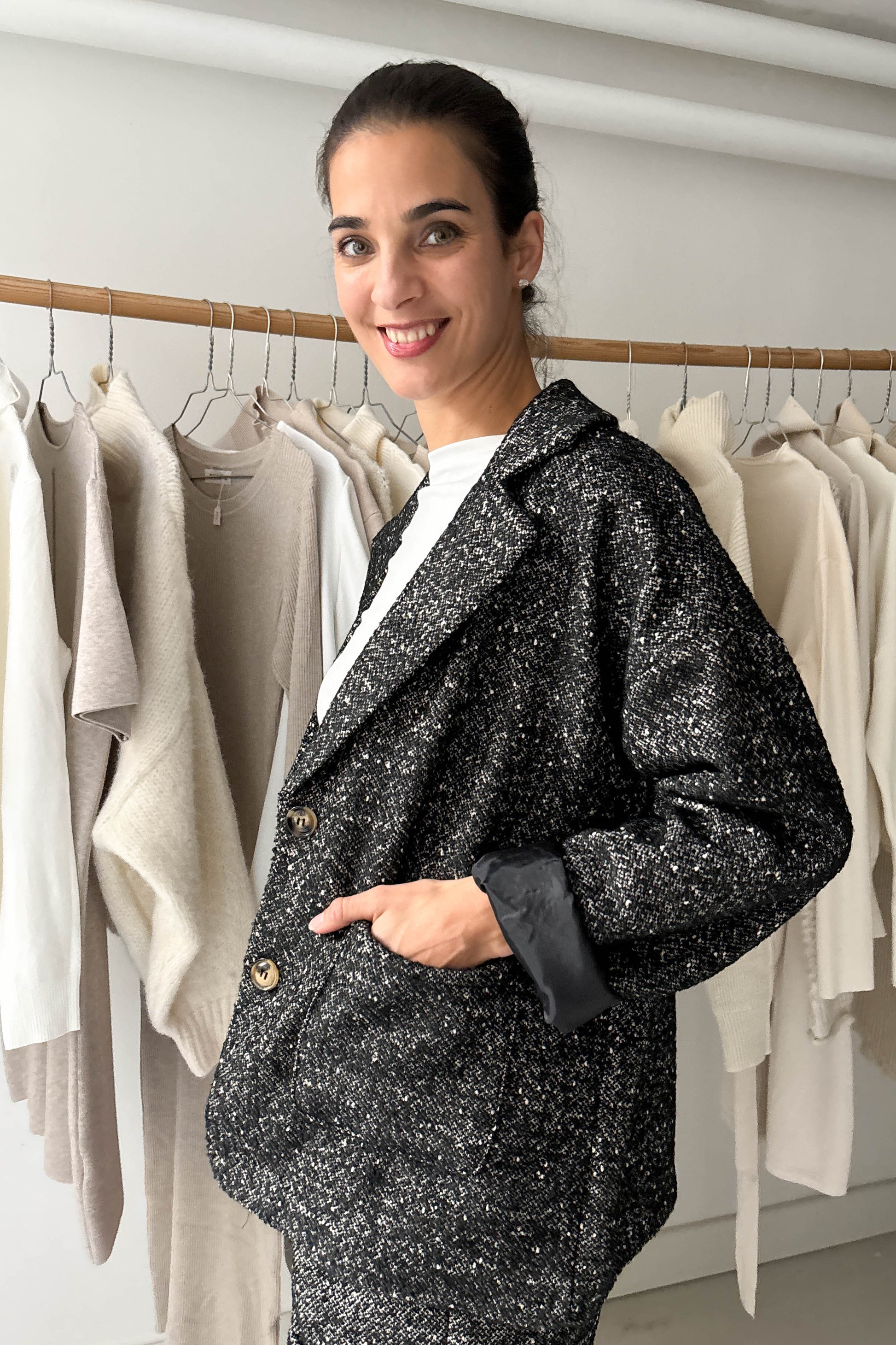 A modell 178 cm magas, a blézer pedig egyméretes.