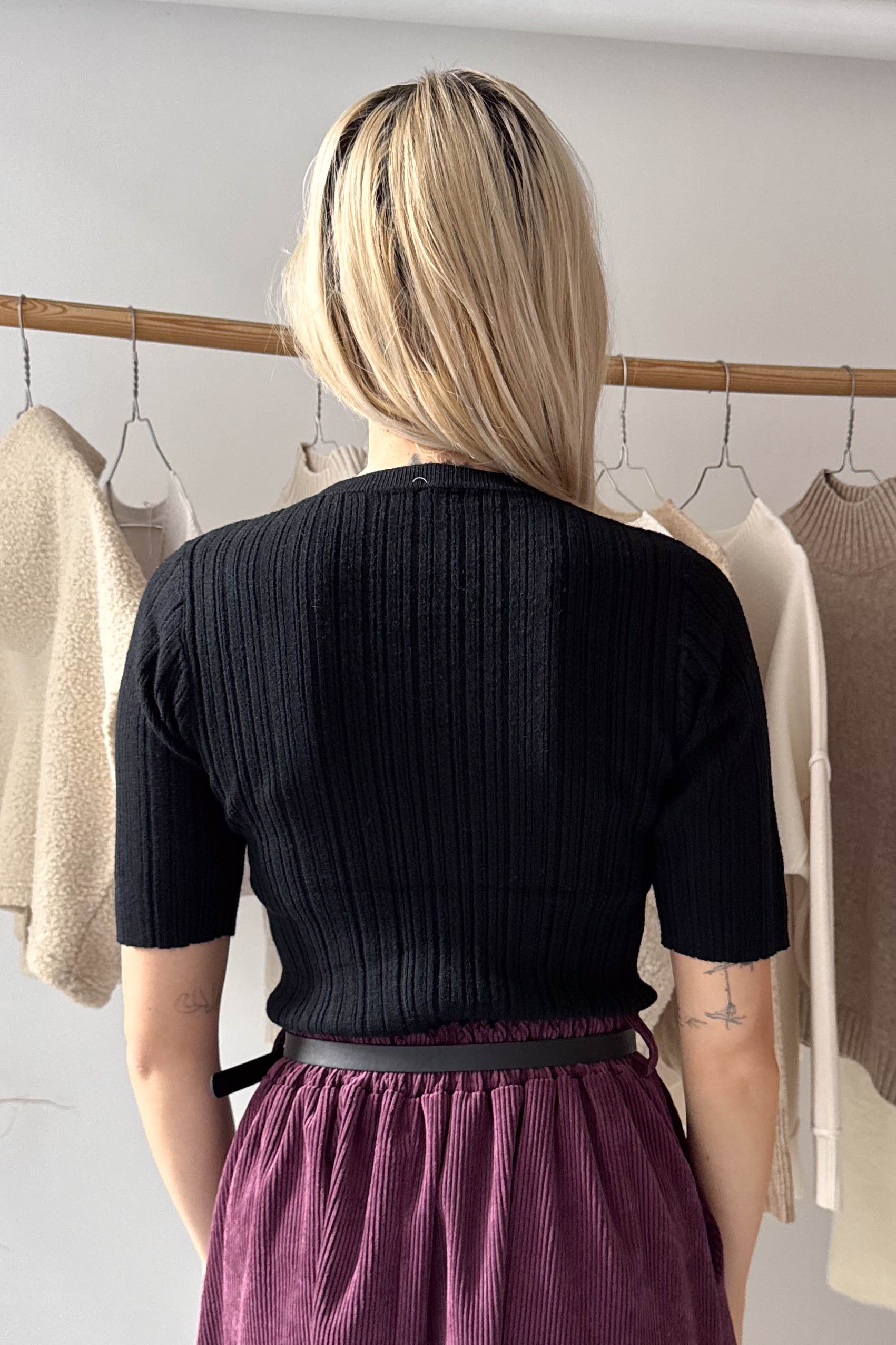 Bordás kötött, kereknyakú, rövidujjú, fekete felső.