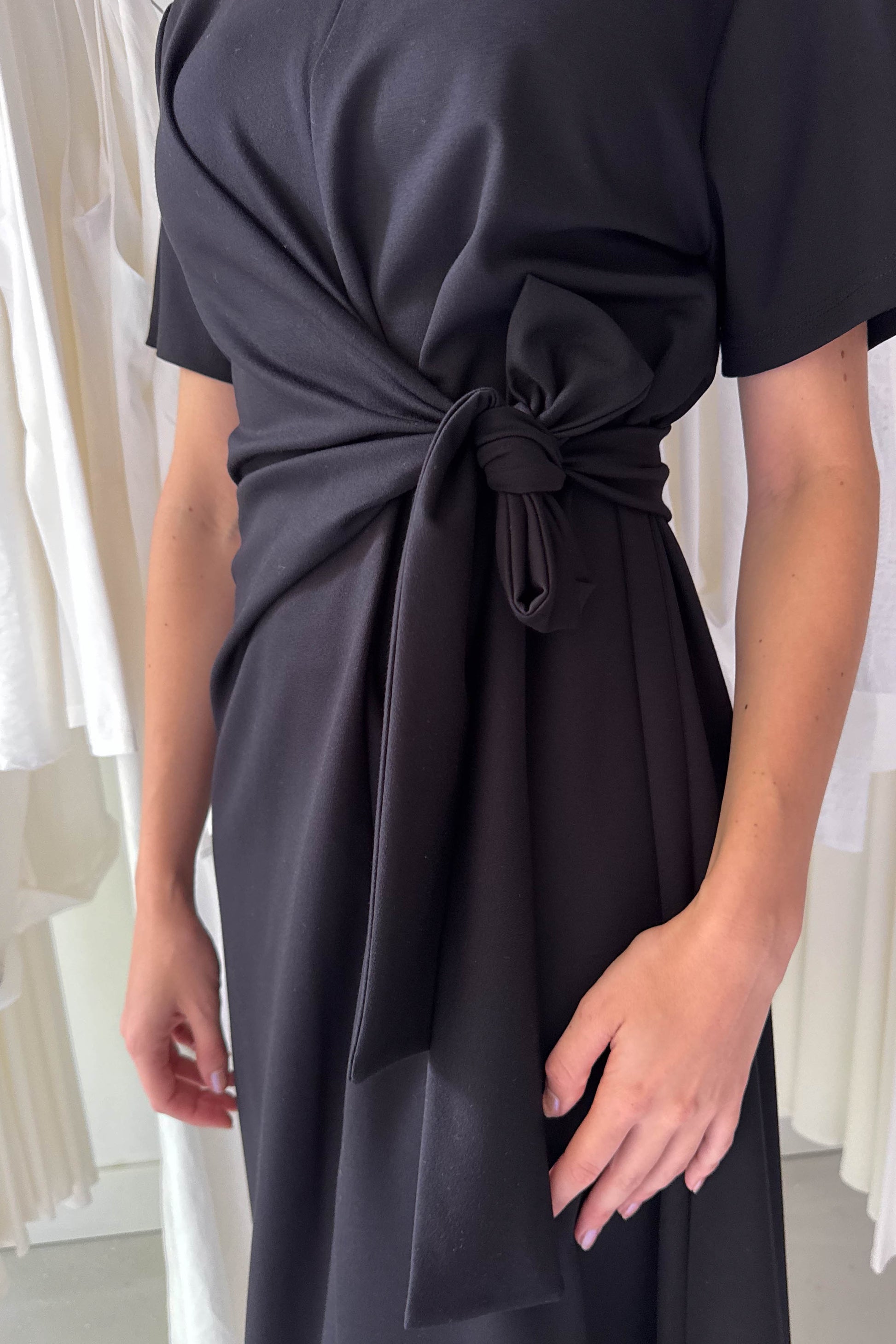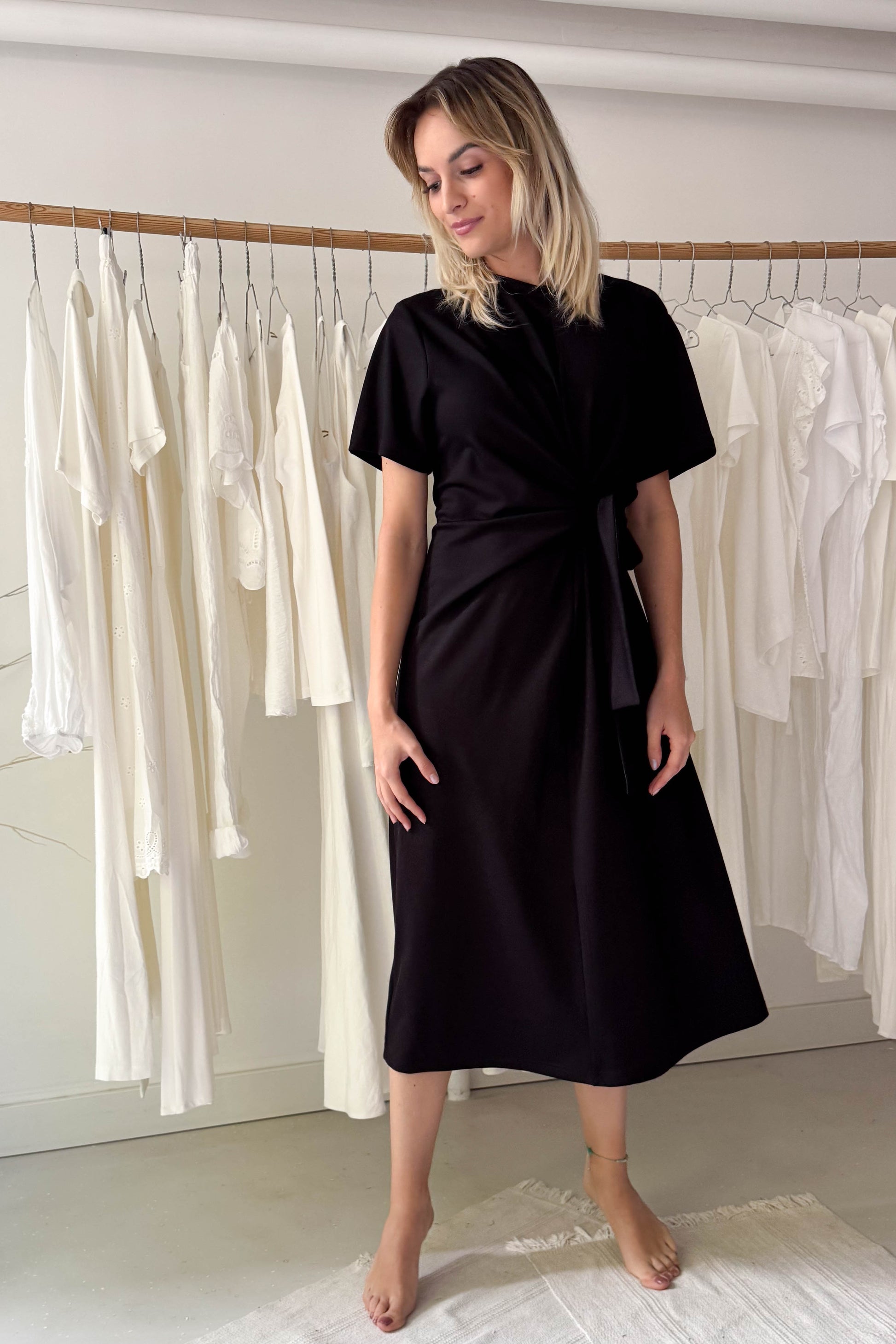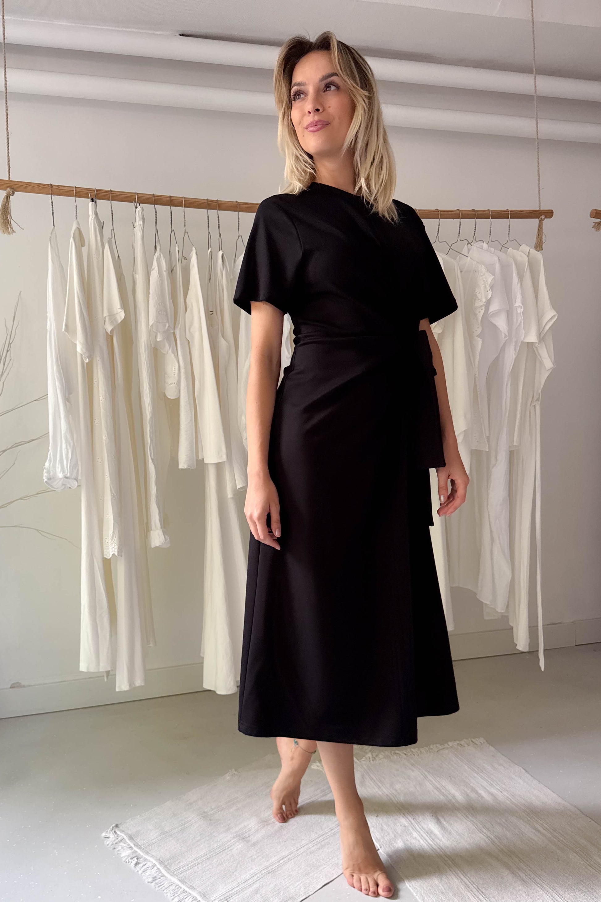 Fekete, letisztult ruha, különleges derékrésszel. Kereknyakú, rövidujjú elől-hátul középen egy hosszanti varrással ellátott, midi fazon. A derékrészen nem különálló elemként, hanem a ruhával egybeszabott megkötővel van ellátva, amely oldalt megkötve, kiemeli az alakot.