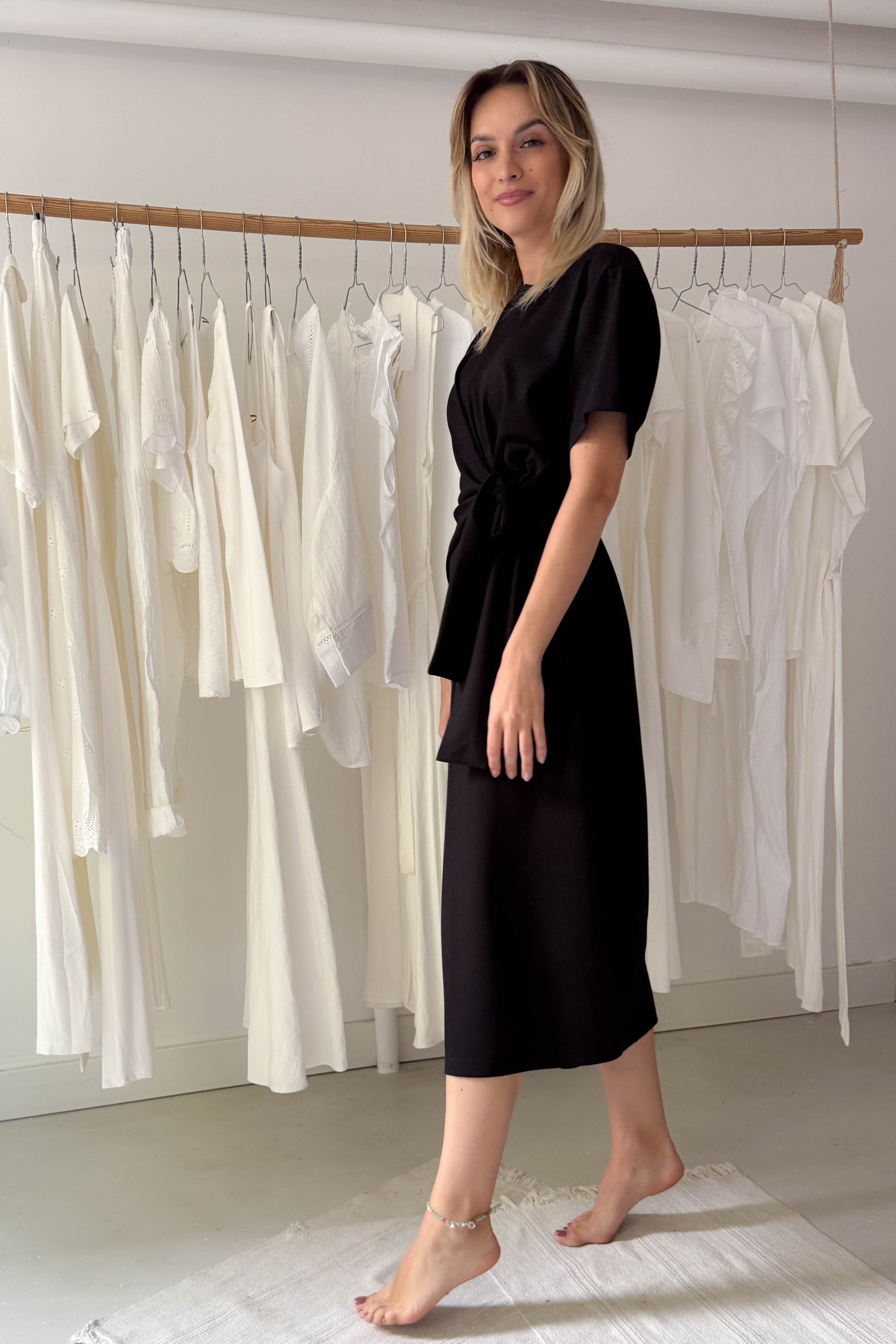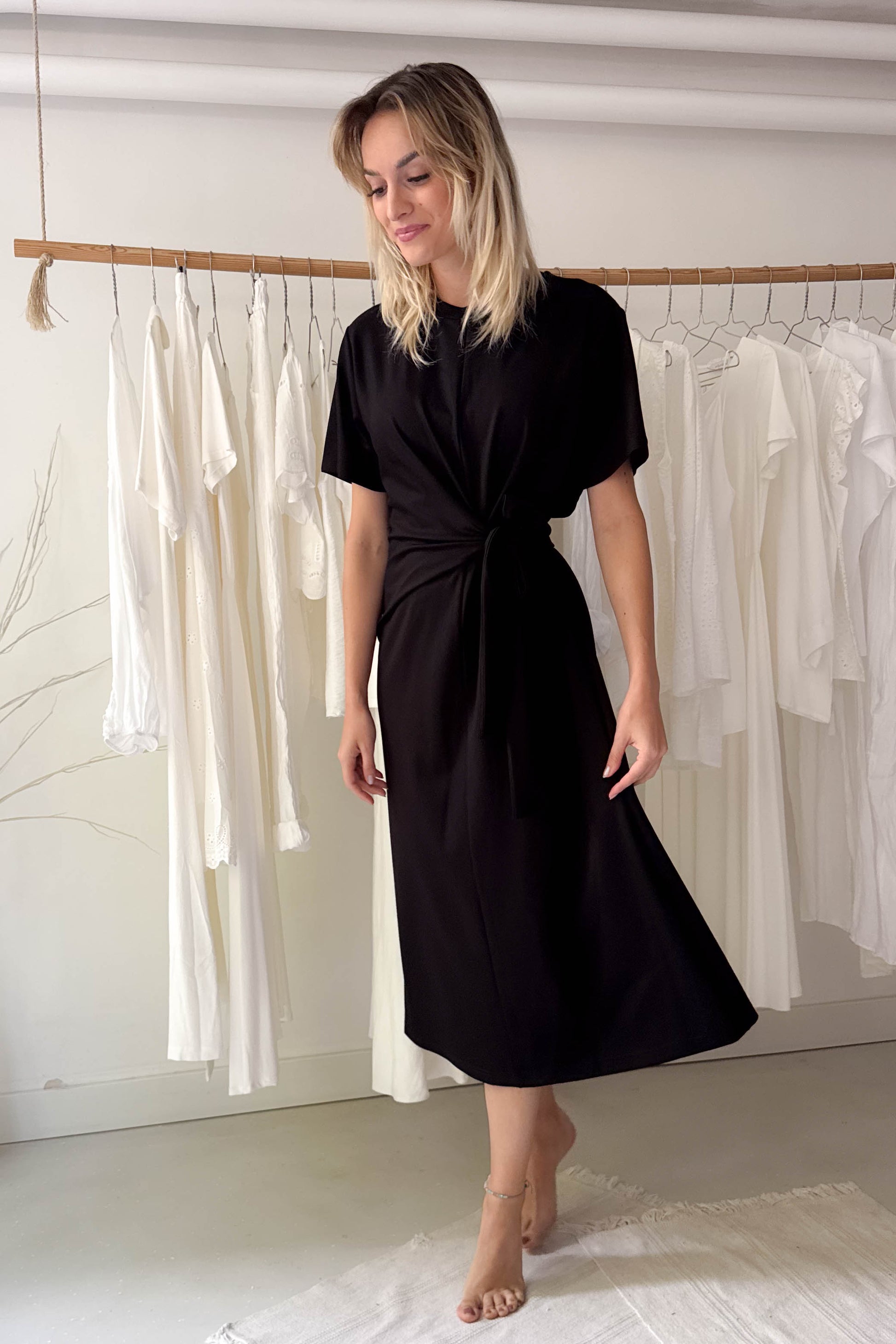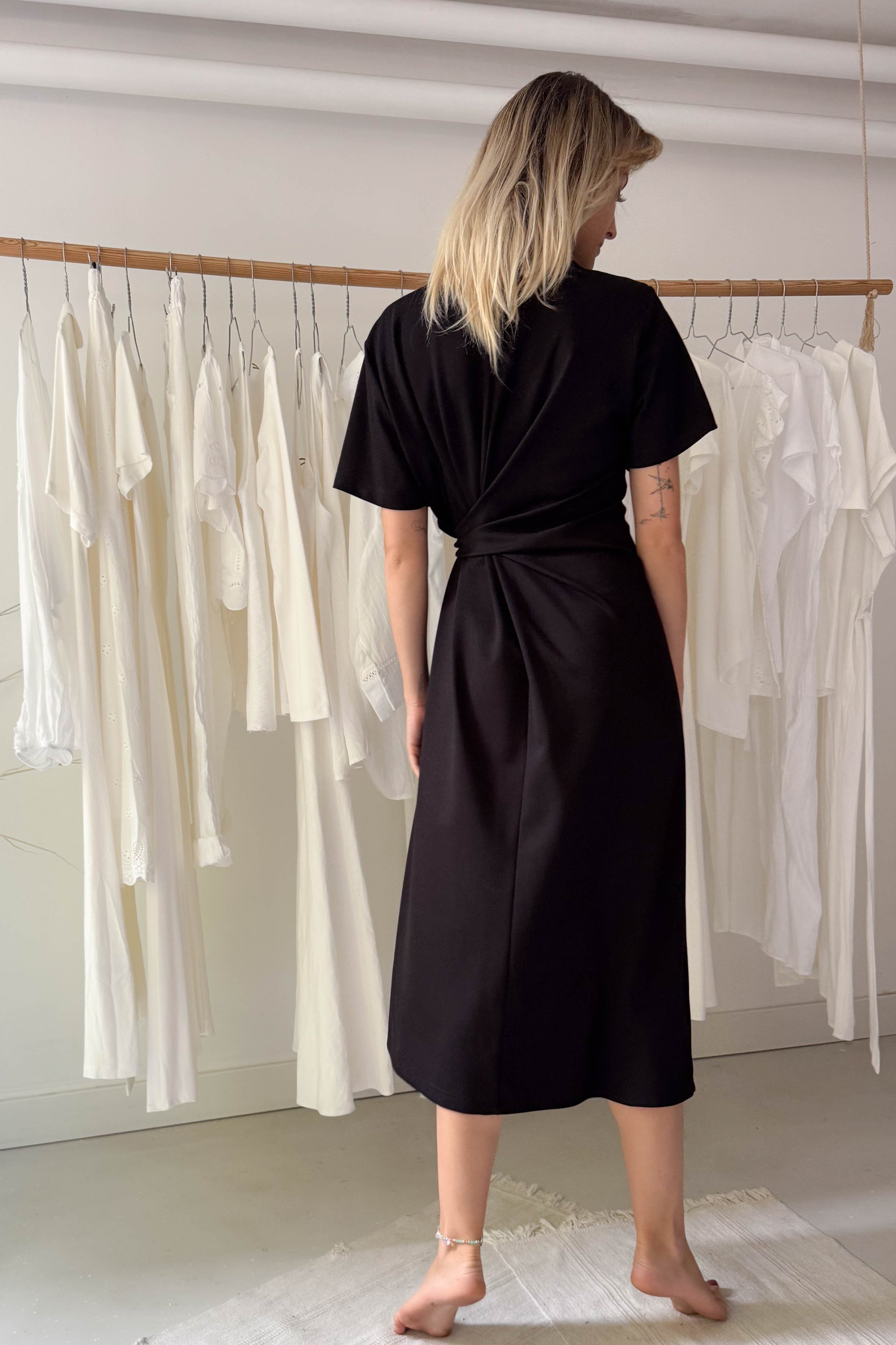Fekete, letisztult ruha, különleges derékrésszel. Kereknyakú, rövidujjú elől-hátul középen egy hosszanti varrással ellátott, midi fazon. A derékrészen nem különálló elemként, hanem a ruhával egybeszabott megkötővel van ellátva, amely oldalt megkötve, kiemeli az alakot.