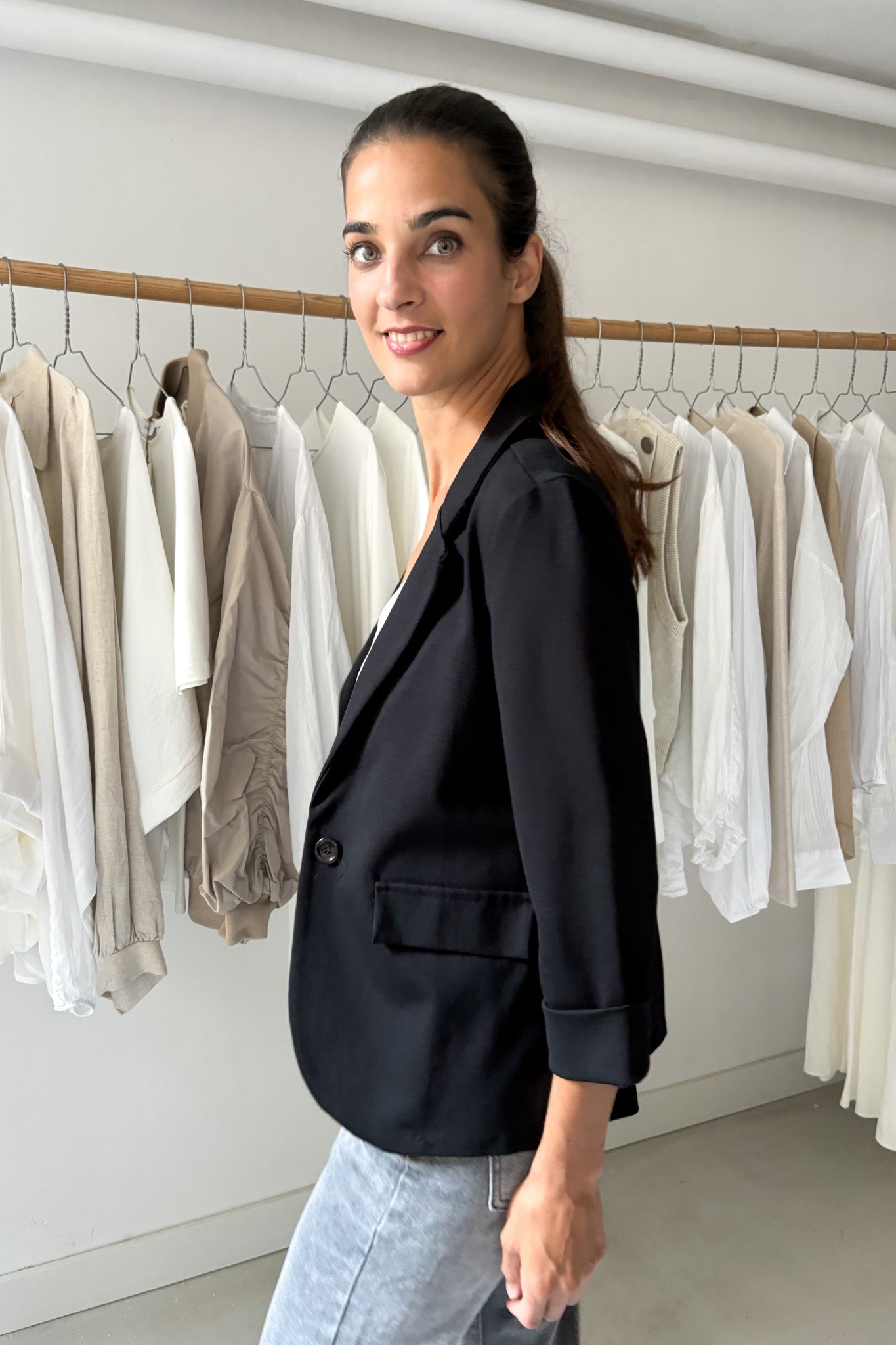 Fekete, középen gombbal ellátott zakó. Az ujja lahajtható.