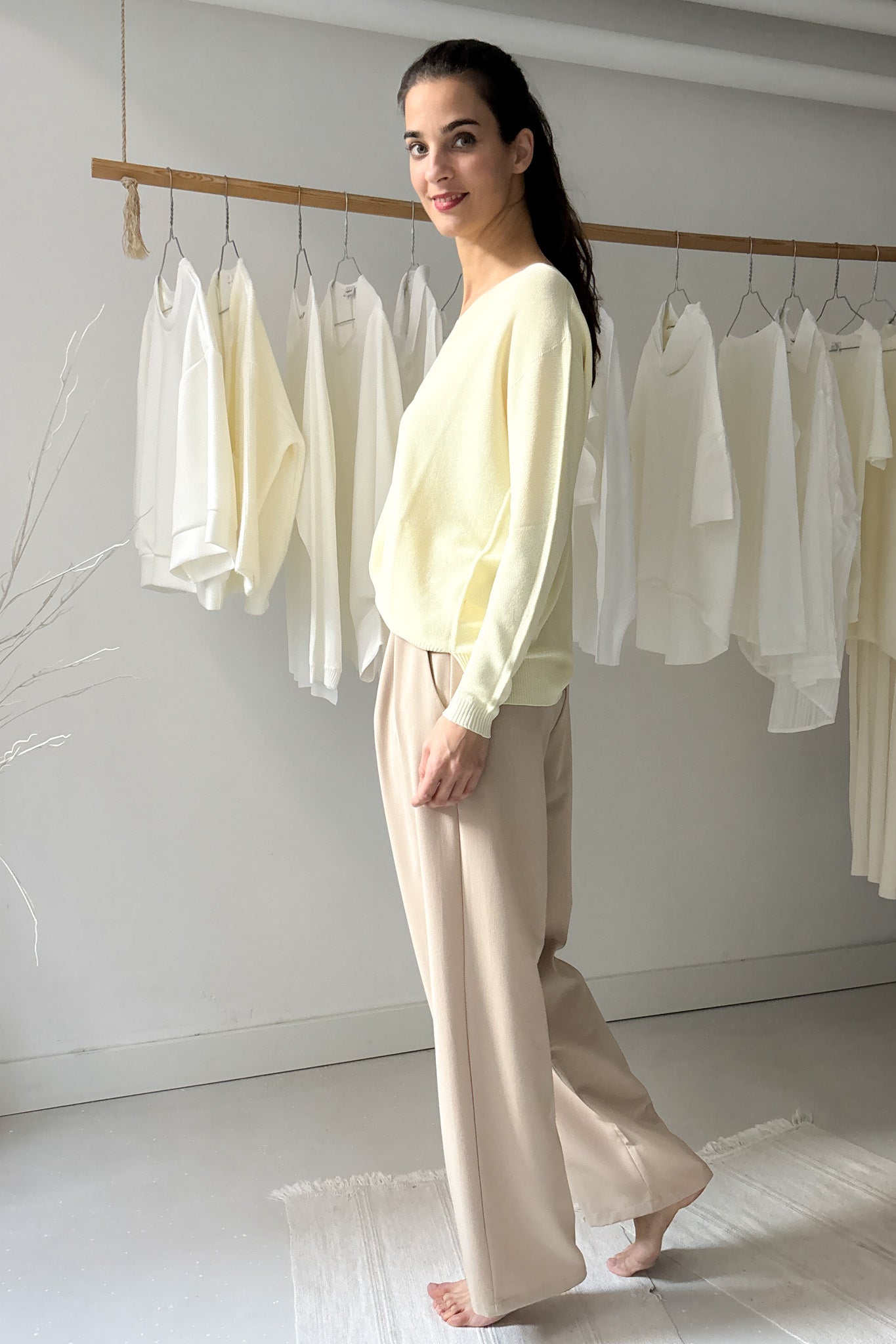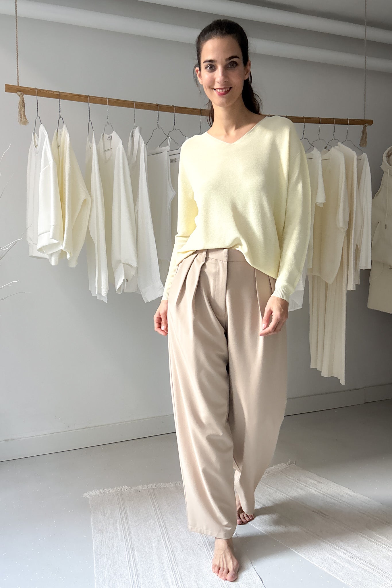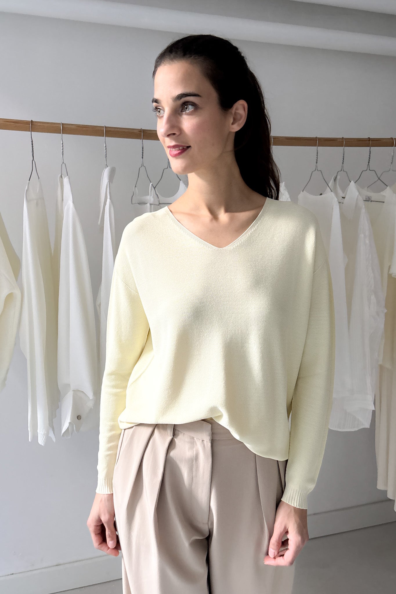 Finomkötött felső sárga színben. Hosszúujjú, V-kivágással ellátott fazon.
