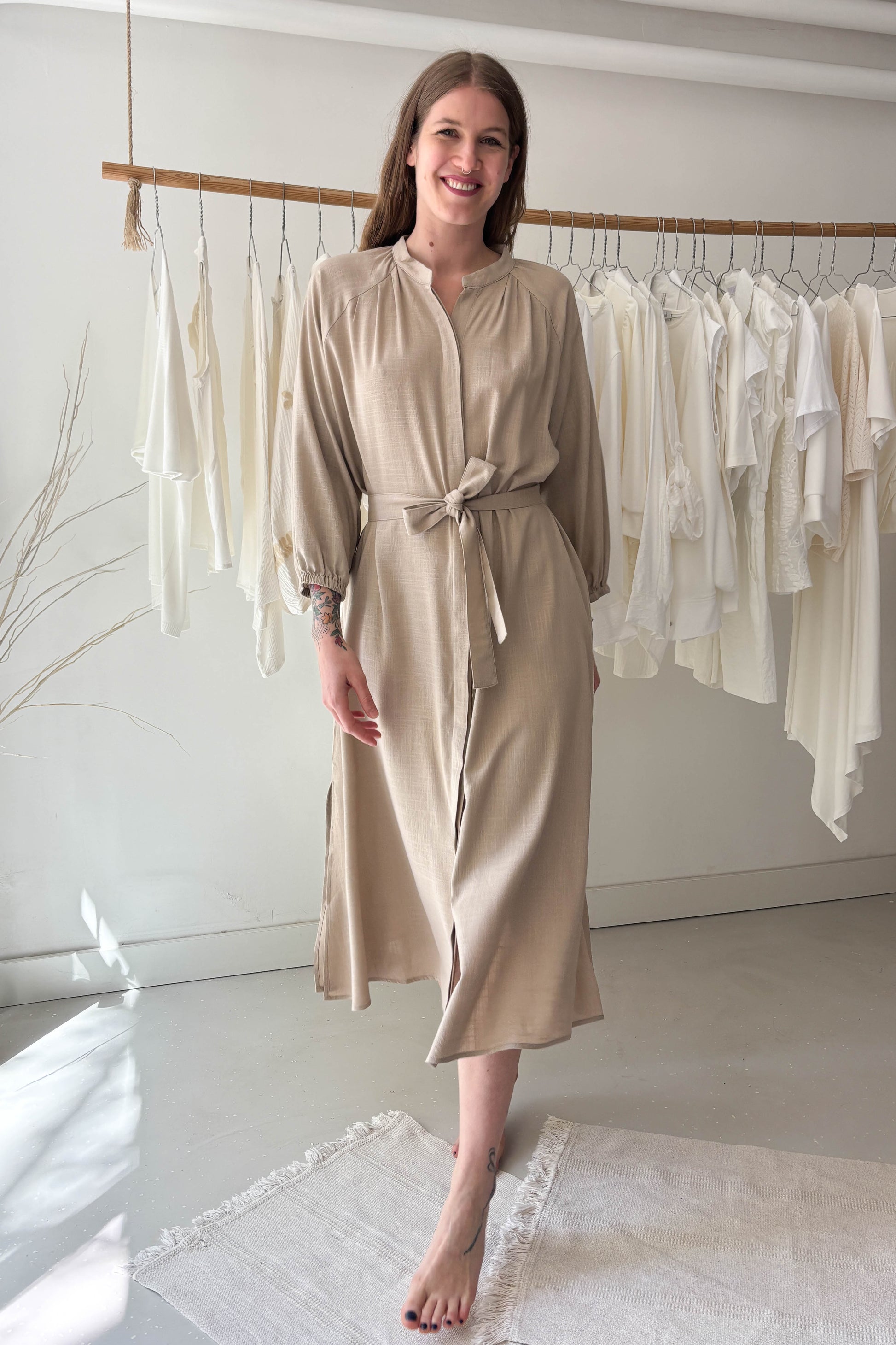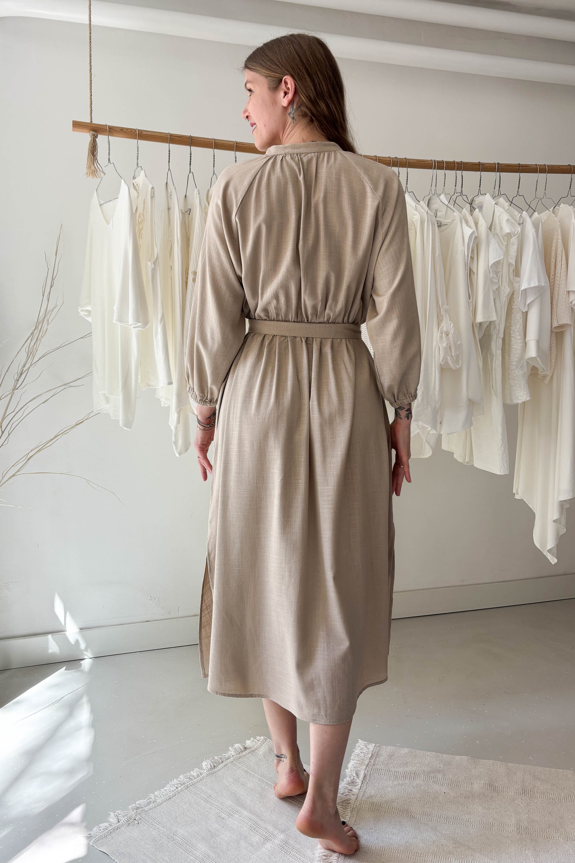 Lezser, gallér nélküli ingruha. Derékon megkötővel van ellátva, középen apró, rejtett gombokkal záródik.