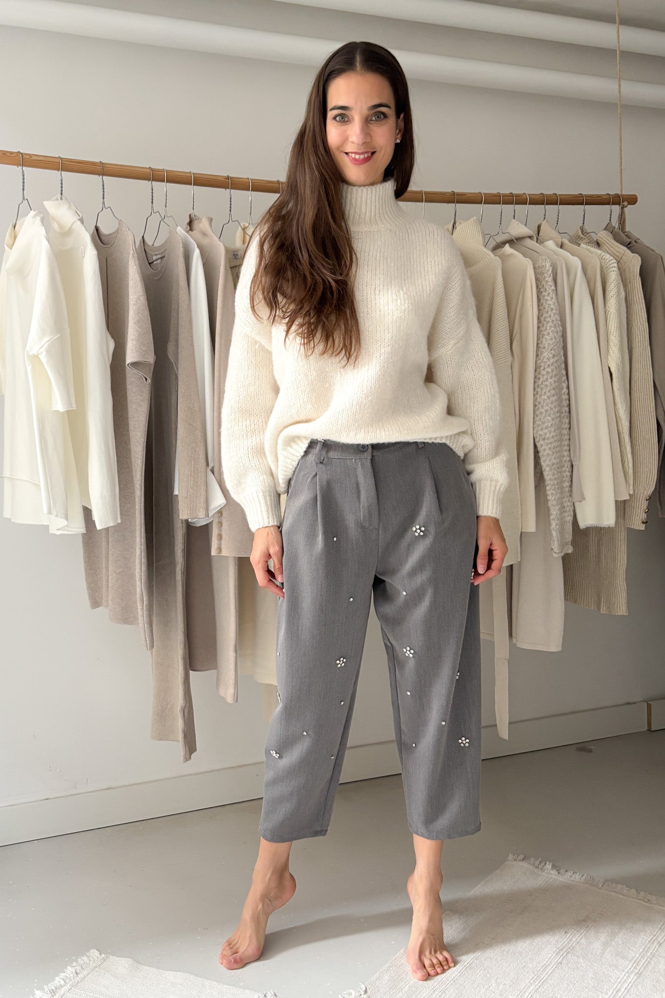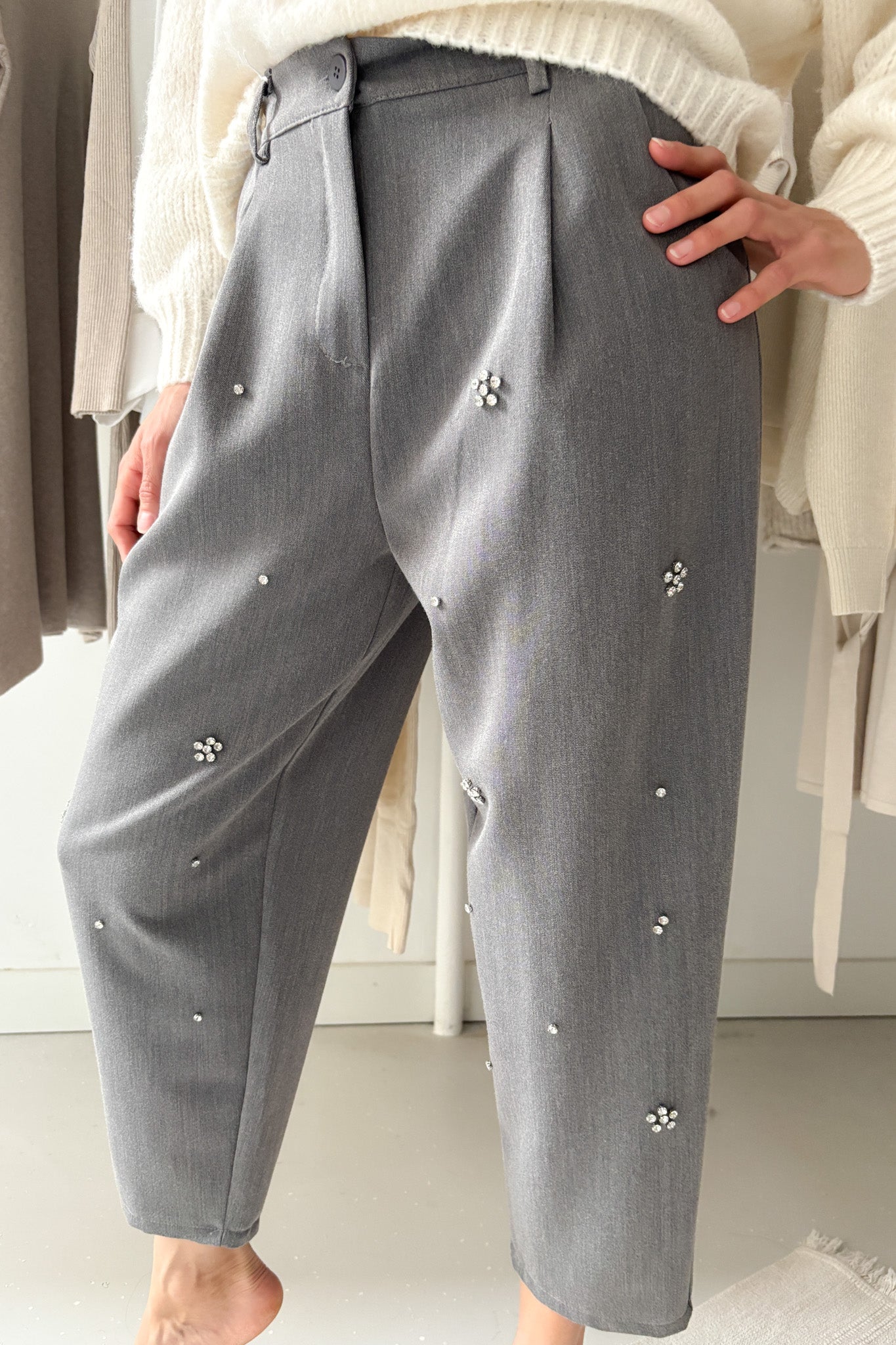 Gyöngyökkel díszített, szürke, elegáns nadrág. Zsebes, lágyesésű fazon. Lefelé szűkülő.
