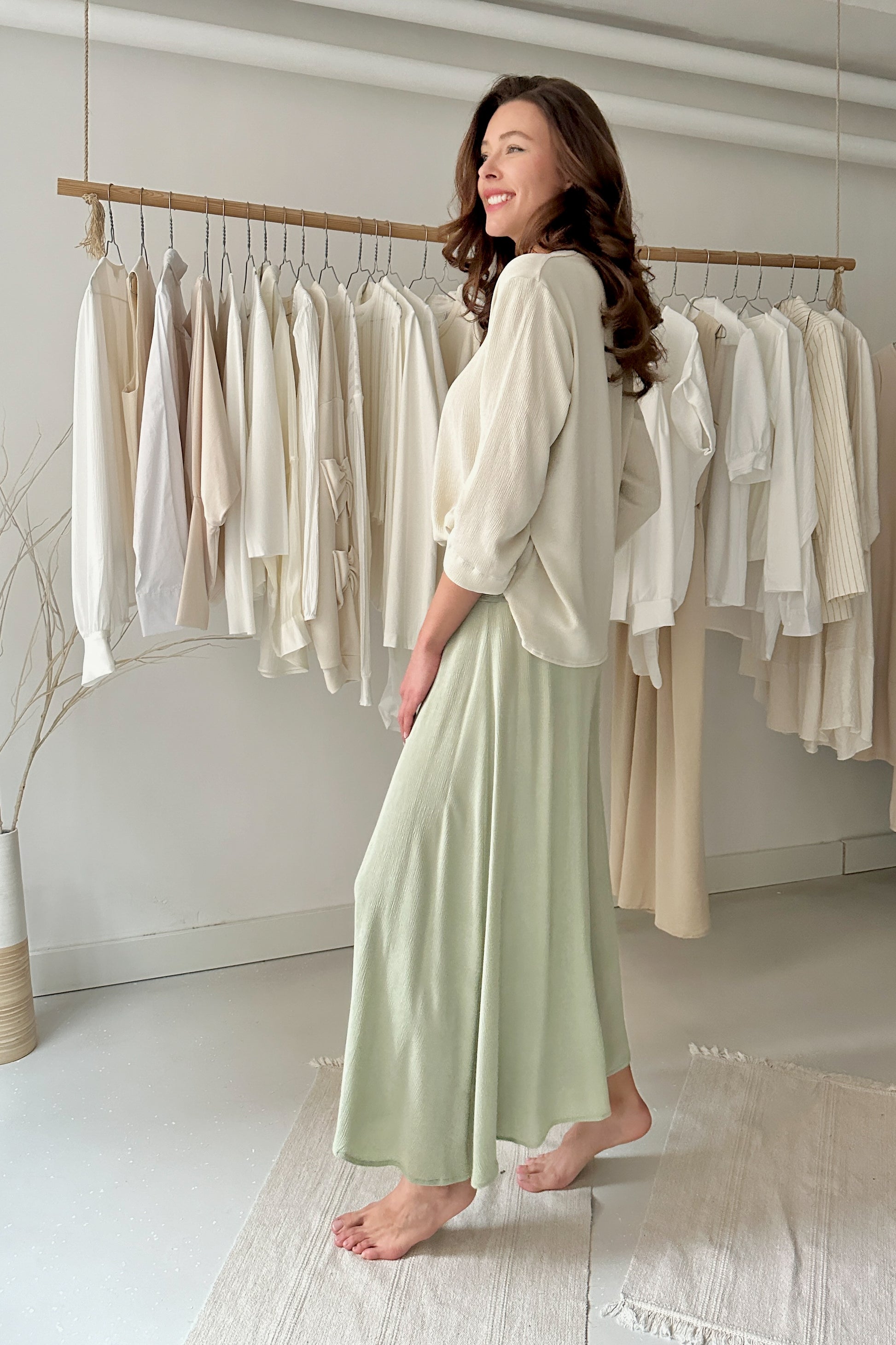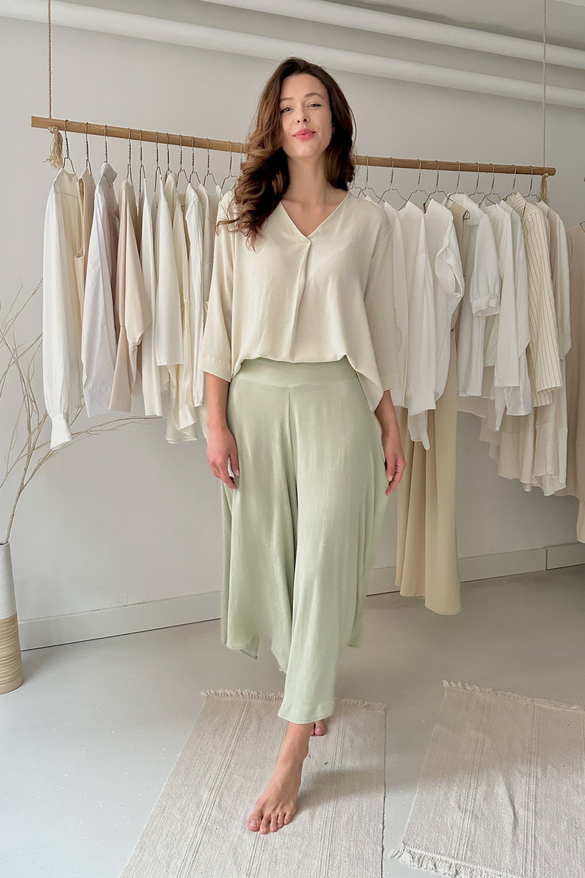 Enyhén gyűrt hatású, 100% viszkóz anyagból készült egyméretes, 3/4-es ujjú felső. Lenge, bő fazon, mellnél hajtással. 34-38-as konfekcióméretig ajánljuk. Csak kézi mosással mosható.