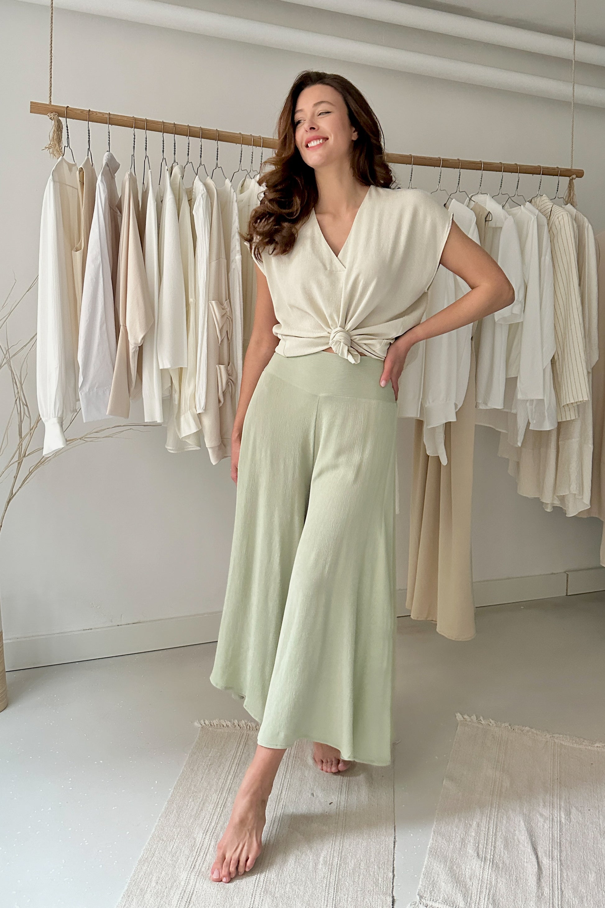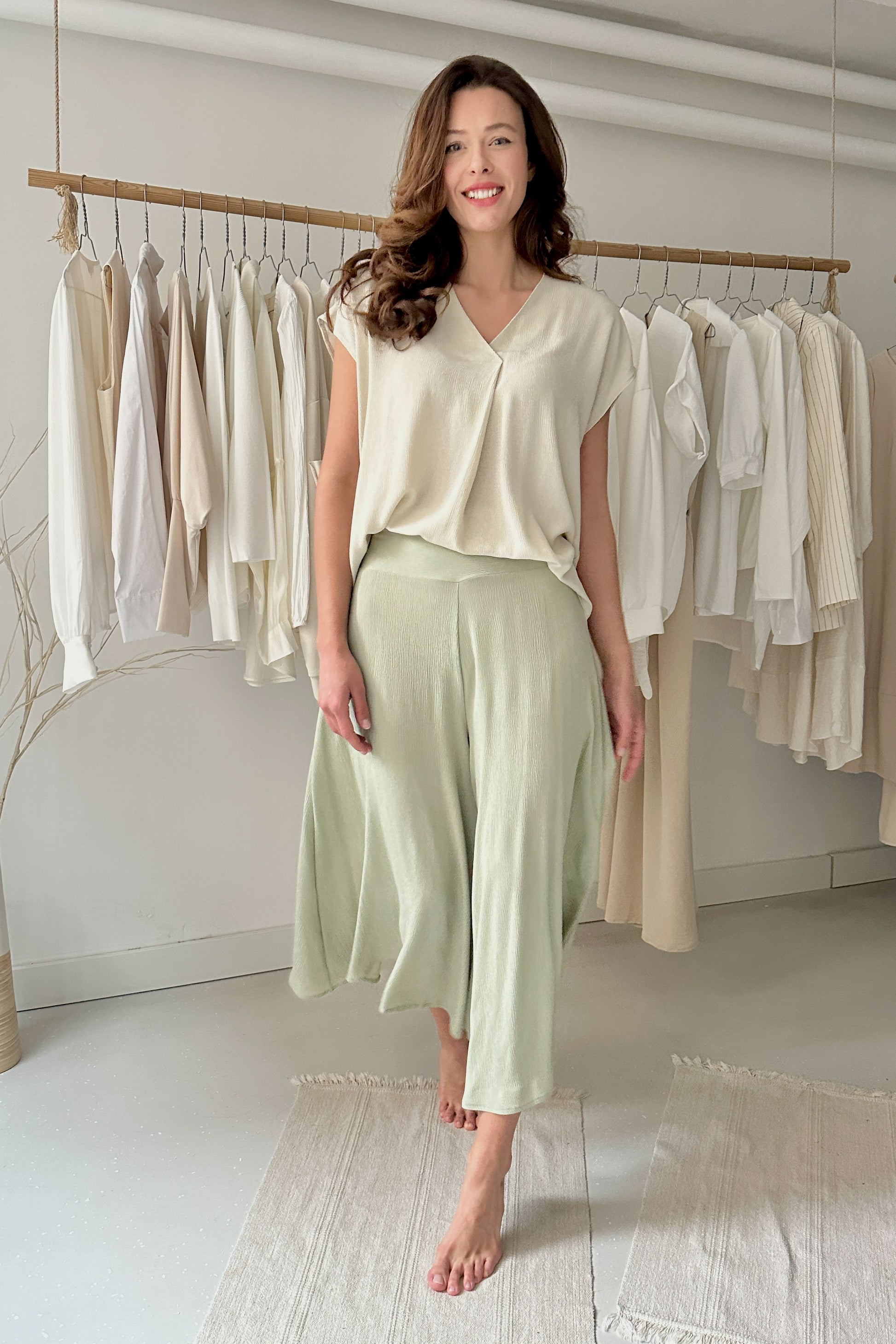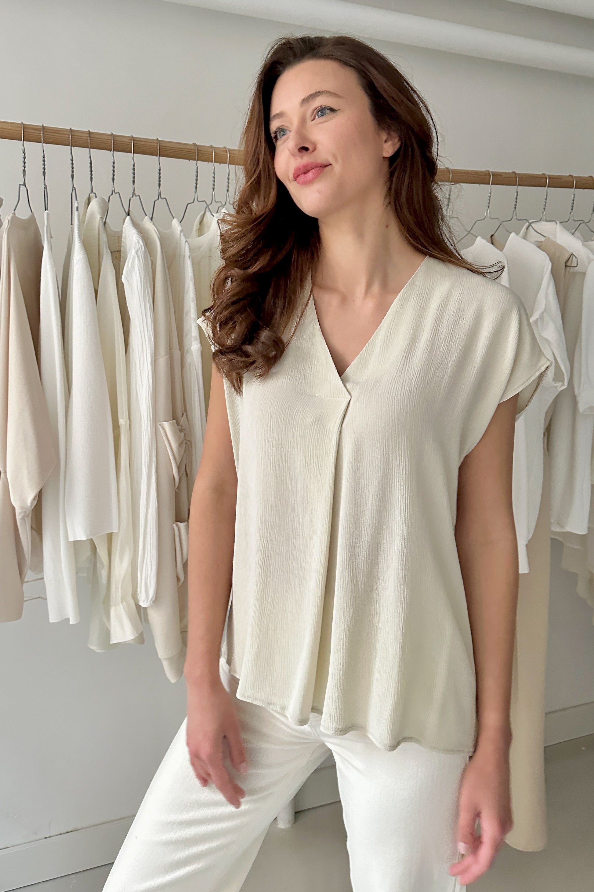 Enyhén gyűrt hatású, 100% viszkóz anyagból készült egyméretes, rövidujjú felső. Lenge, bő fazon, mellnél hajtással. 34-38-as konfekcióméretig ajánljuk. Csak kézi mosással mosható.