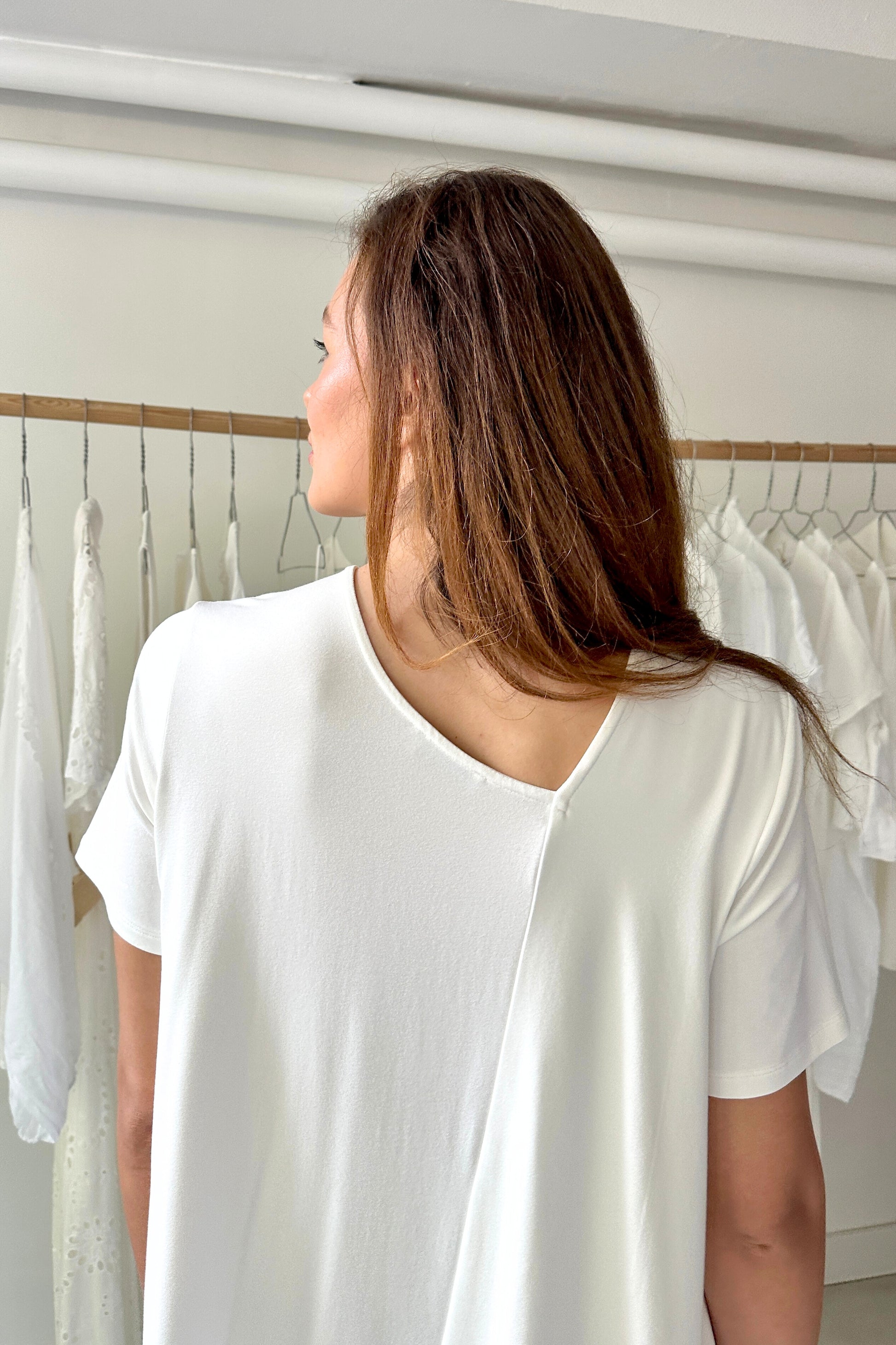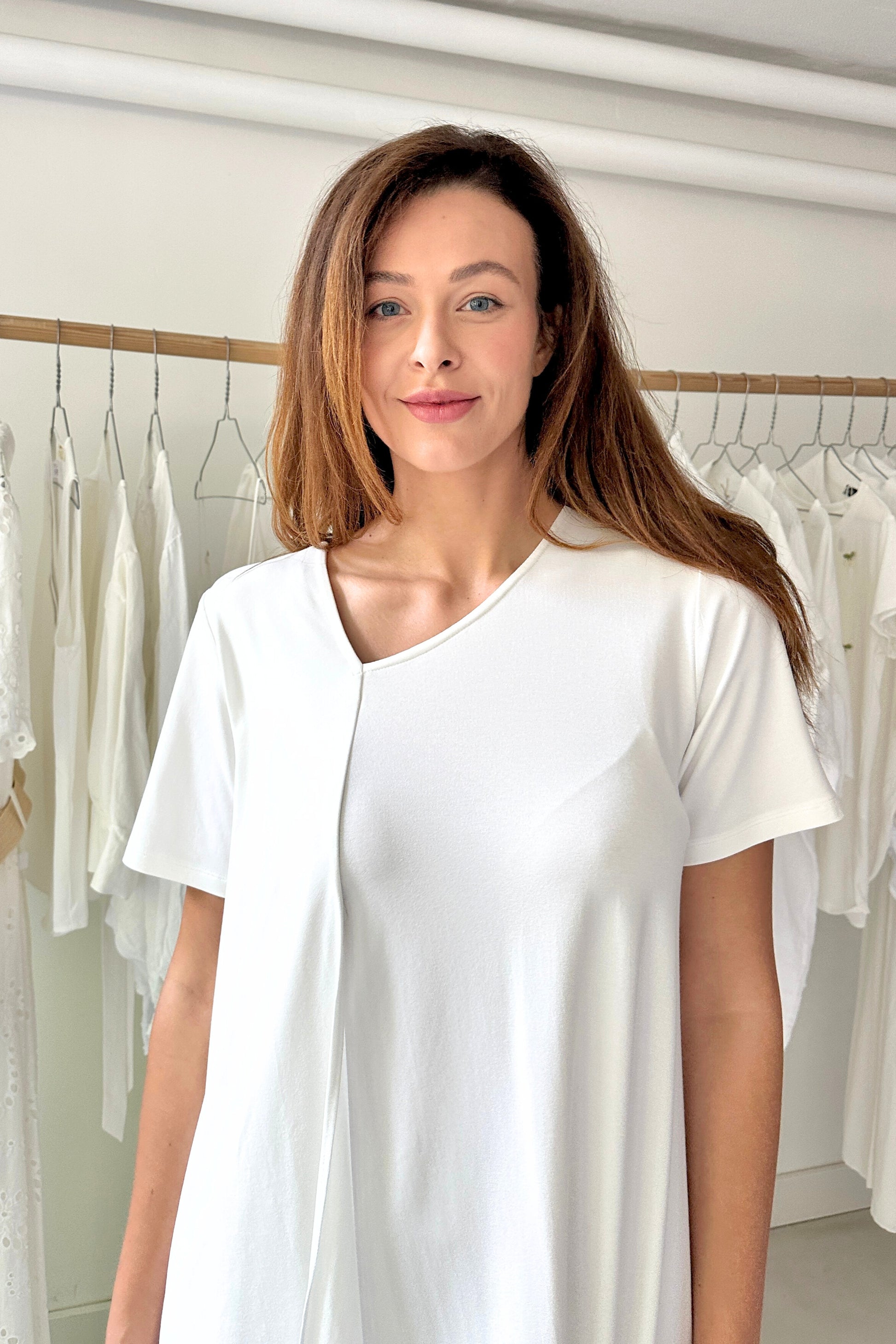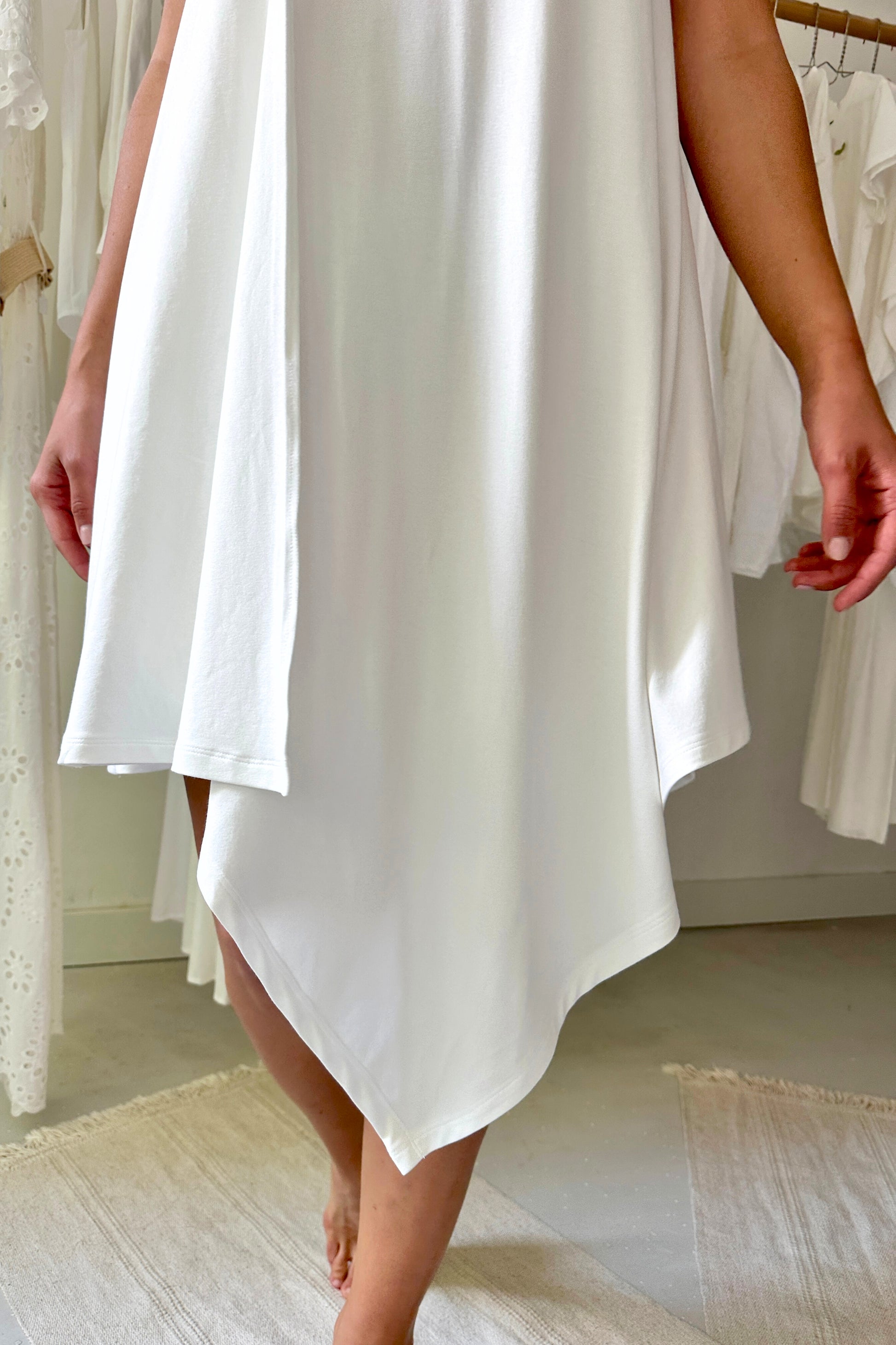 Pihe-puha fehér ruha. Hajtásos fazonjának és anyagának köszönhetően könnyedén szellőzik. Különlegessége ezenkívül a megszokottól eltérő, szögletes nyakkivágás.