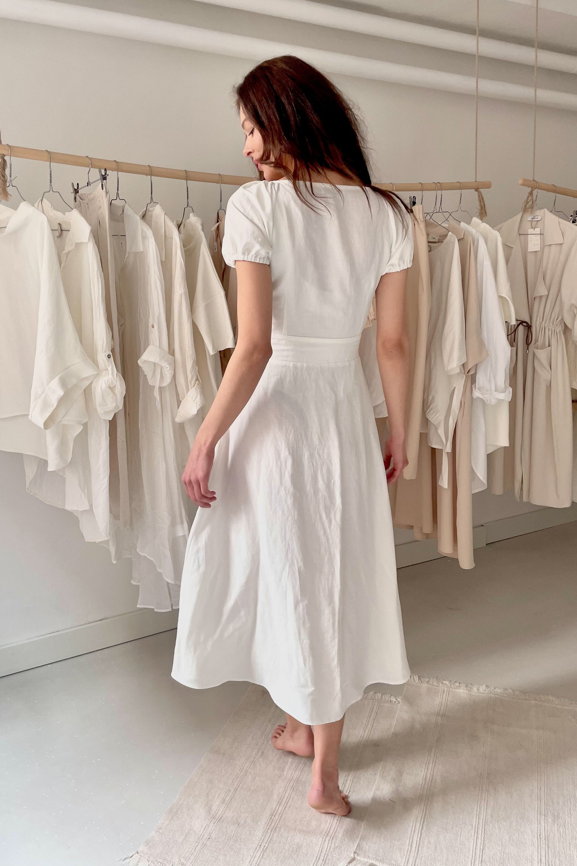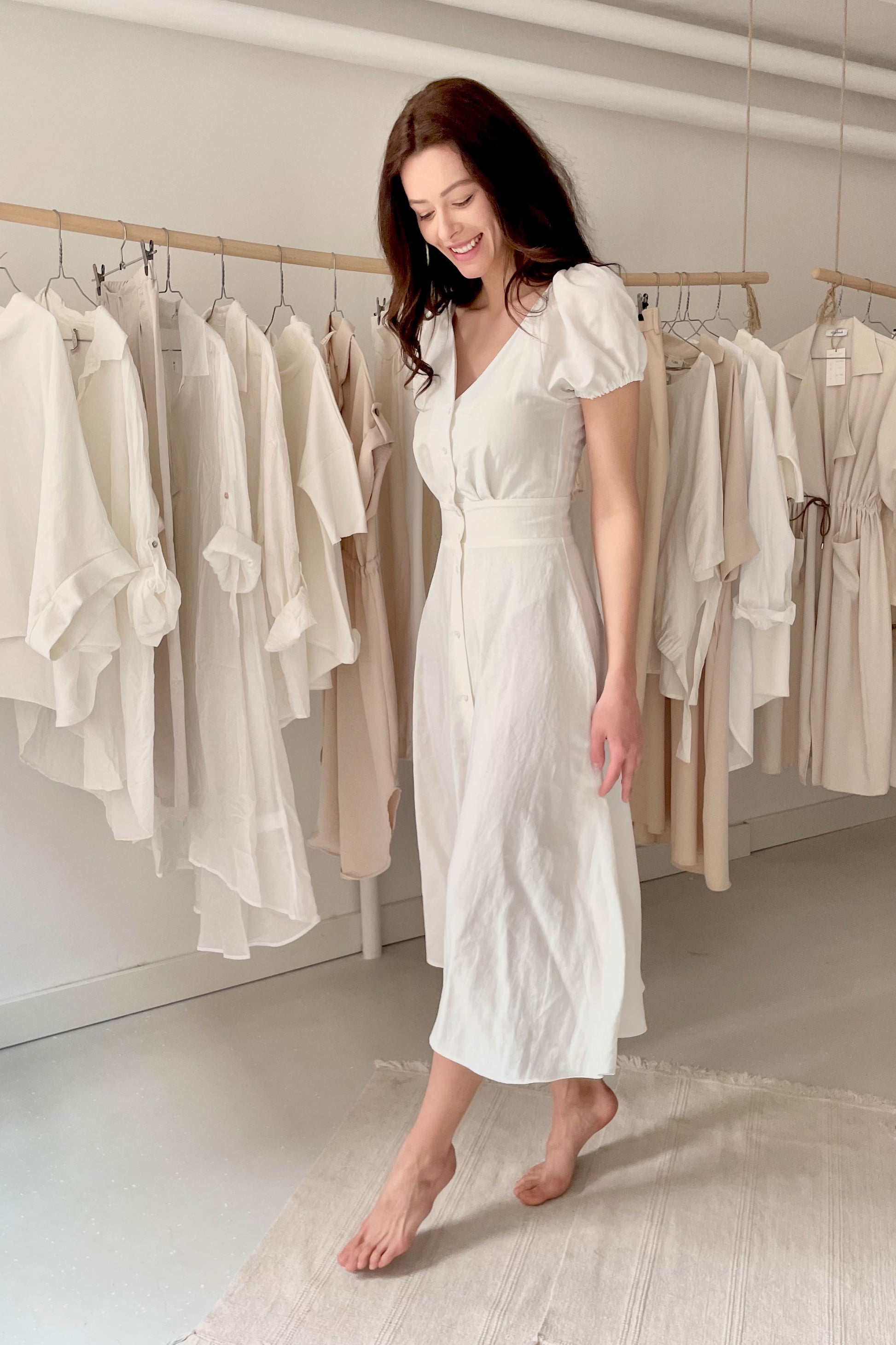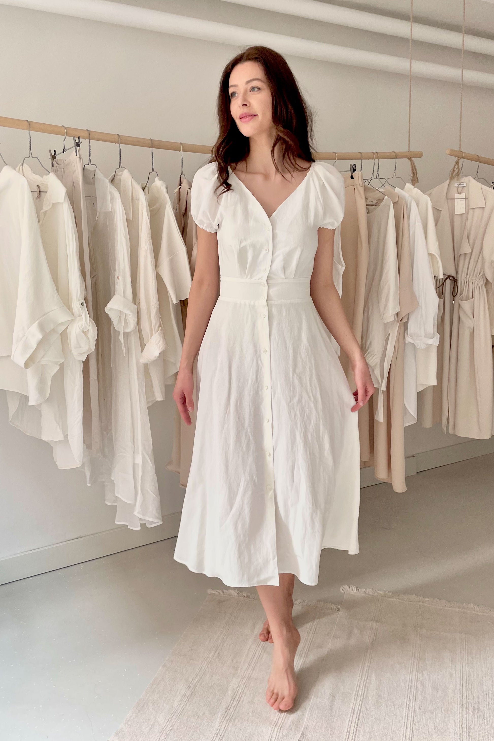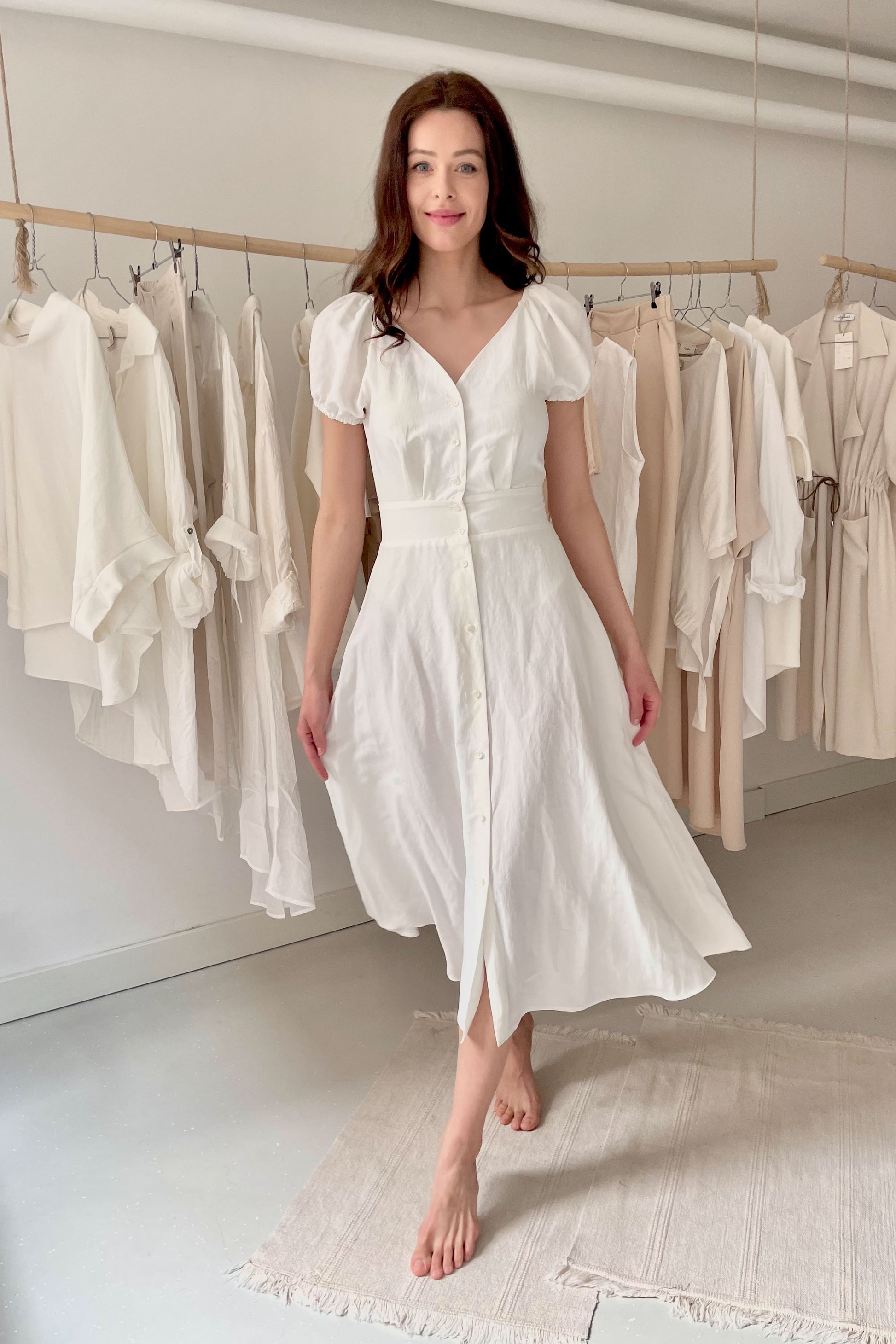 Elöl gombos, puffos ujjú, klasszikus szabású ruha. Anyaga: 50%len - 50% viszkóz. S méret. A modell 177 cm magas, 36-os konfekcióméretet hord. Made in Hungary.