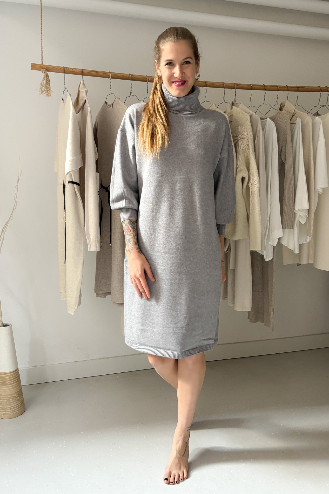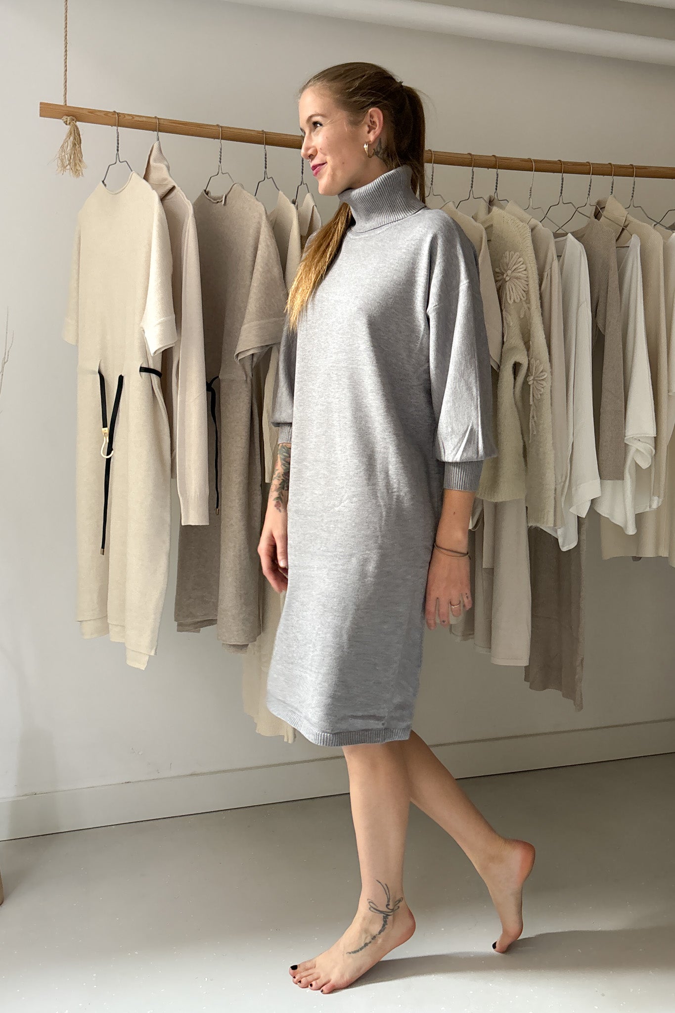 Hamuszürke, garbós pulcsiruha. Puha anyagú, térd alá érő fazon. Csuklórésznél passzos.