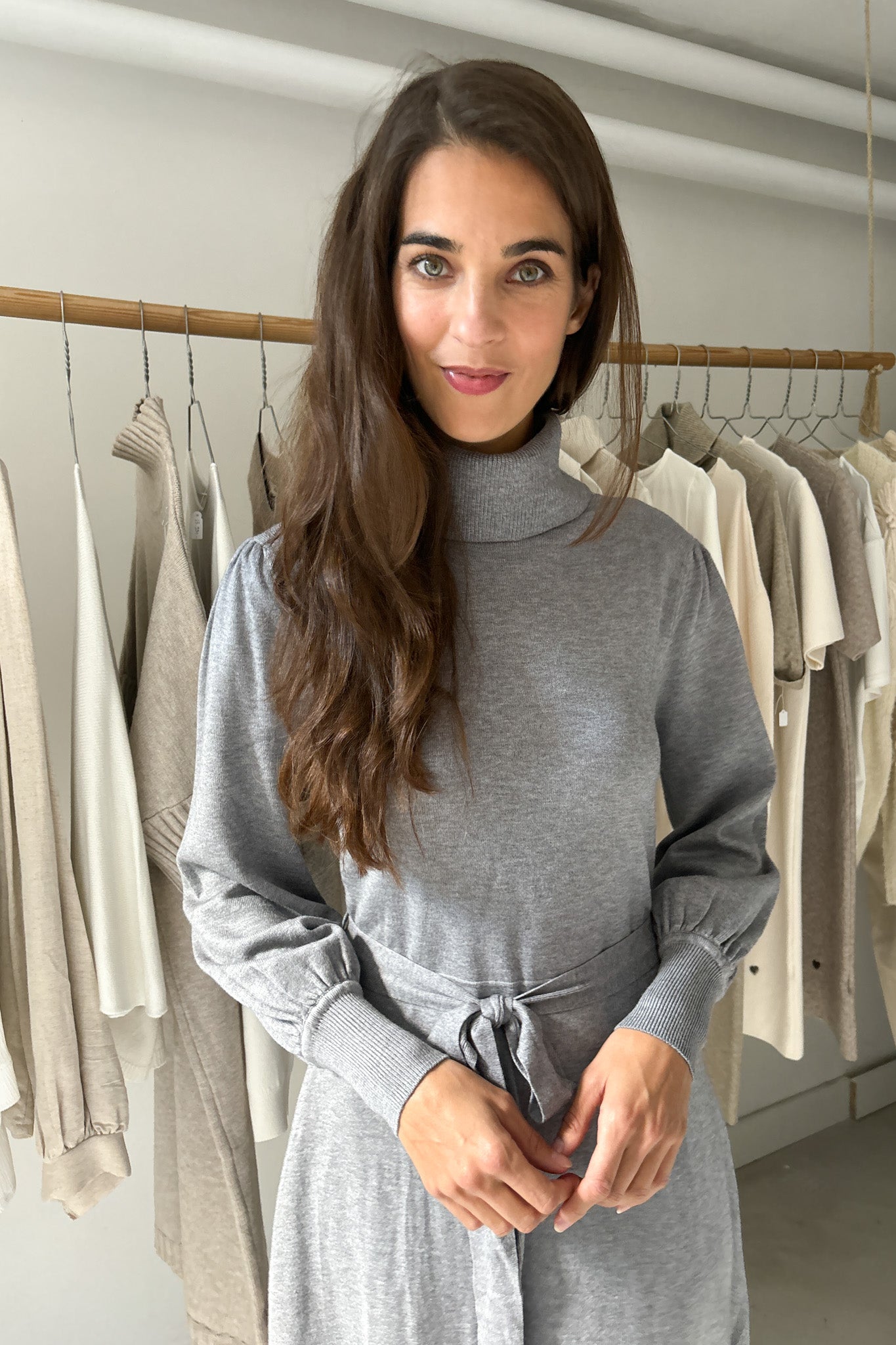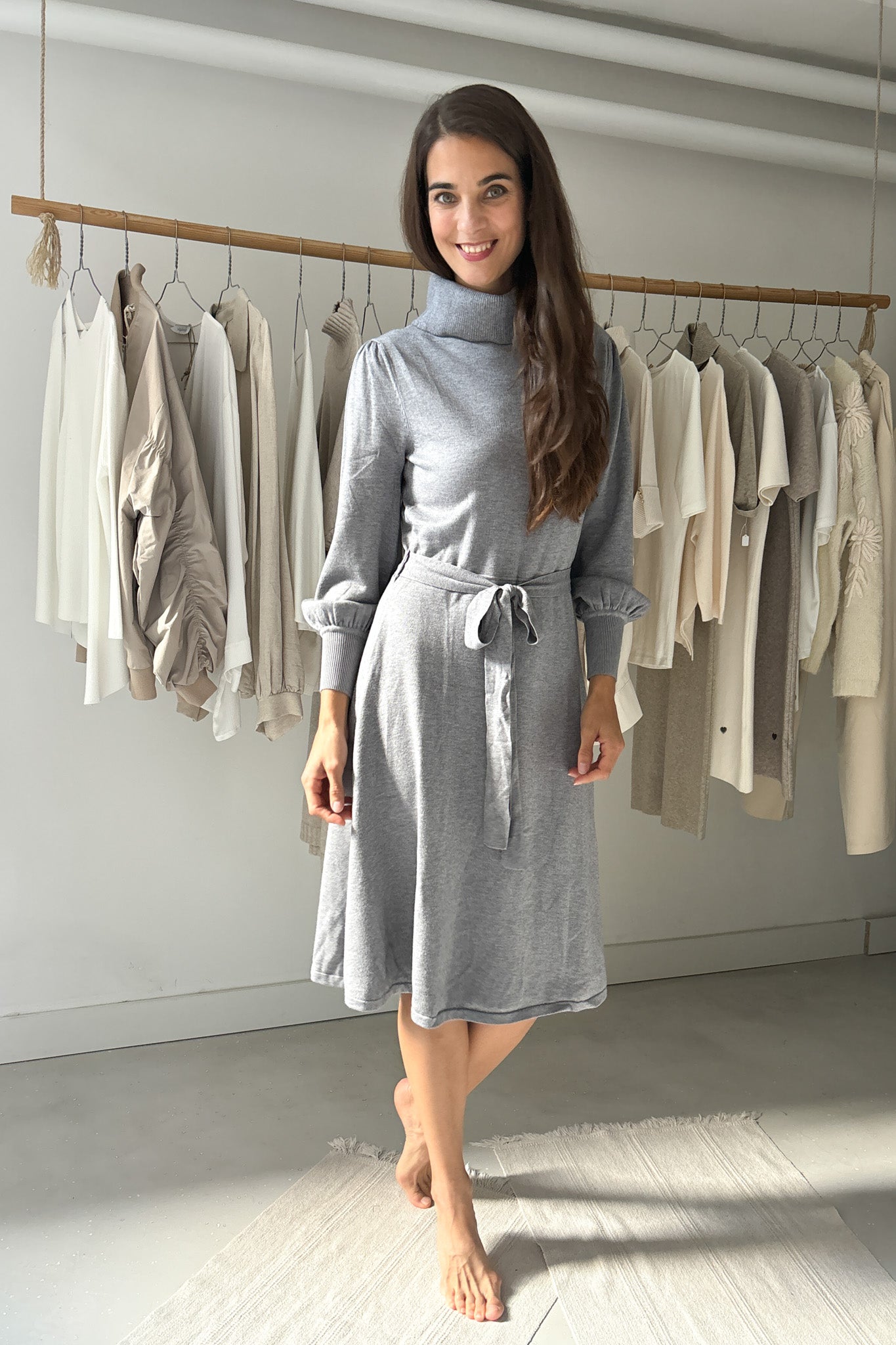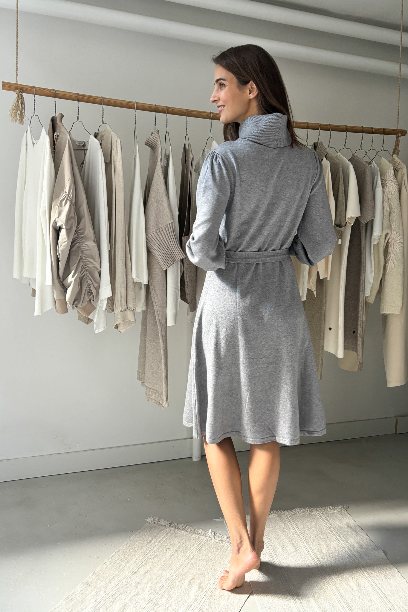 Őszi, hamuszürke, garbós ruha. Derékon saját anyagóból készült övvel megköthető. Csuklórésznél passzos, szoknyarésze lágyesésű, harang fazon.