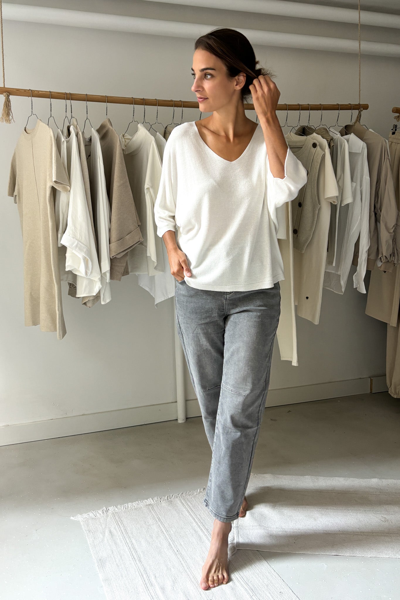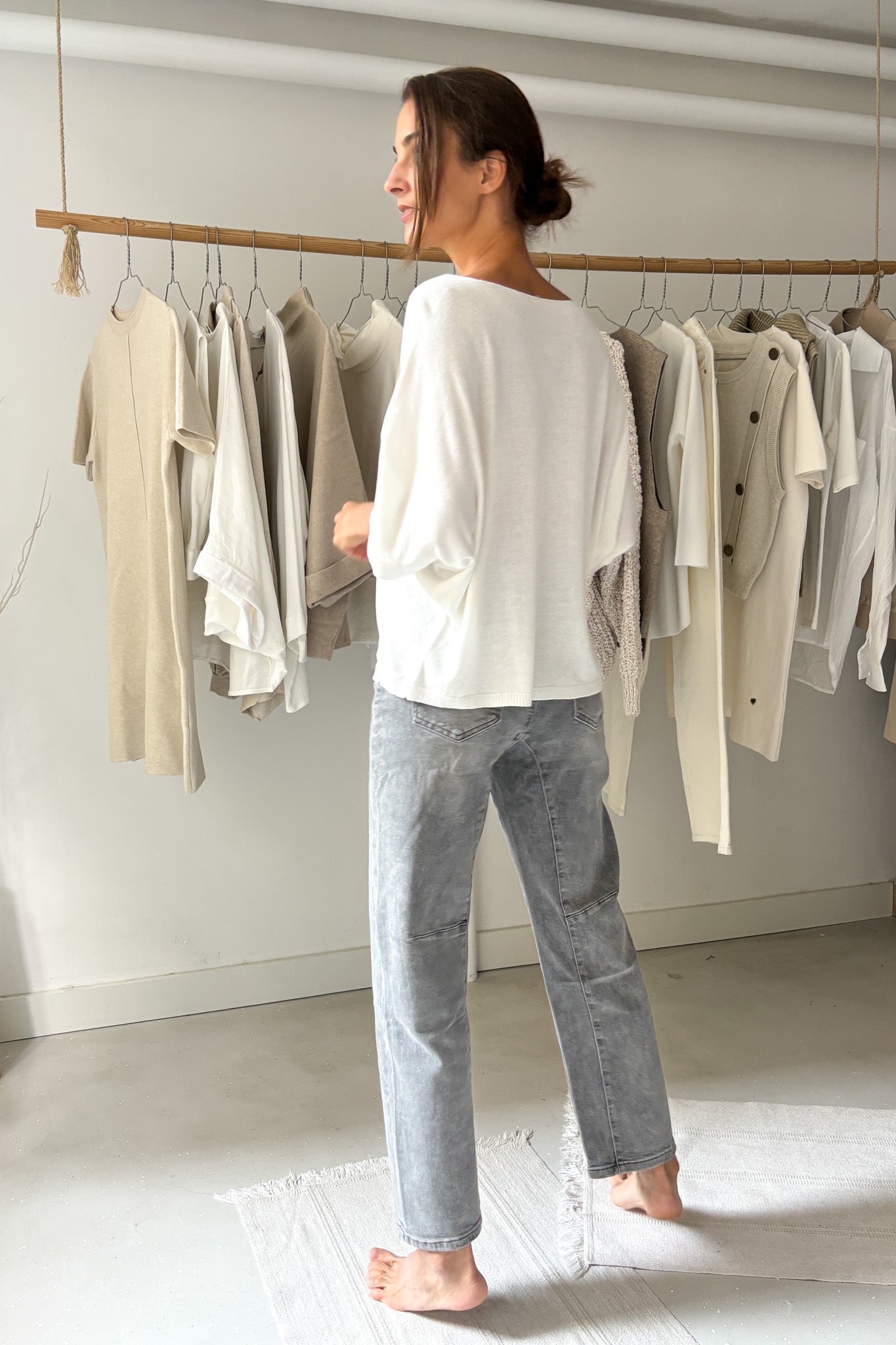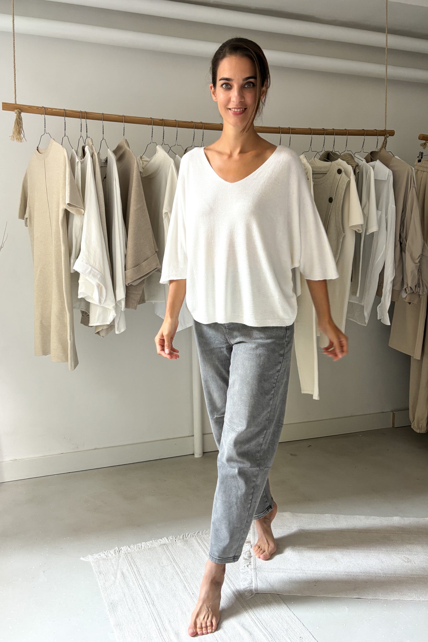 Fehér, lágy esésű felső. Pihe-puha, vékony anyagú. Enyhén denevérujjas fazon.
