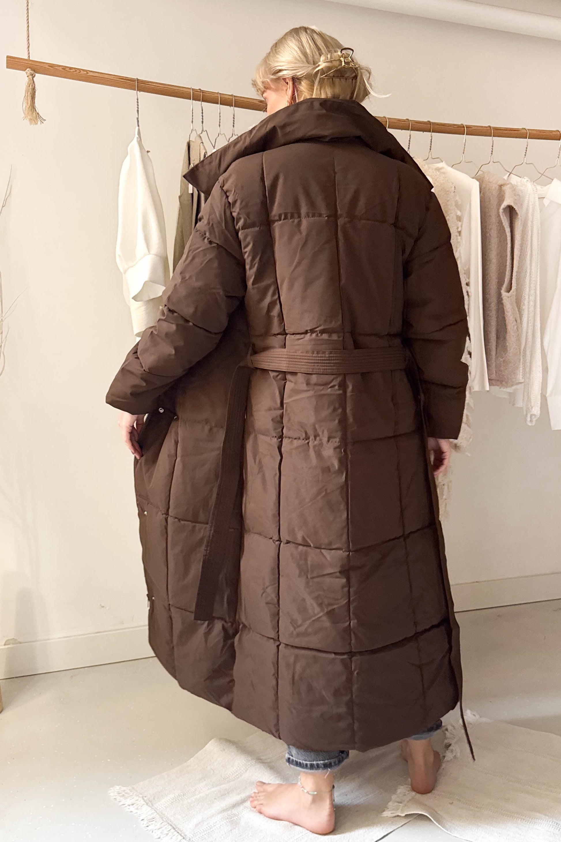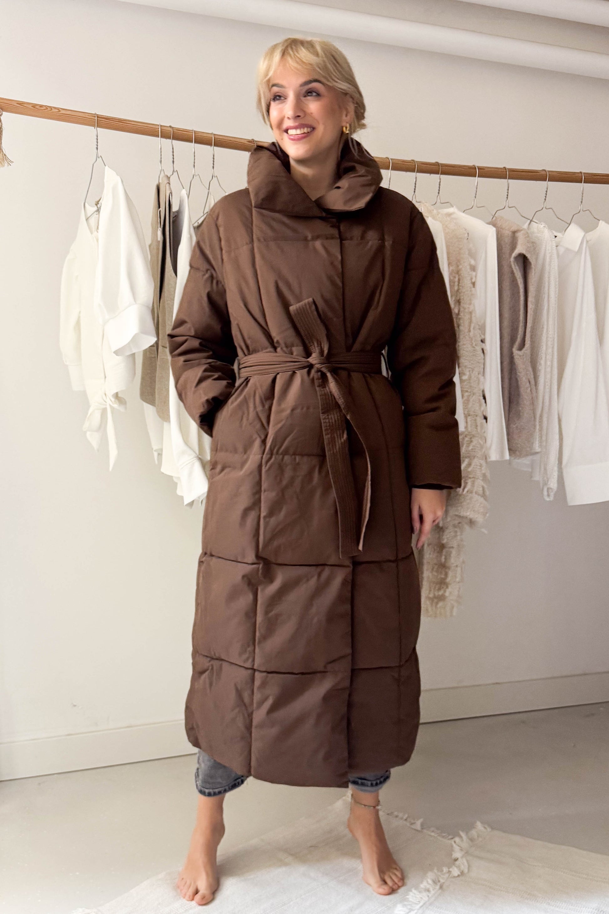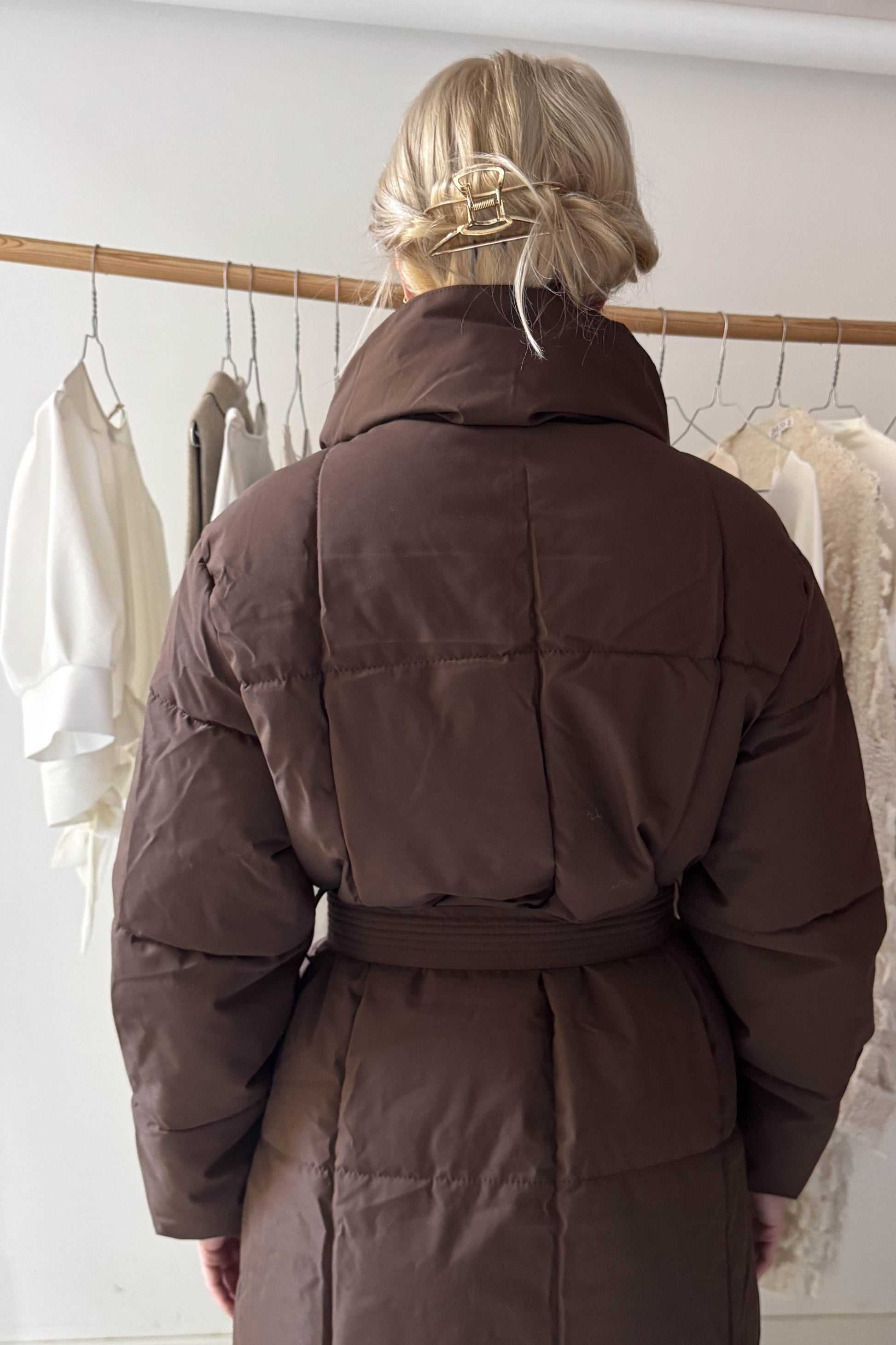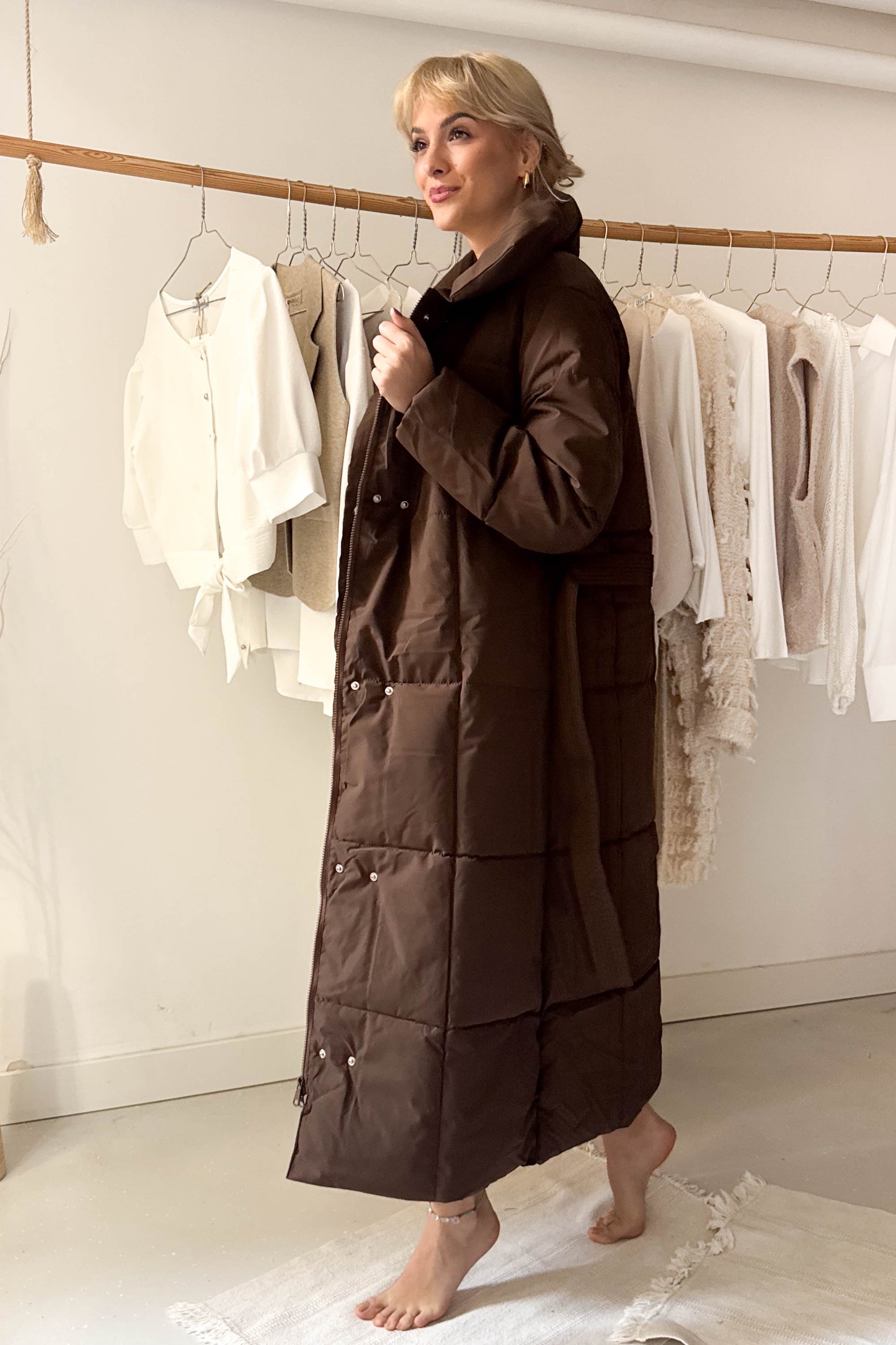 Hosszú pufikabát-mazsolabarna