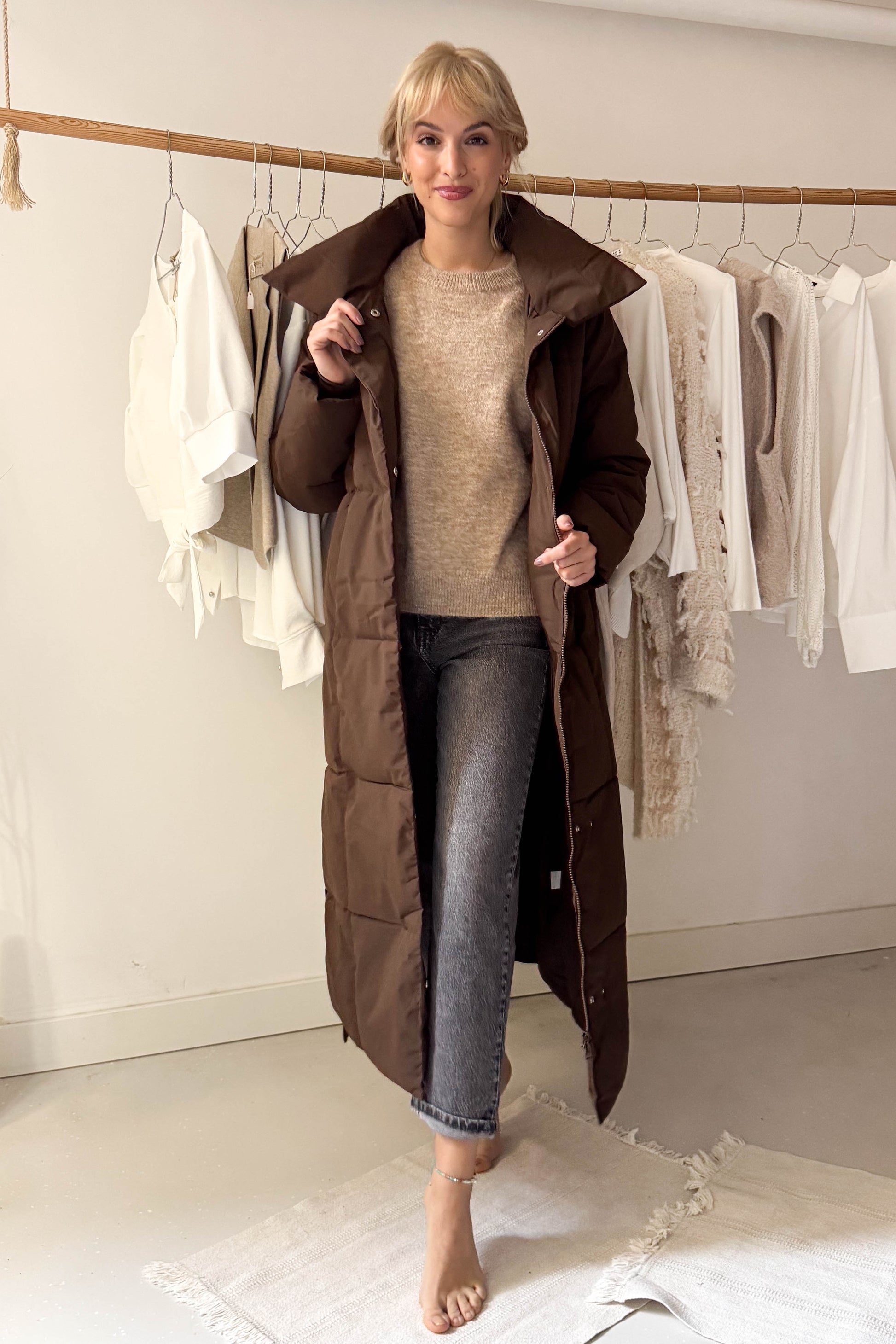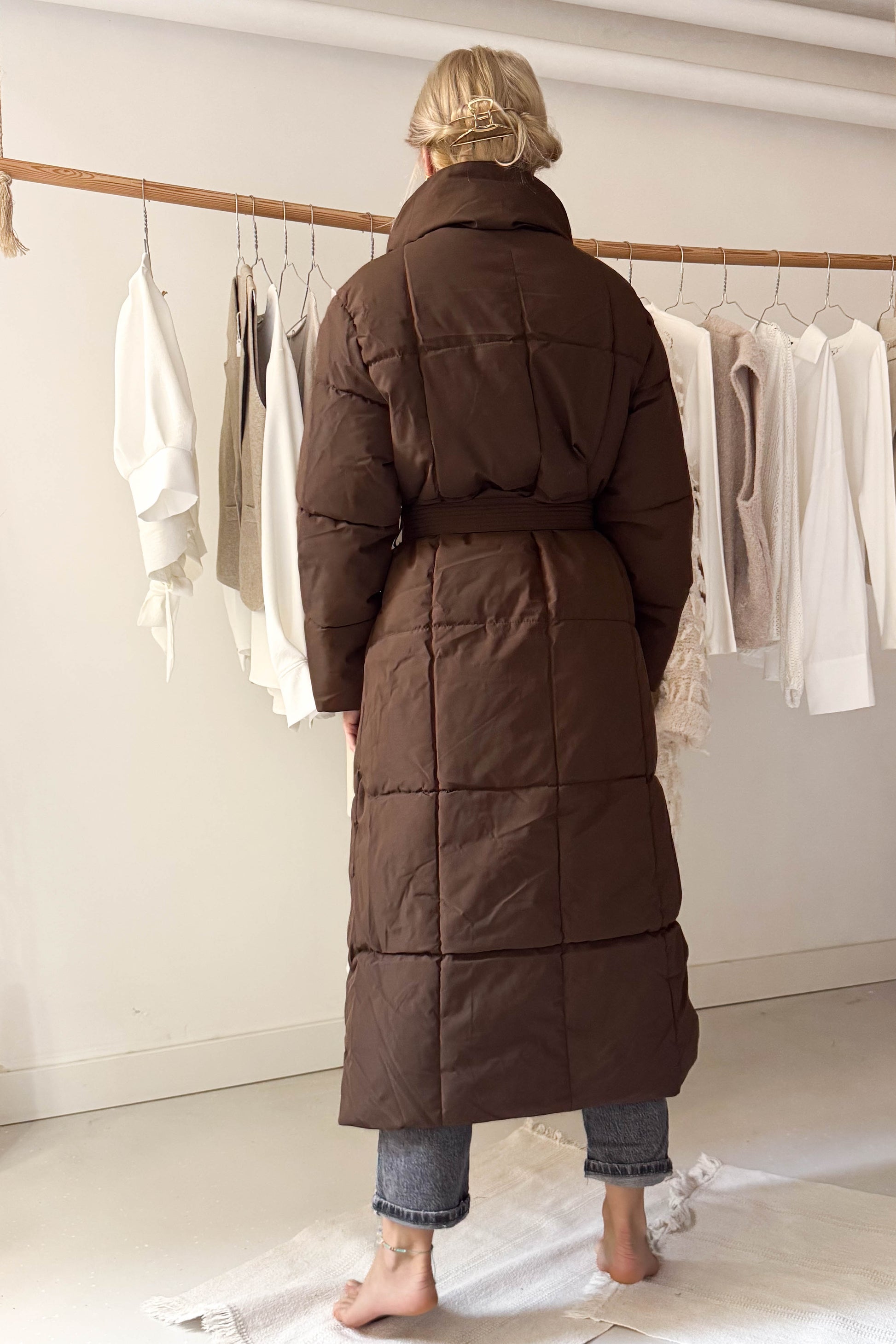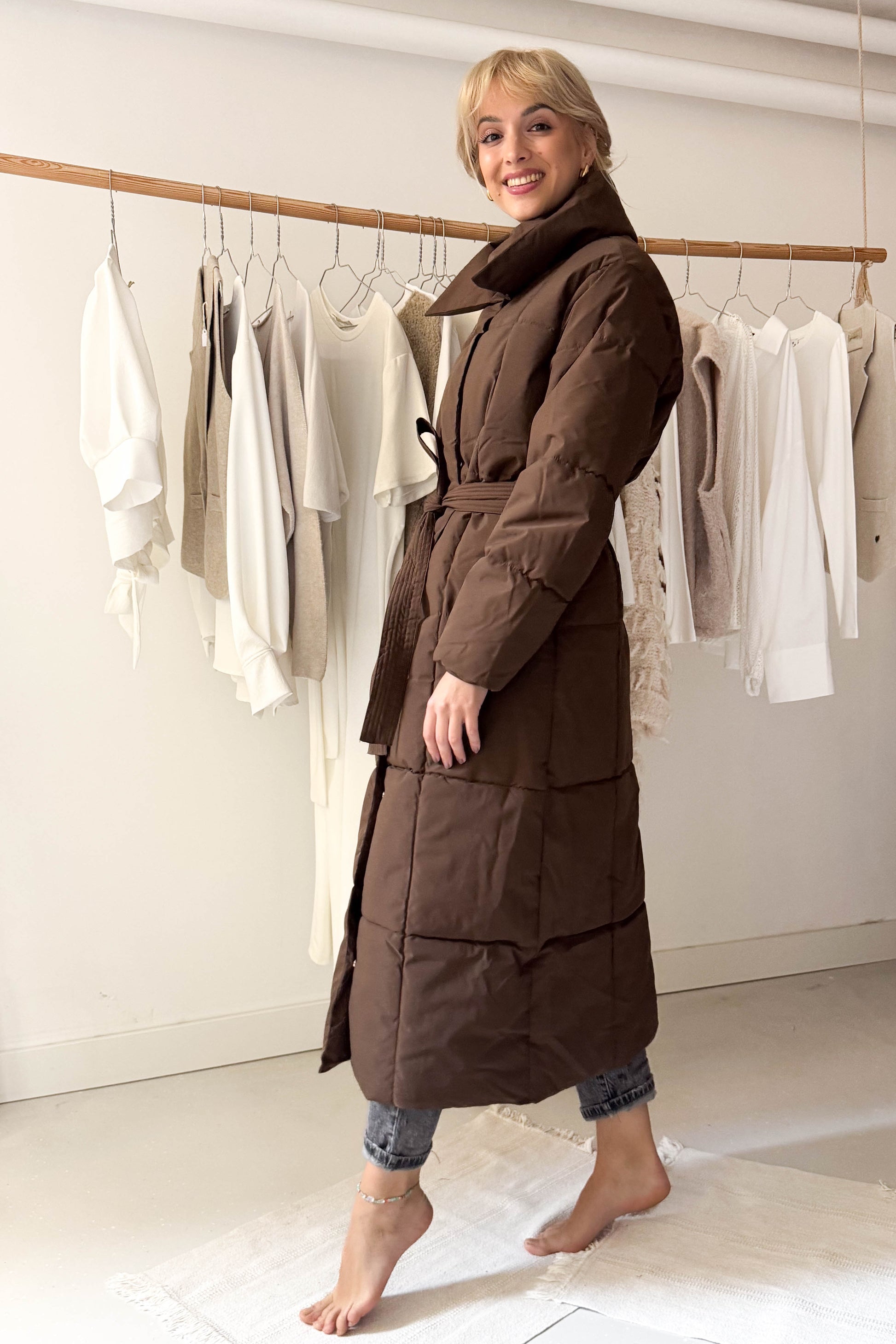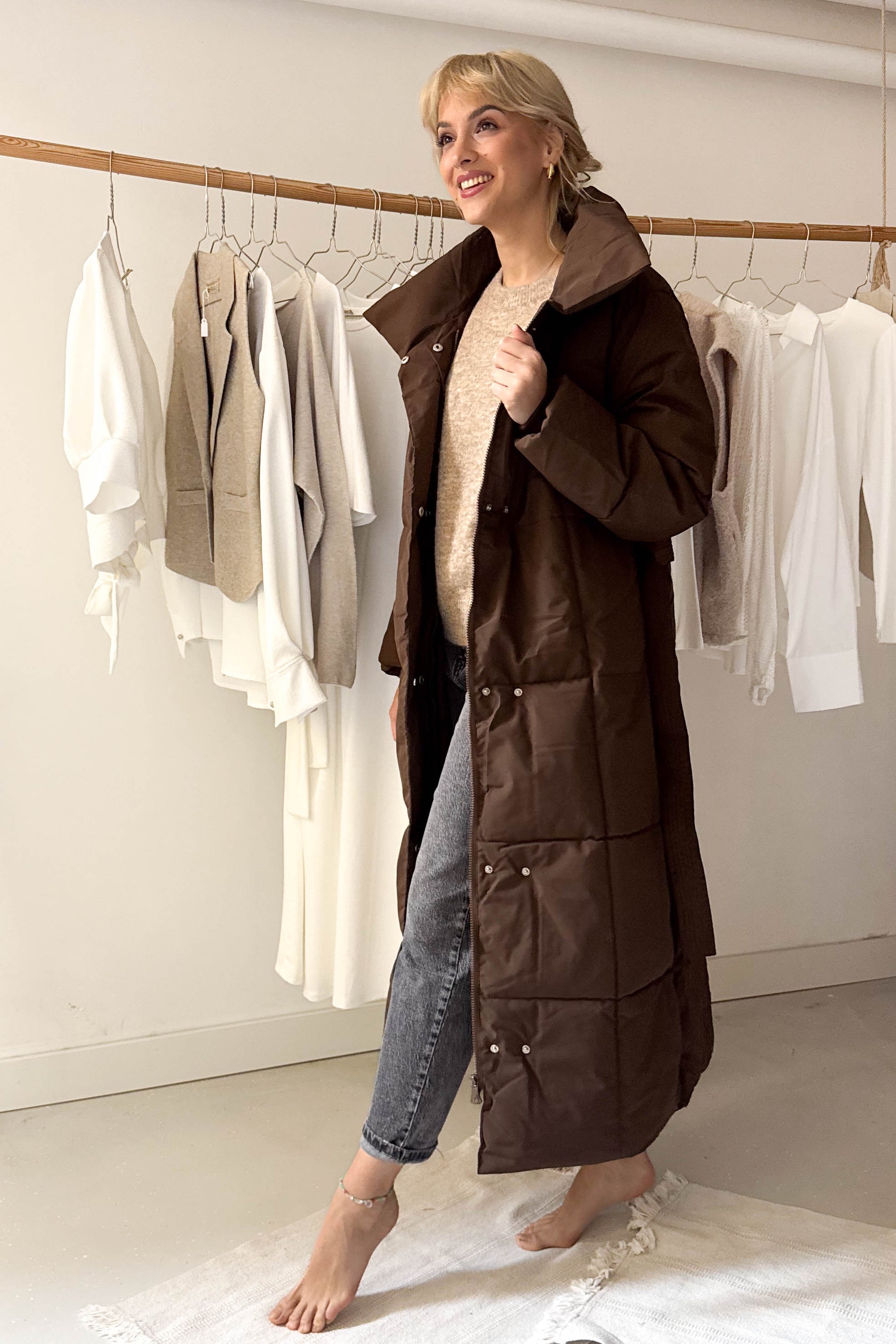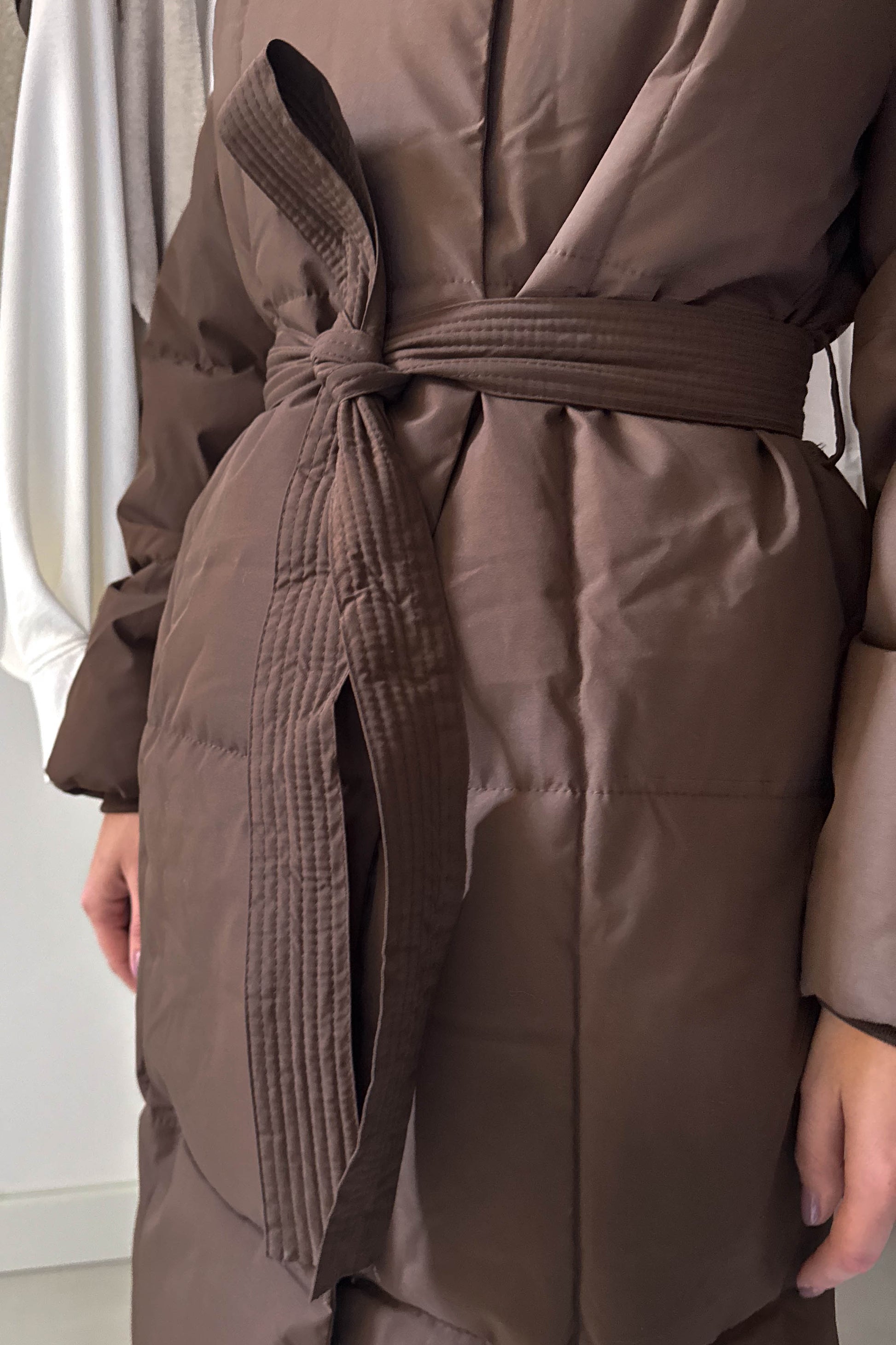 Hosszú pufikabát-mazsolabarna