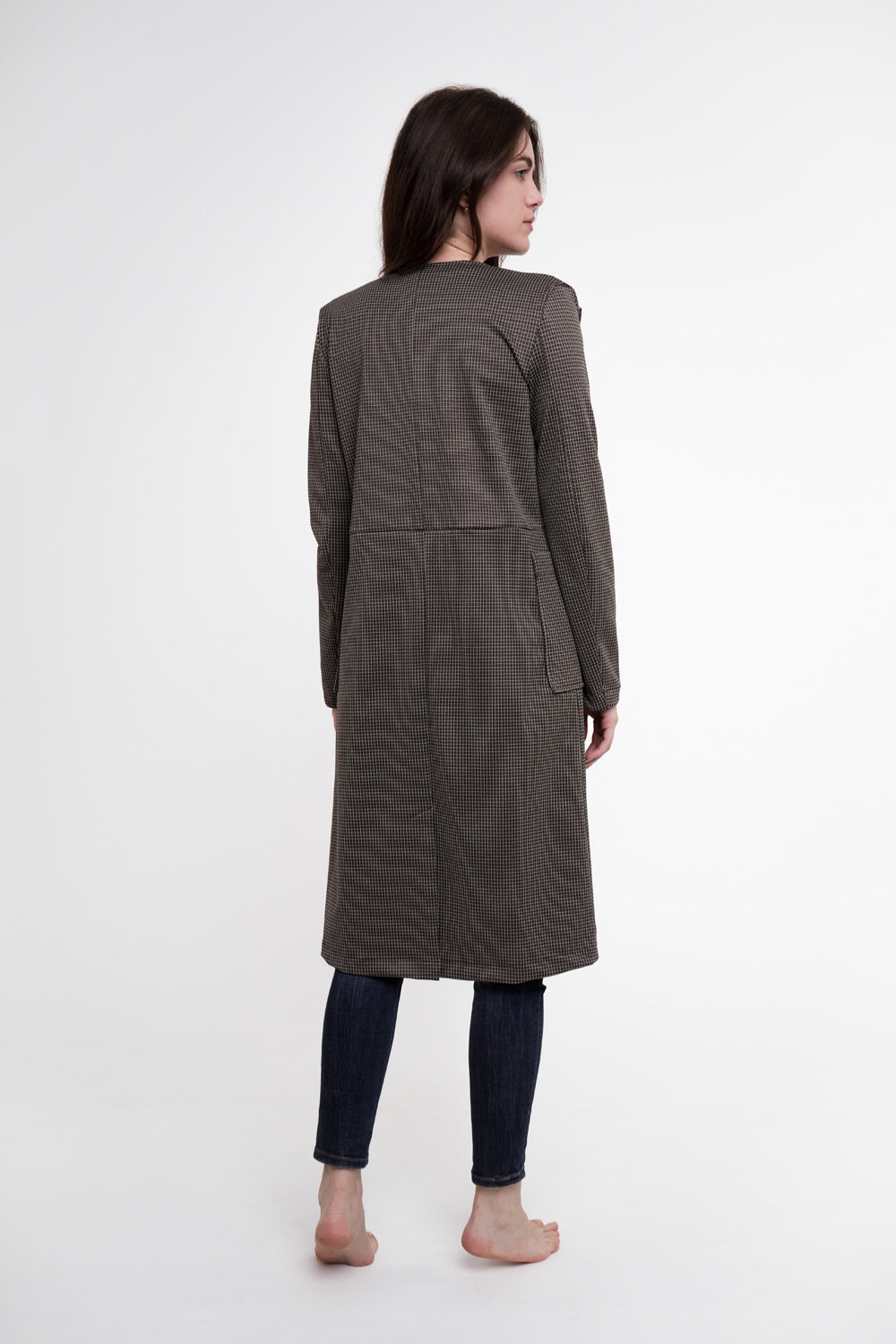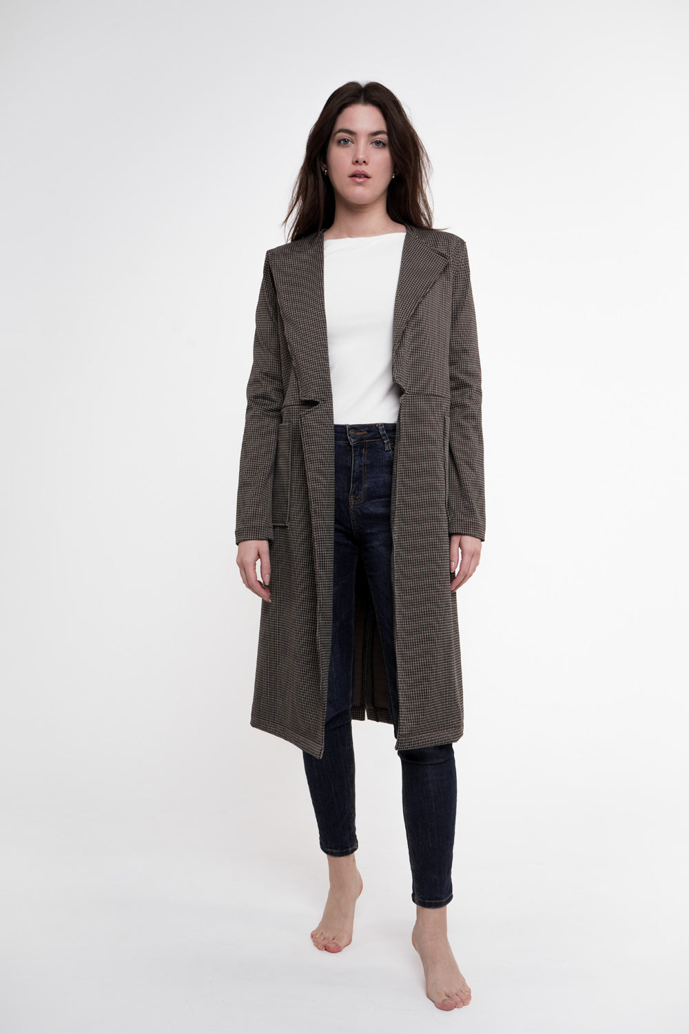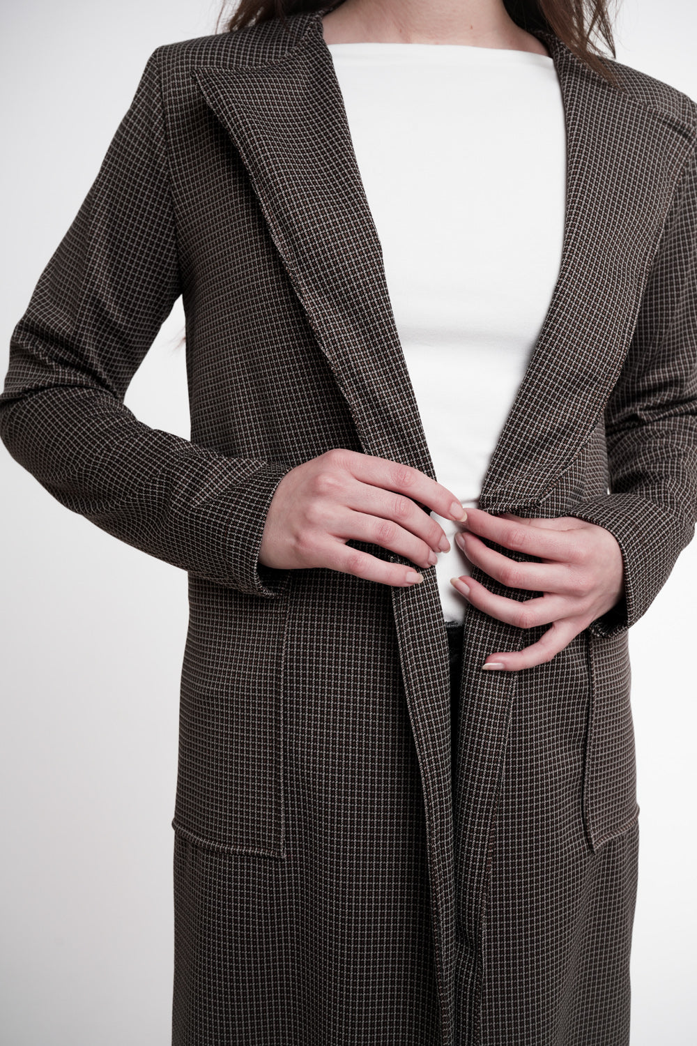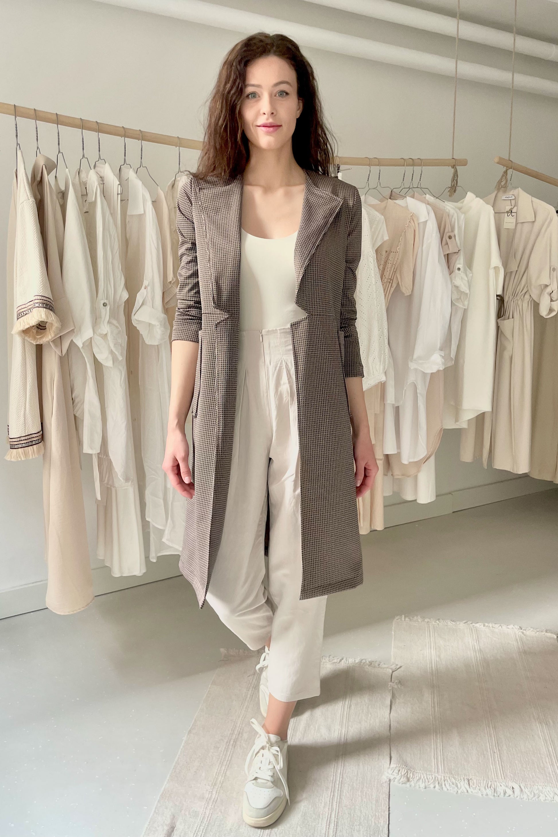 Hosszított, egyenes szabású blézer/kabát. Remek tavaszi darab inghez, farmerhoz. Apró kockás mintájú anyag, 50% viszkóz 50% poliészter. Kényelmes, csinos viselet. Az S méret 36-38-as konfekcióméretnek felel meg. Gépben mosható 30 fokon. A modellek 177 és 170 cm magasak.