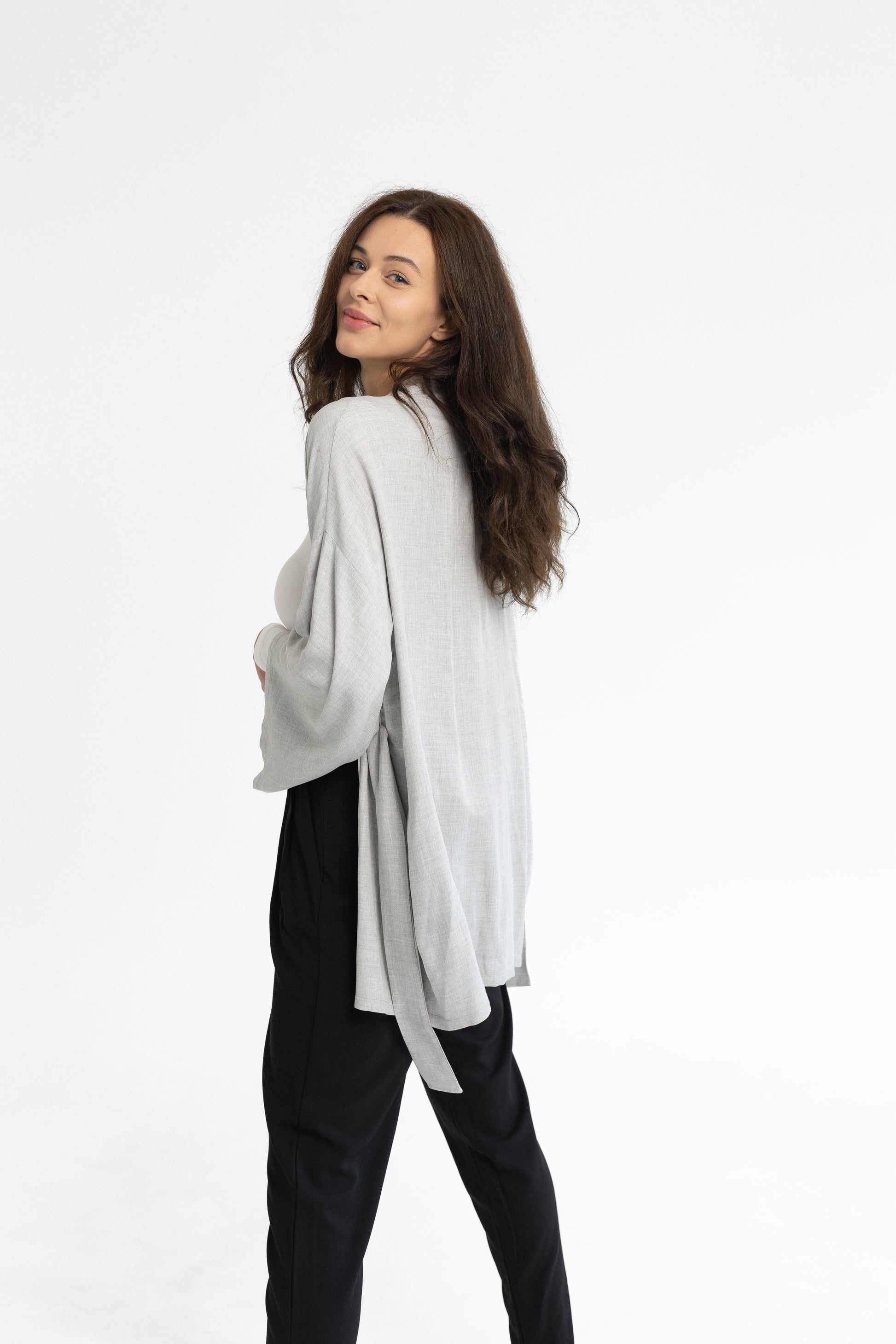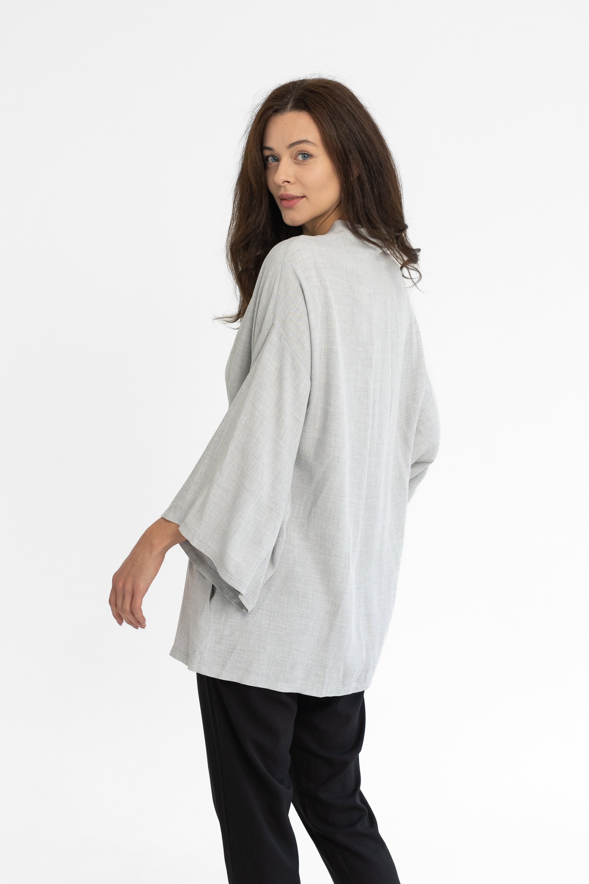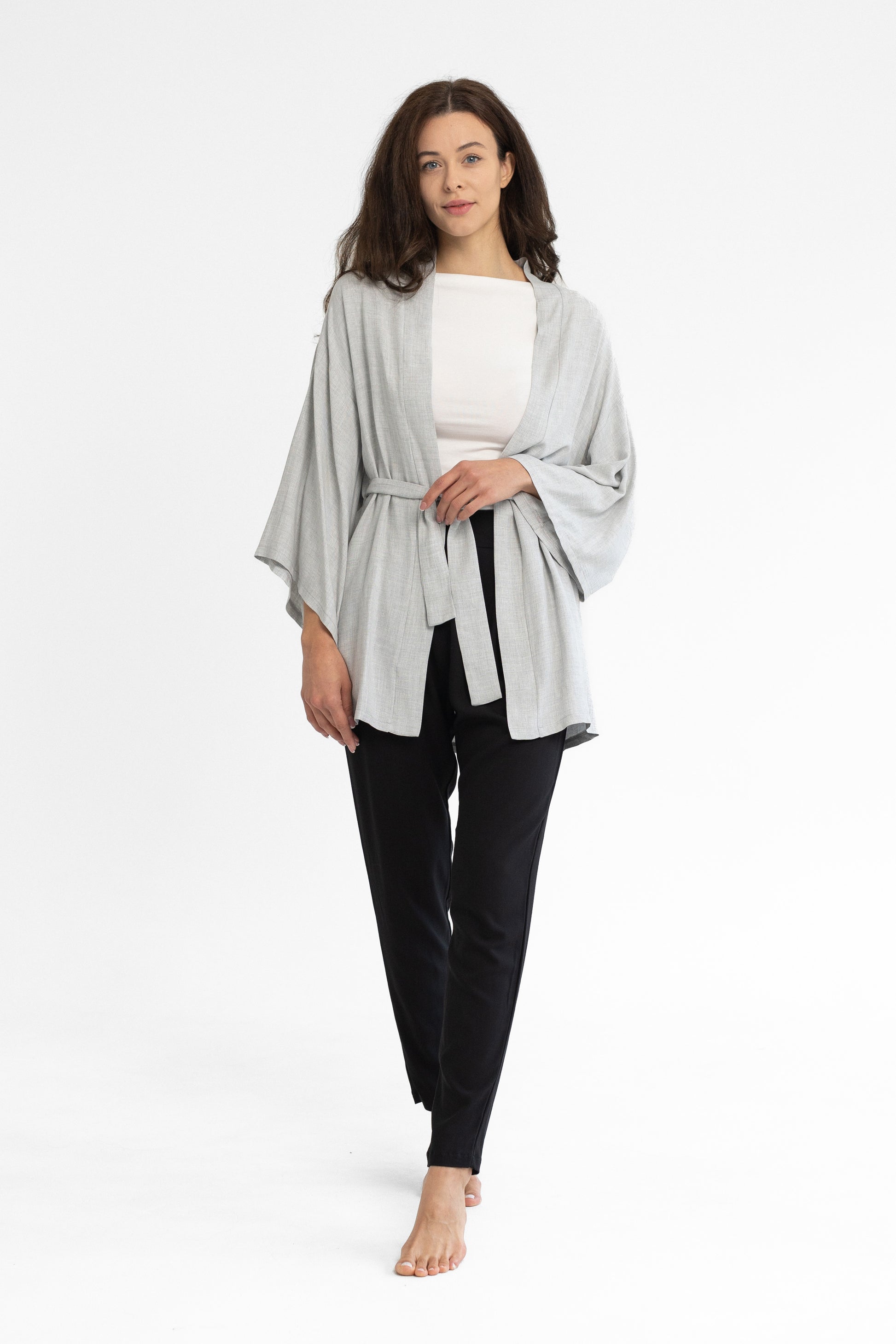 100% viszkóz összetételű puha, lágy esésű flockon szövet.A szövés szerkezete finoman látszik a világosabb szálak áttűnésének köszönhetően. Laza kimono stílusú szabás, bővülő ujjakkal, derékon belül futó övmegoldással, melynek köszönhetően, hátul akkor is megmarad lenge esése, ha elöl meg van kötve a felsőrész. Onesize méret 34-40-es méretig ajánljuk. Gépben 30 fokon mosható. A modell 177 cm magas.