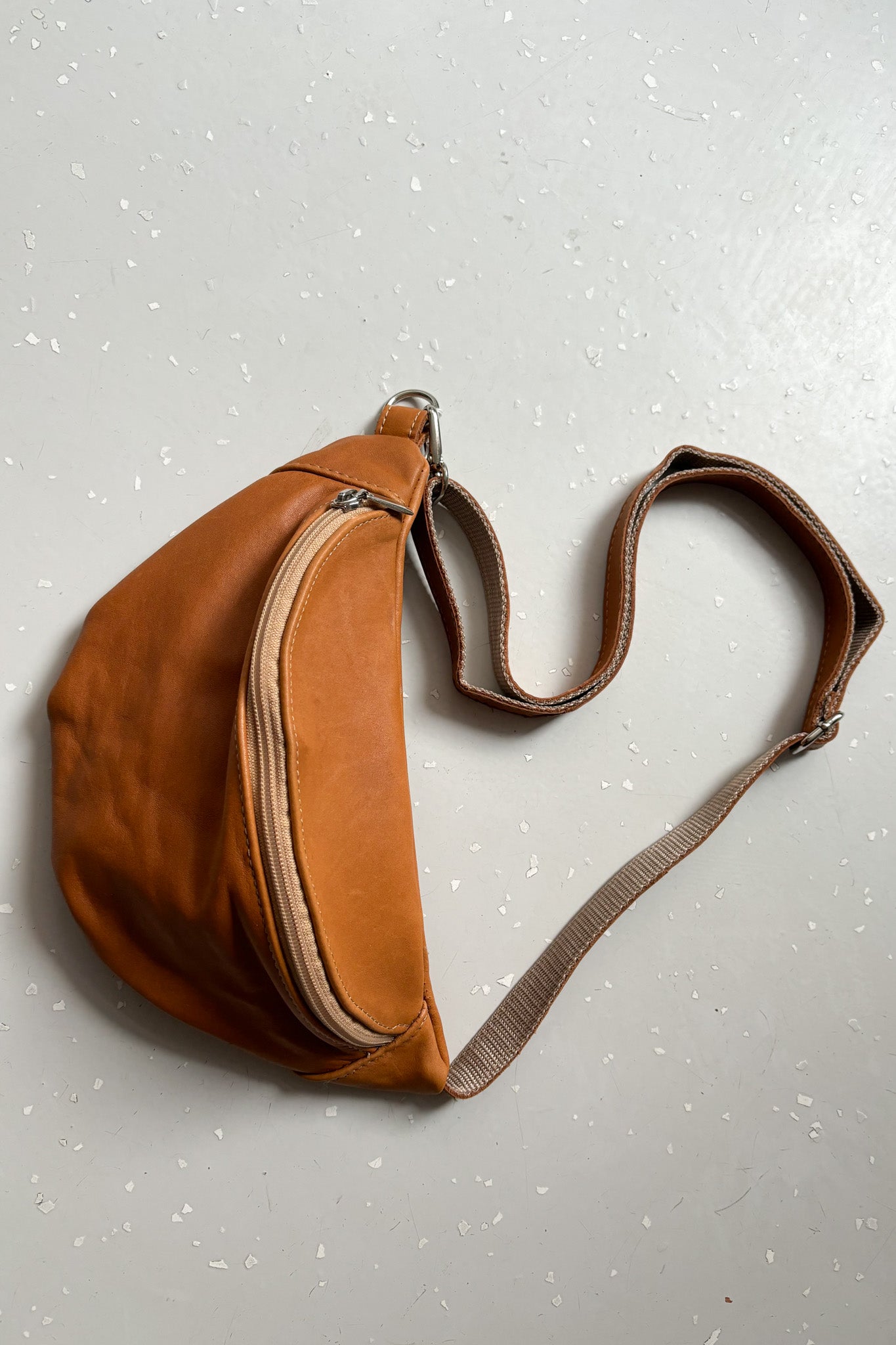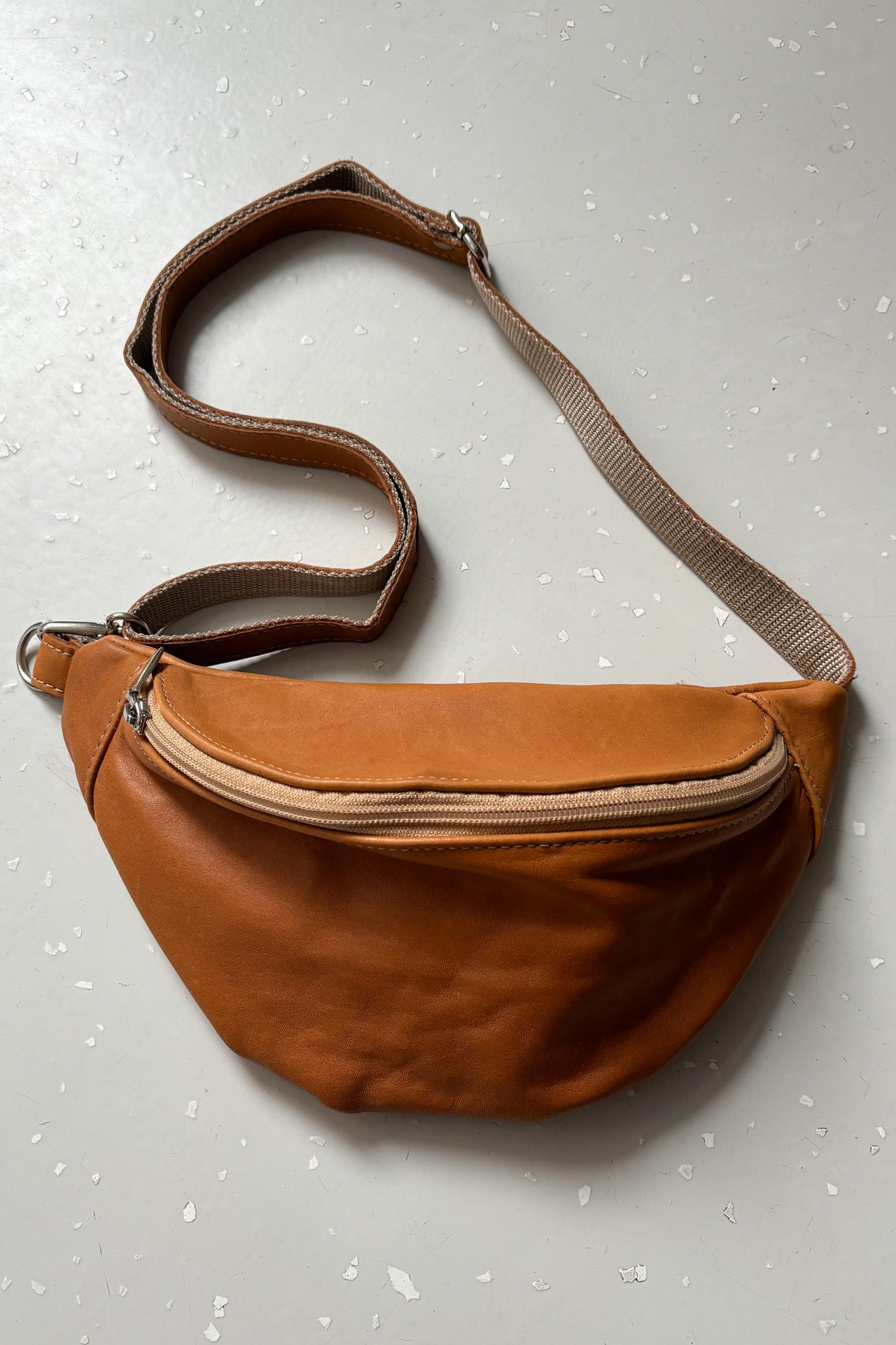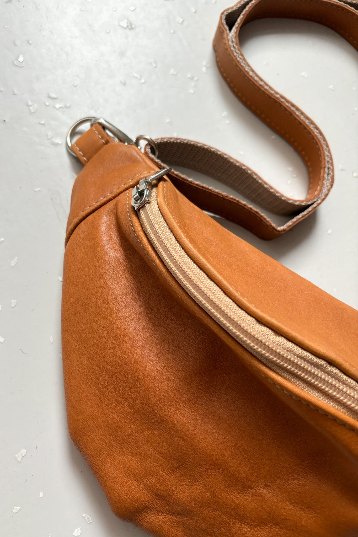 Kisméretű, kézzel készített táska marhabőrből. Állítható pánttal. Fakkjai cipzárral záródnak.
